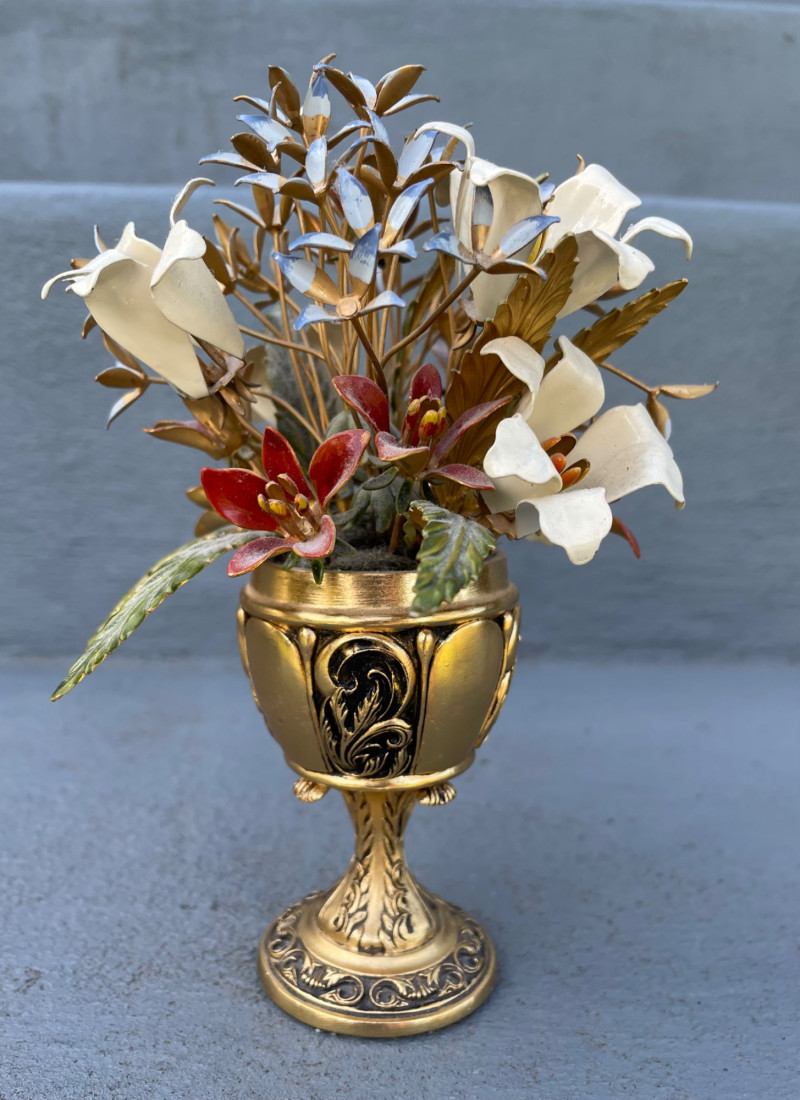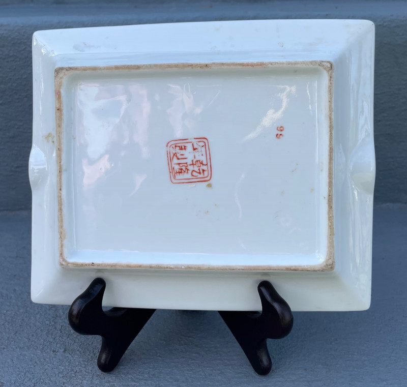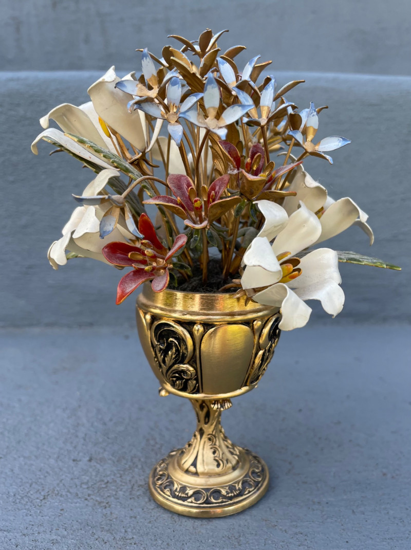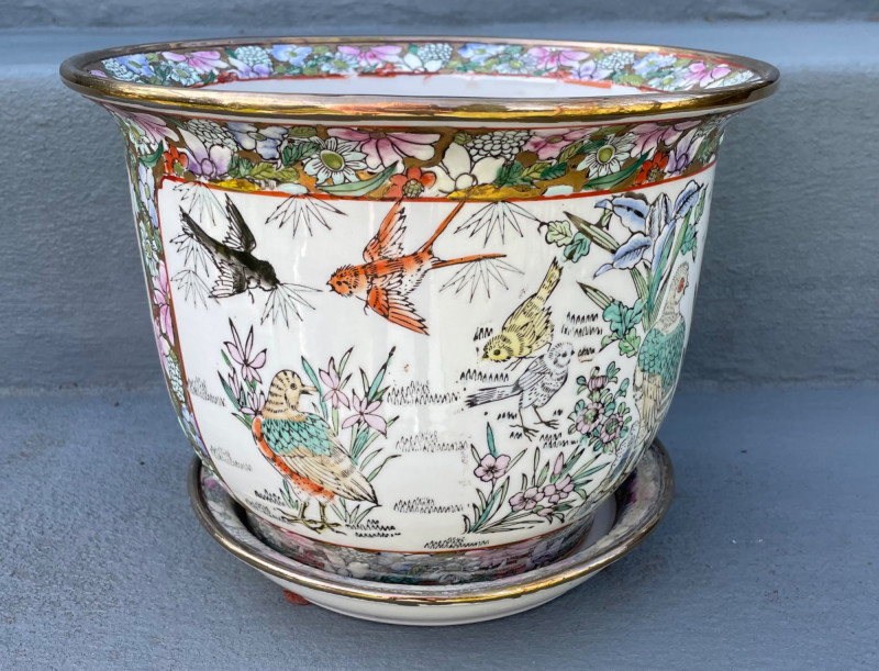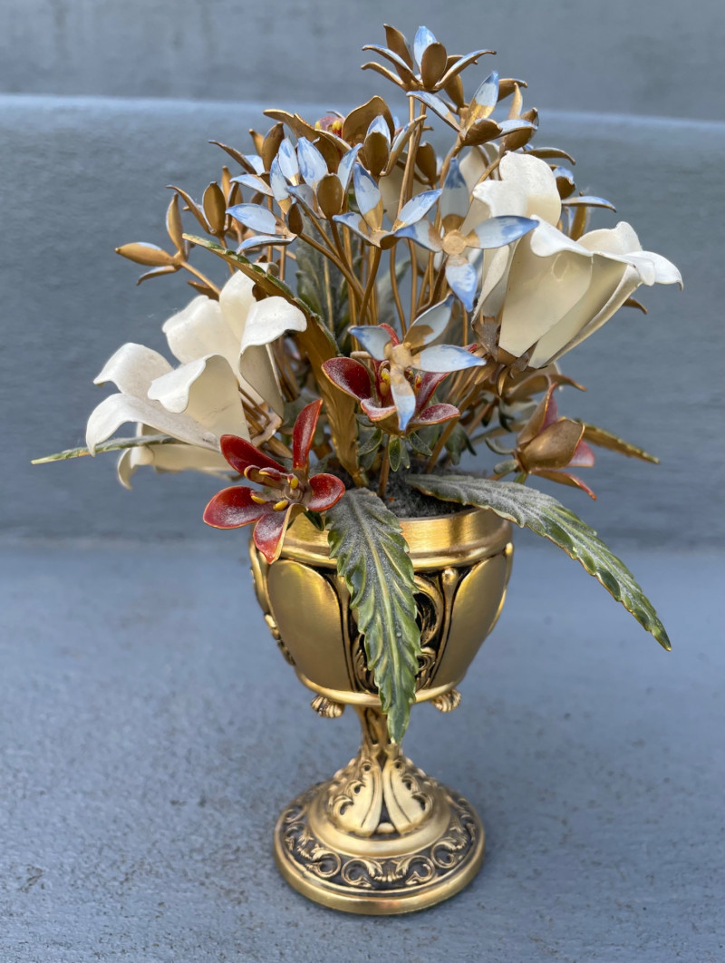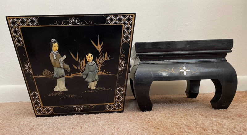 Eclectic mix of Asian art pieces and a Russian-style floral sculpture, arranged on steps for display: Asian Lacquered Panel on Stand (Top) Rectangular Porcelain Plate (Bottom Left) Large Porcelain Planter (Center) Russian-Style Floral Sculpture (Bottom Right) Chinese Black Lacquer Planter 12”x17” Chinese Rose Medallion Ceramic Ashtray 61/2x73/4”. 1950-1960’s Porcelain Chinese Planter w/saucer. 10”x8” Imperial Russian Faberge Bouquet 24k Gold and hand-enameled sculpture ON THESE PIECES, PLEASE BRING STRONG HELP, THERE WILL BE NO ONE HERE TO HELP YOU.Key Elements