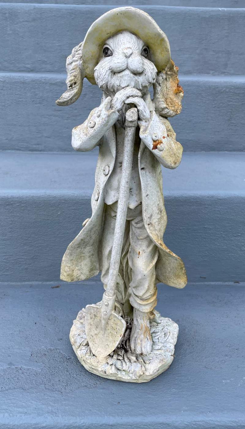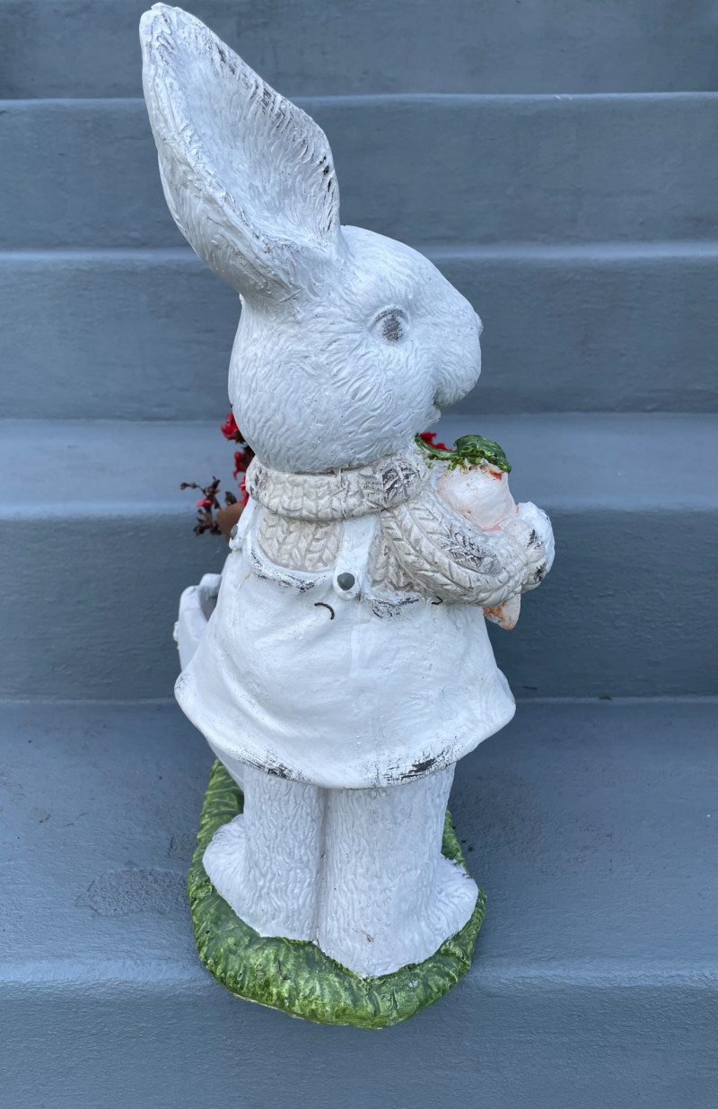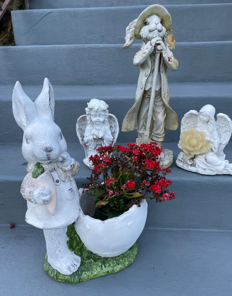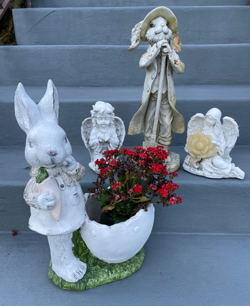 Size from 9” to 19” Charming collection of whimsical resin yard art pieces arranged on outdoor steps. Tall Rabbit Figurine: Two Angel Statues: