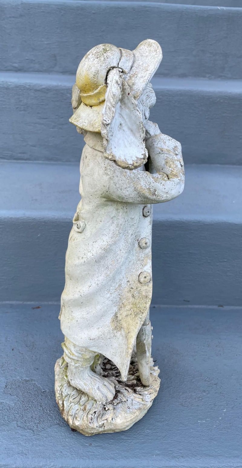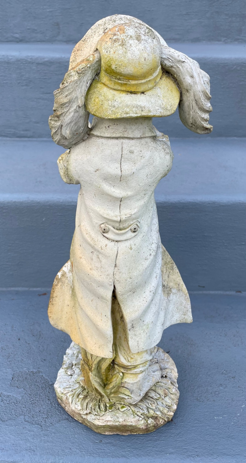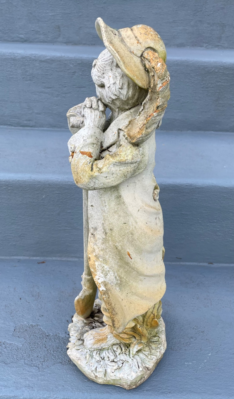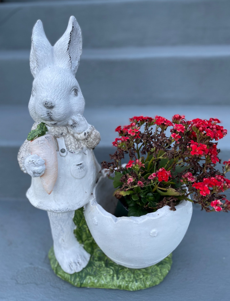Size from 9” to 19” Charming collection of whimsical resin yard art pieces arranged on outdoor steps. Tall Rabbit Figurine: Two Angel Statues: