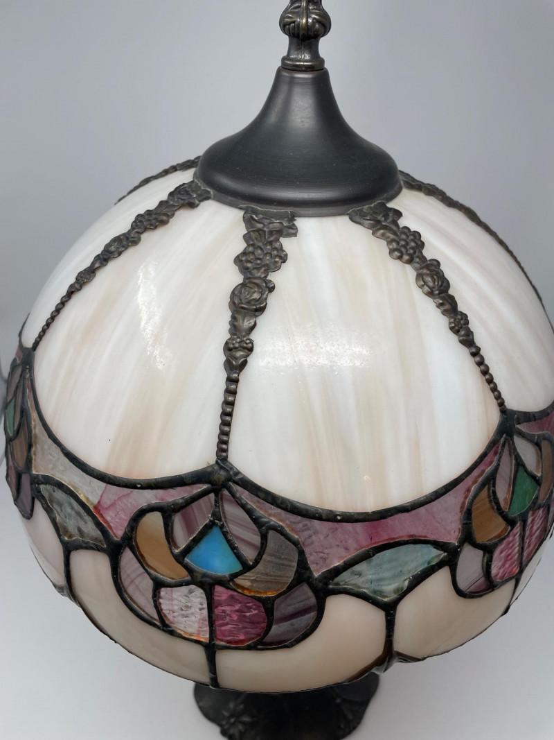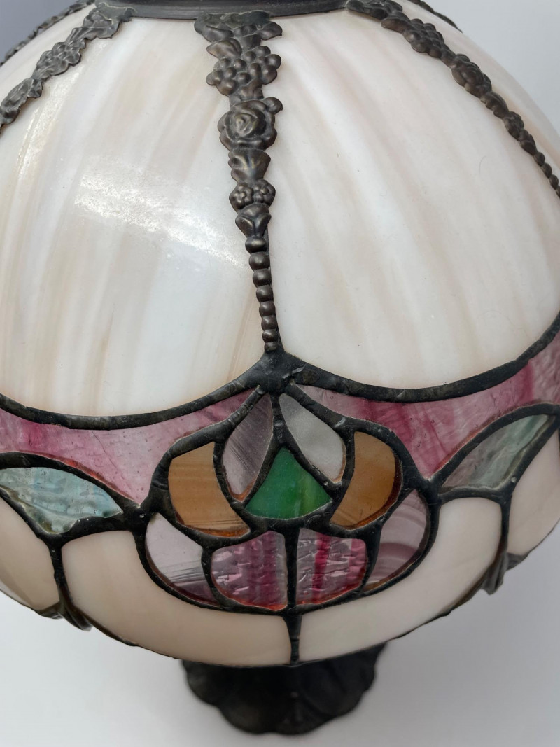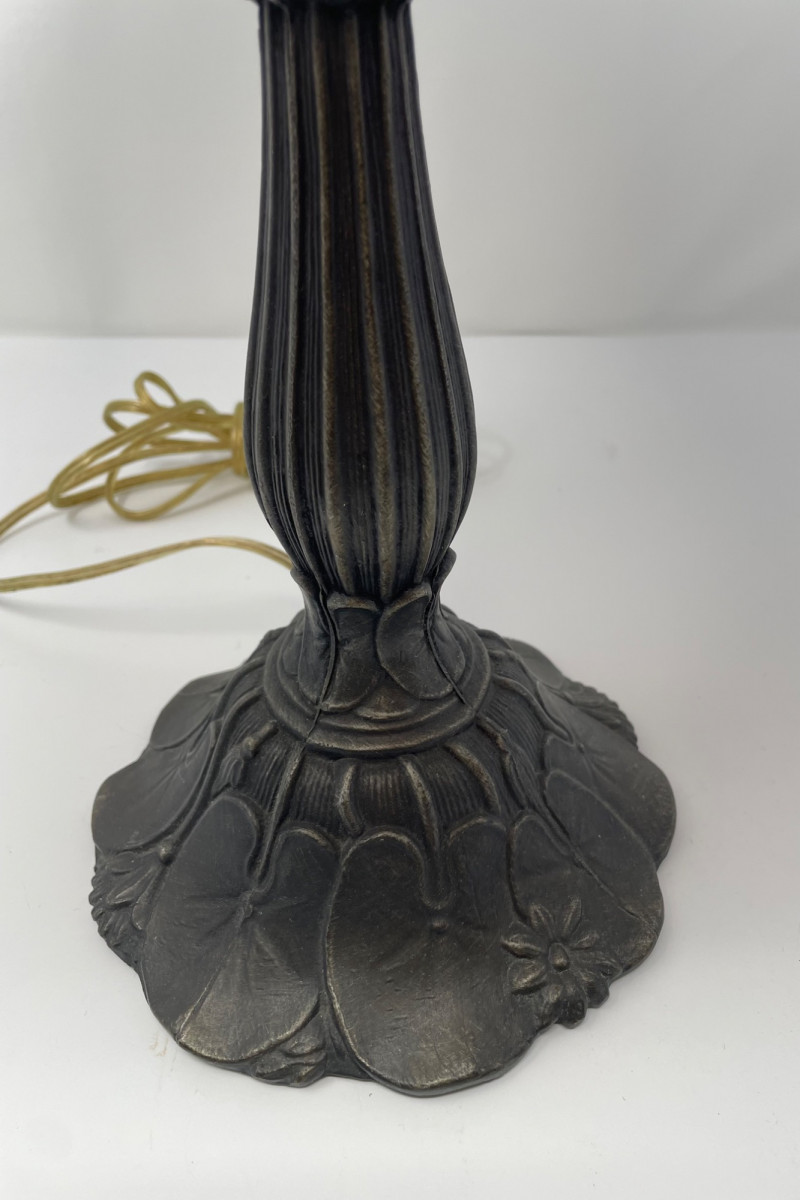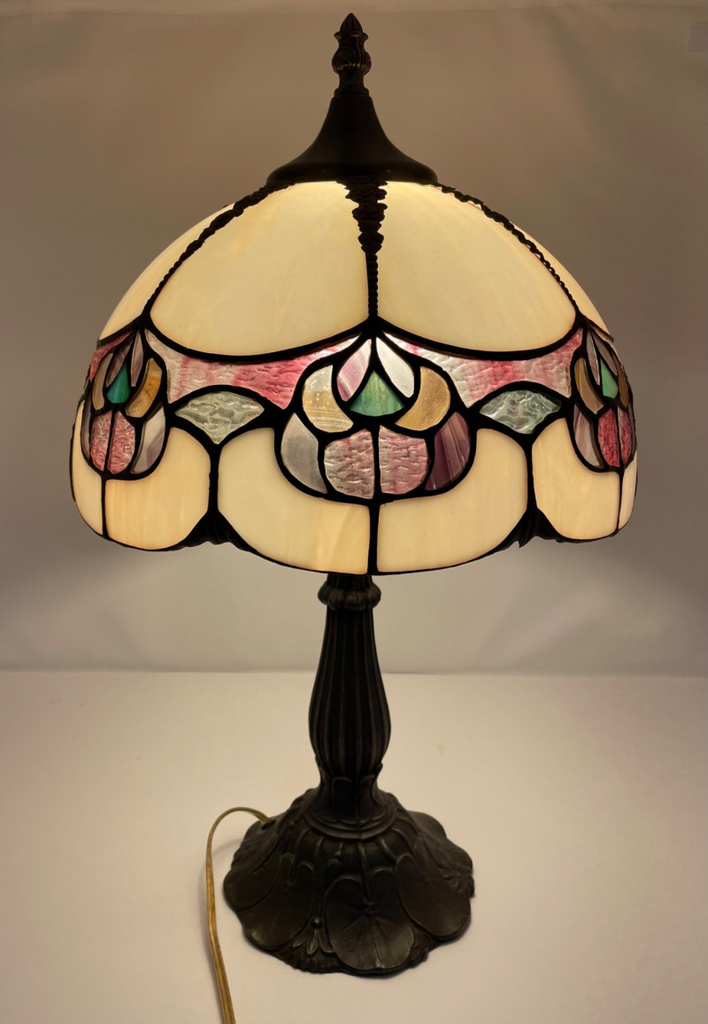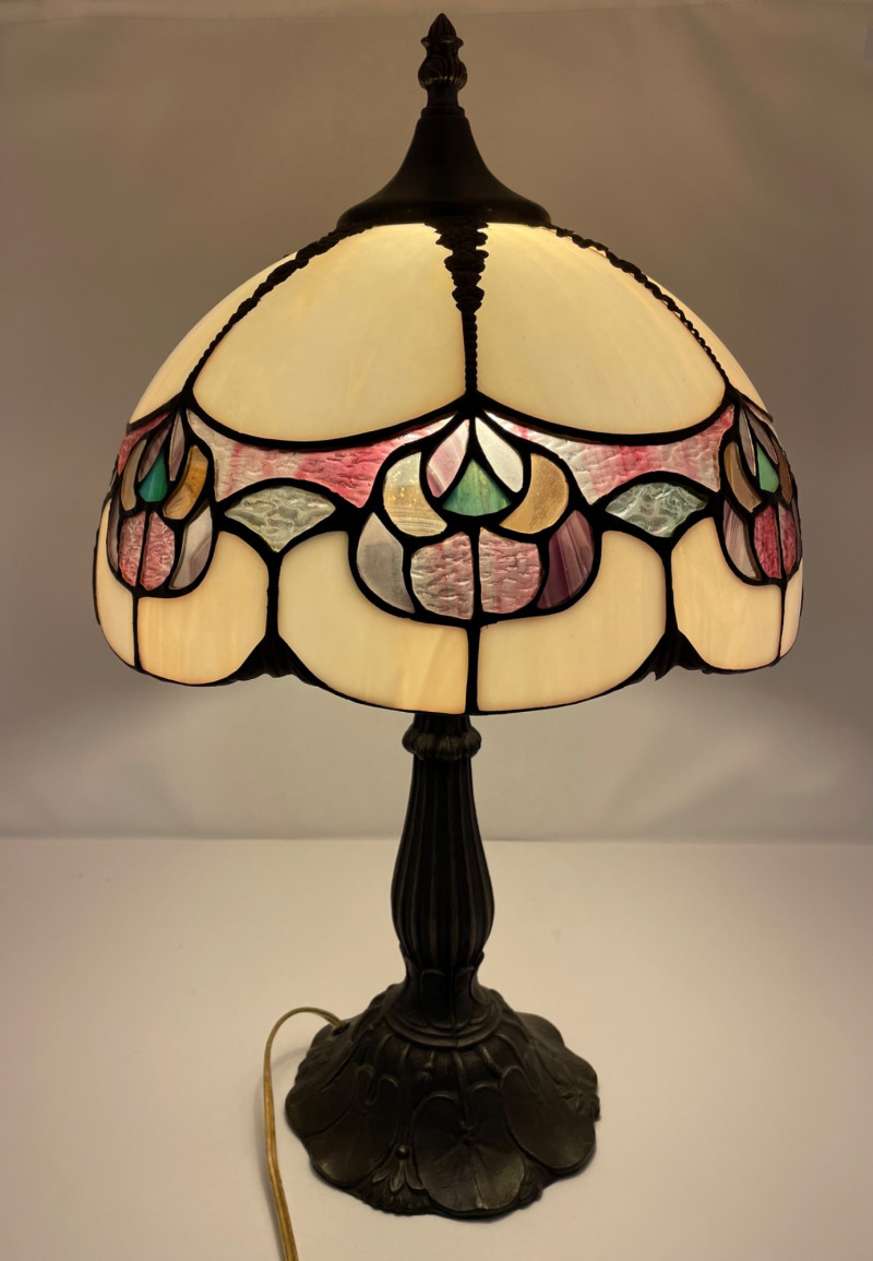 22" x 11 1/2” Pink Tiffany-style lamp, which is a decorative stained glass lamp inspired by the designs of Louis Comfort Tiffany. Here’s a detailed description: Shade: Base: Lighting: Cord: