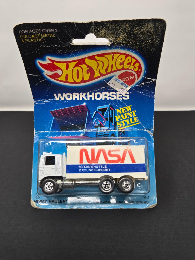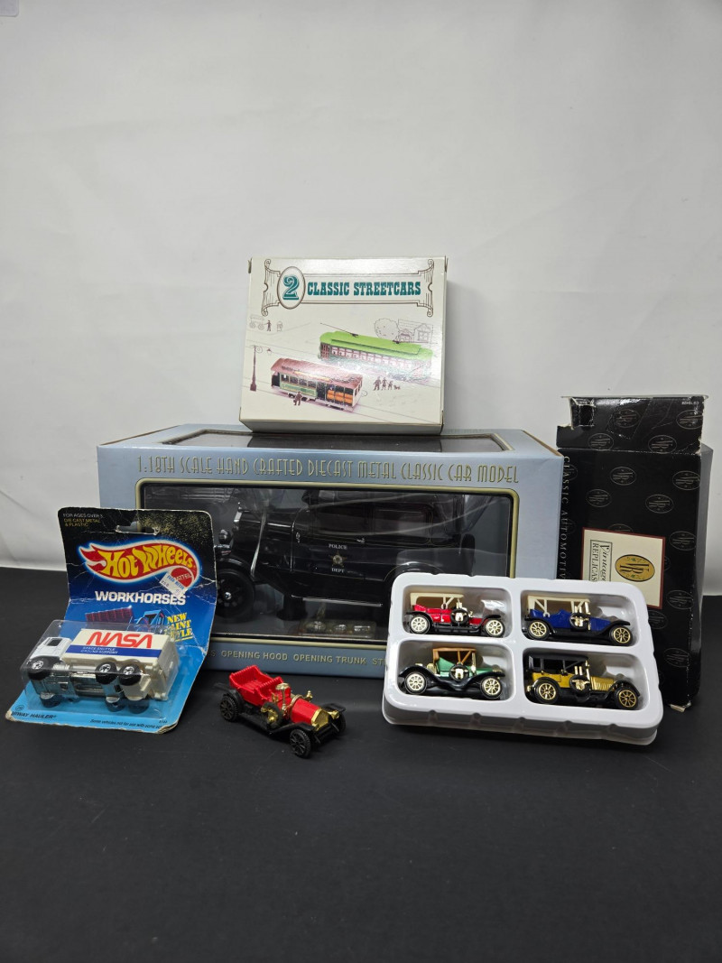 Hot Wheels Workhorses NASA Vehicle Two Classic Streetcars Set Large Die-Cast Police Car Model Tray of Five Vintage Cars Loose Red Vintage Car Mixed lot of collectible die-cast cars, some in original packaging and some loose.