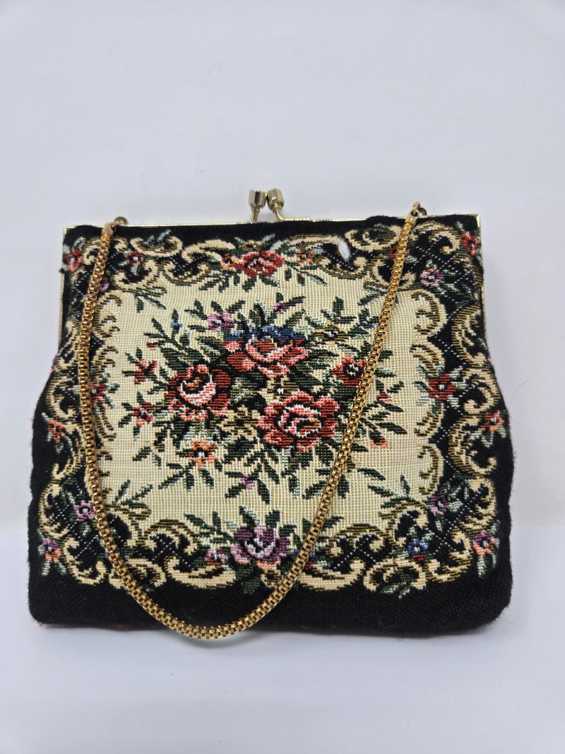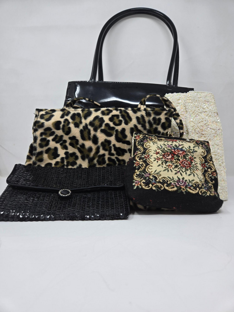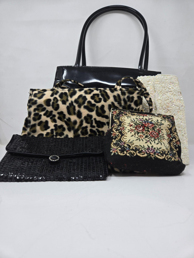 Five vintage handbags, each with a distinct style and material, but no visible brand markings. Back row (center): Middle row (left): Middle row (right): Front row (left): Front row (right):
