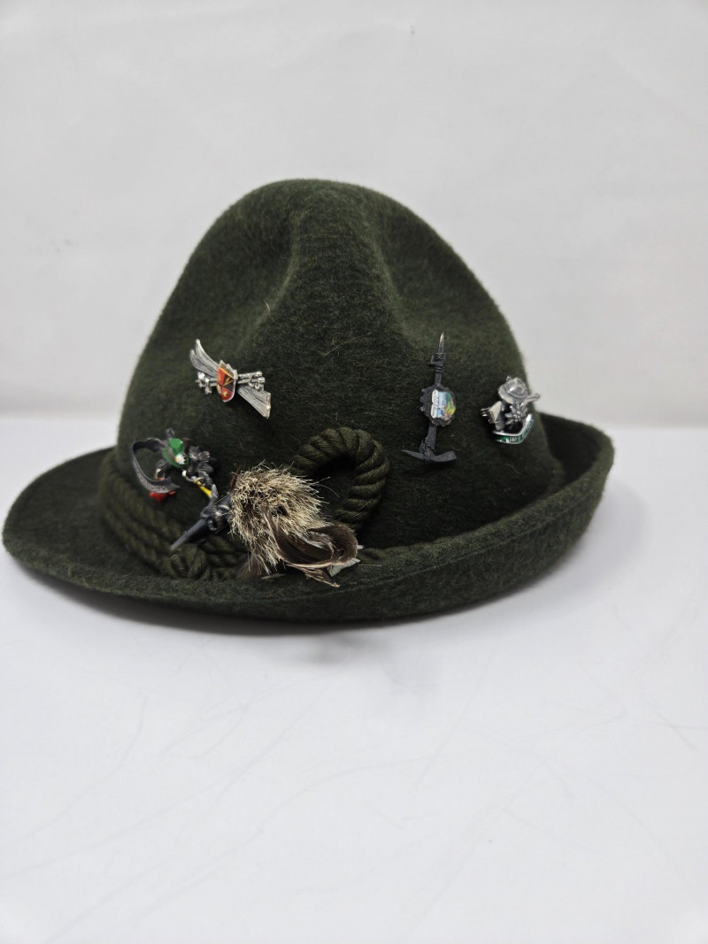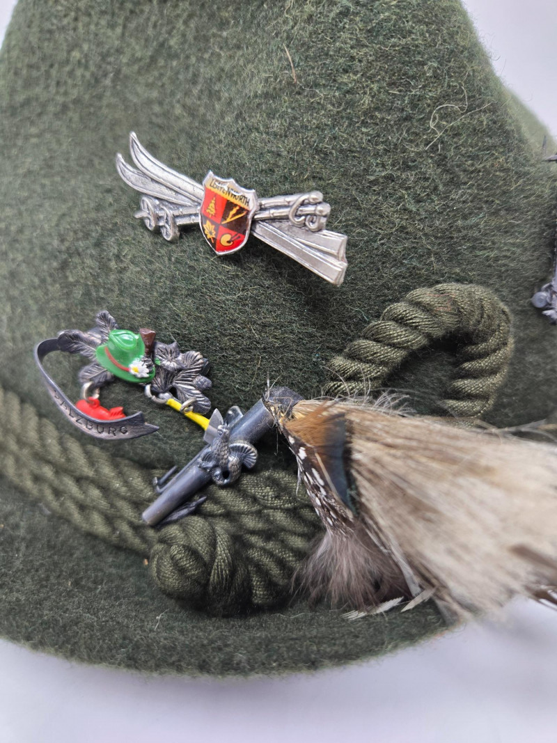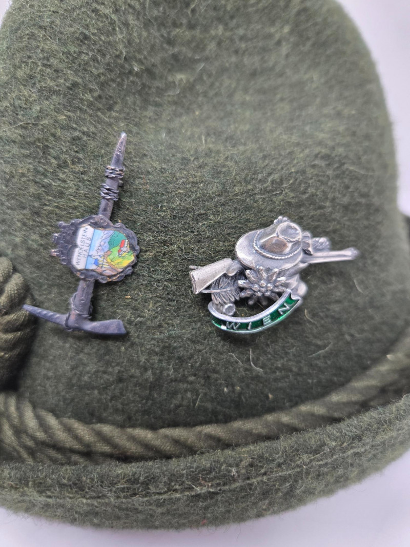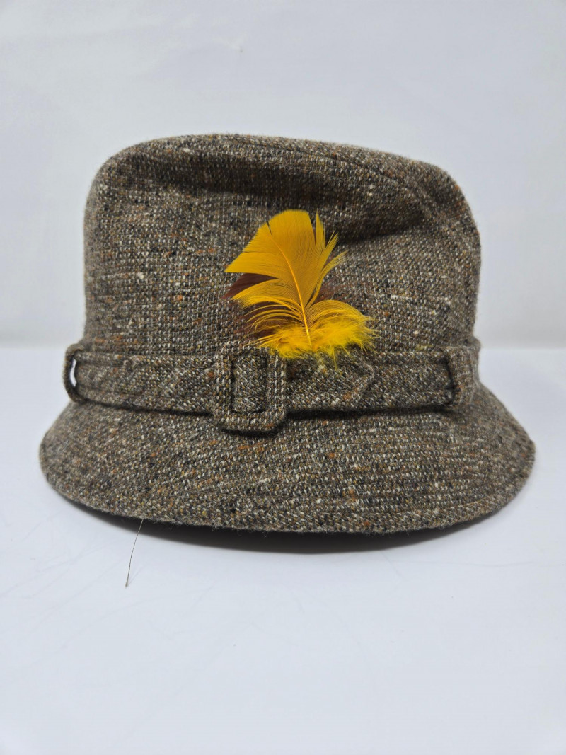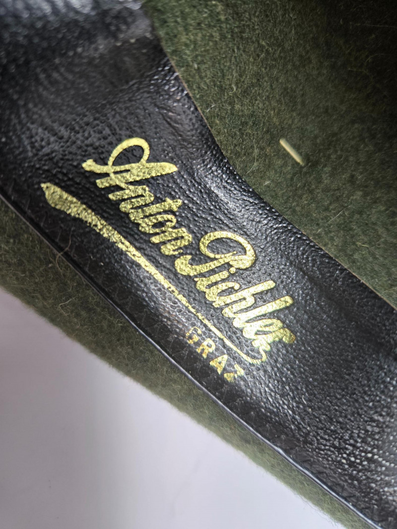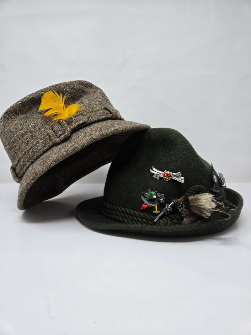 Two vintage men's hats, each with distinctive styles and embellishments: Left Hat (Dobbs) Right Hat (Anton Pichler)