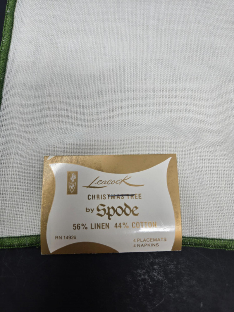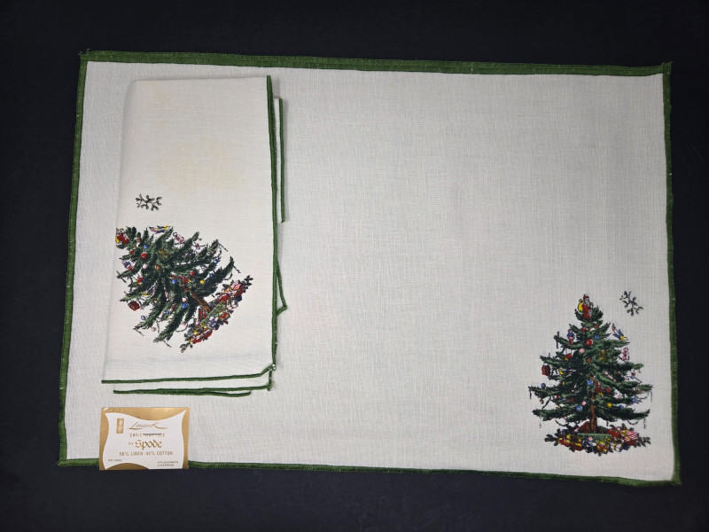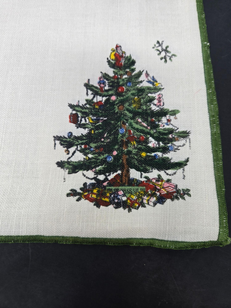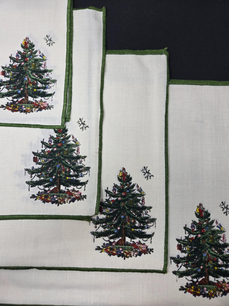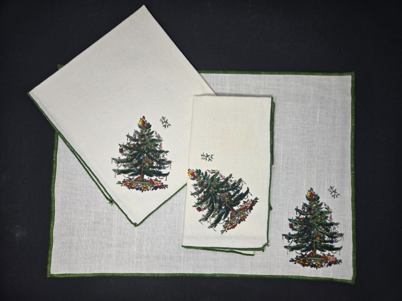 Spode Christmas linens, featuring the classic Spode Christmas tree design: Items Included: Design Details: These linens are collectible, especially in good condition and with some unused pieces.