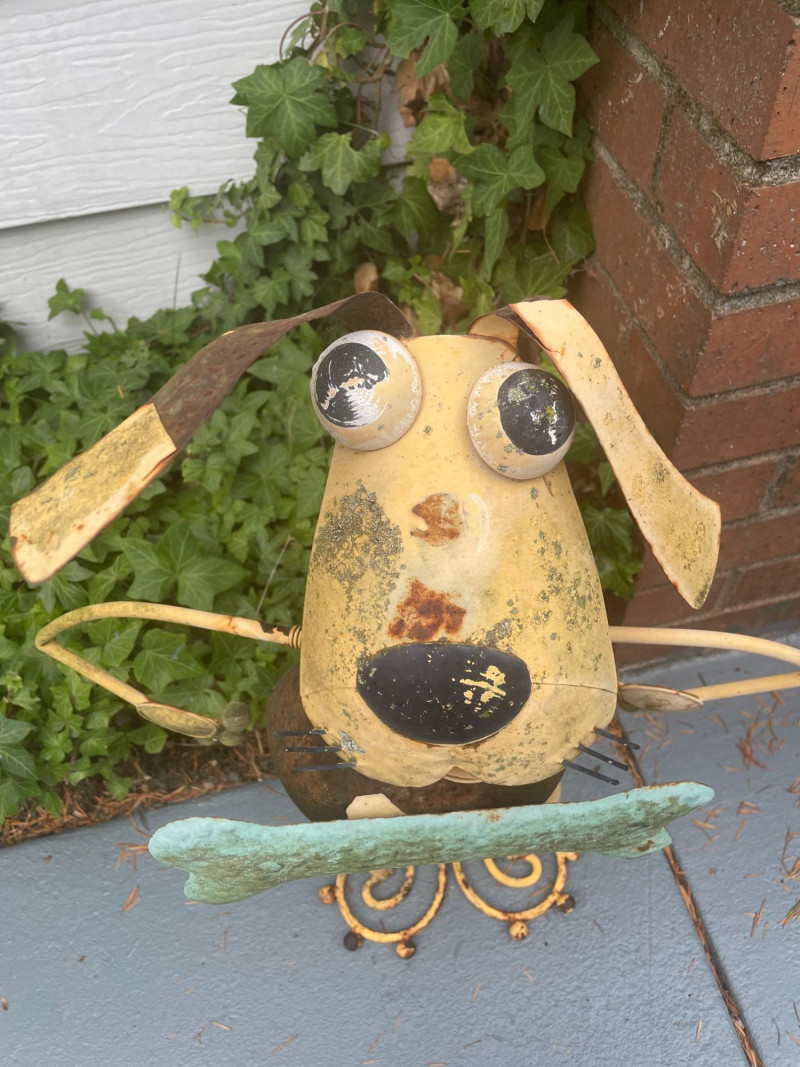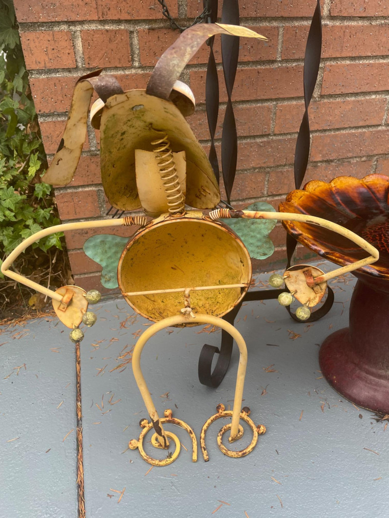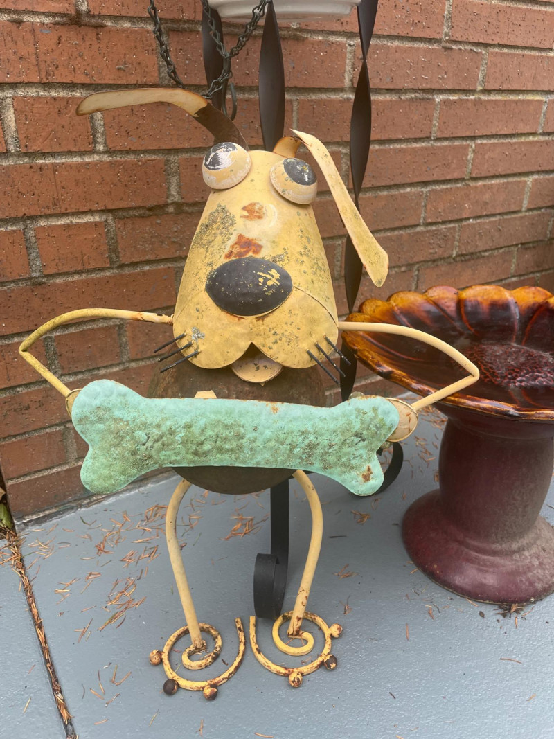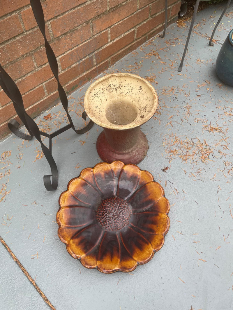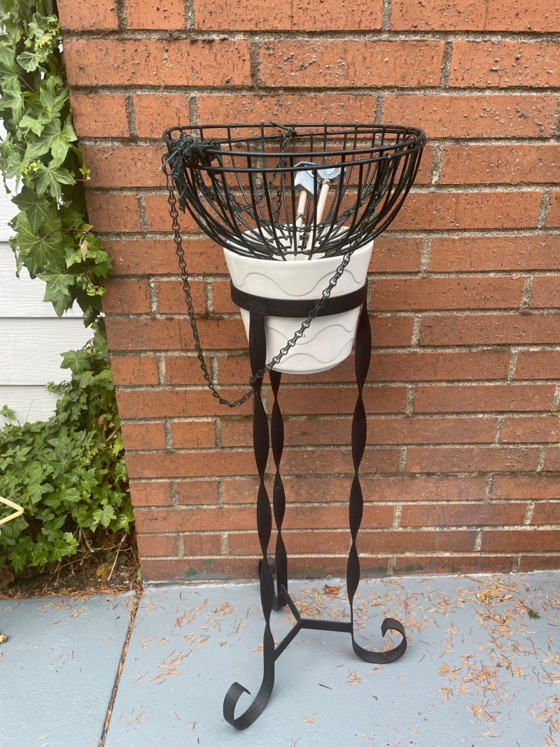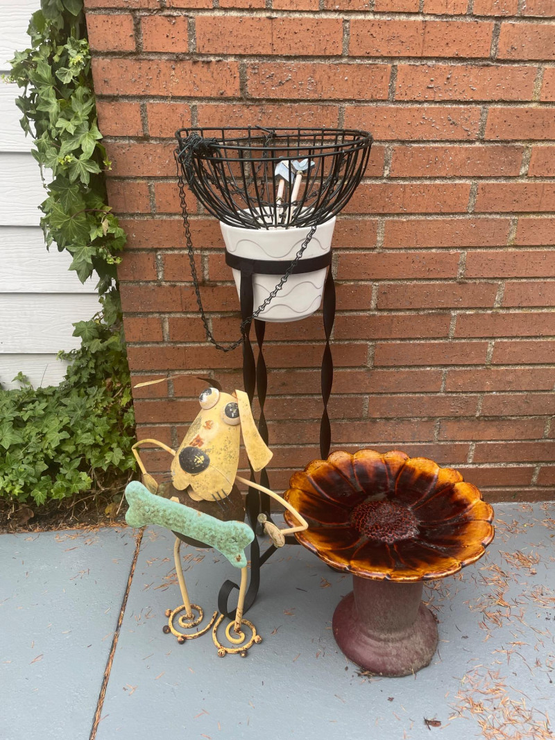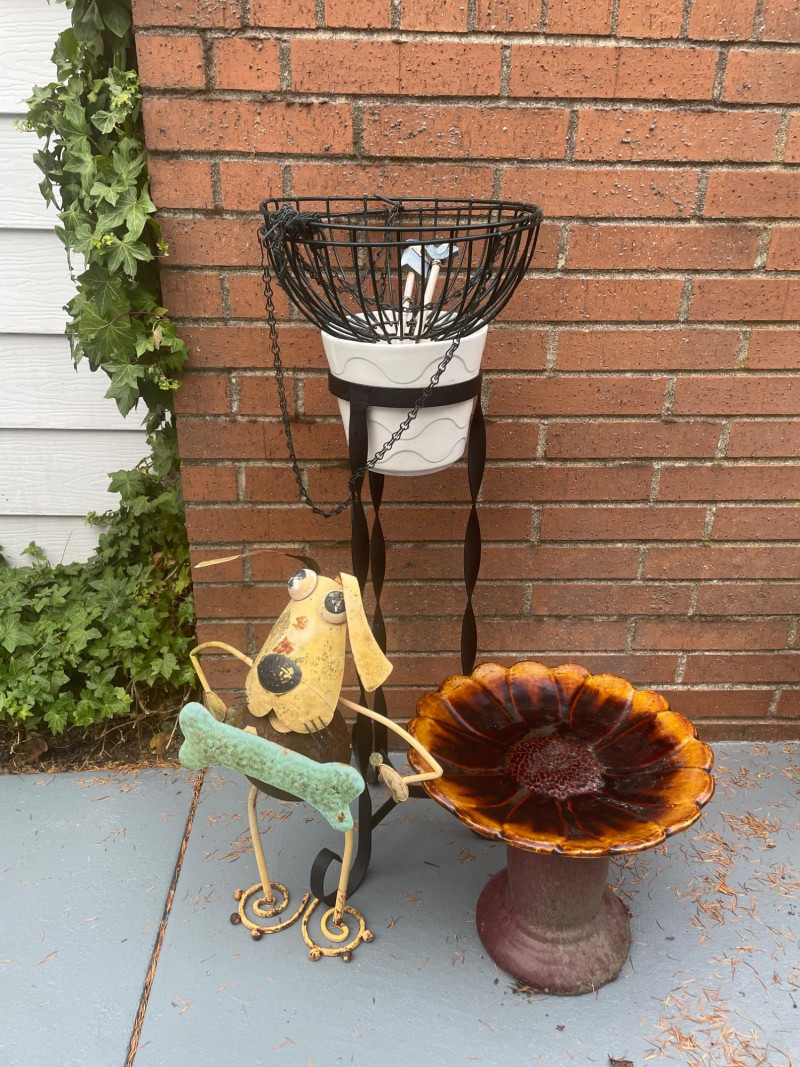 Lot # 65 - Ceramic Bird Bath, Rod Iron Planter and Puppy Yard Art
