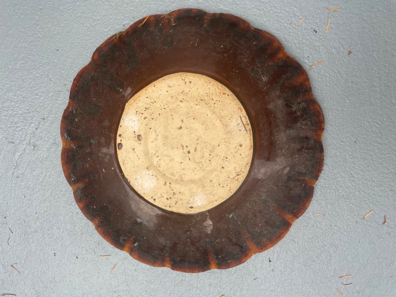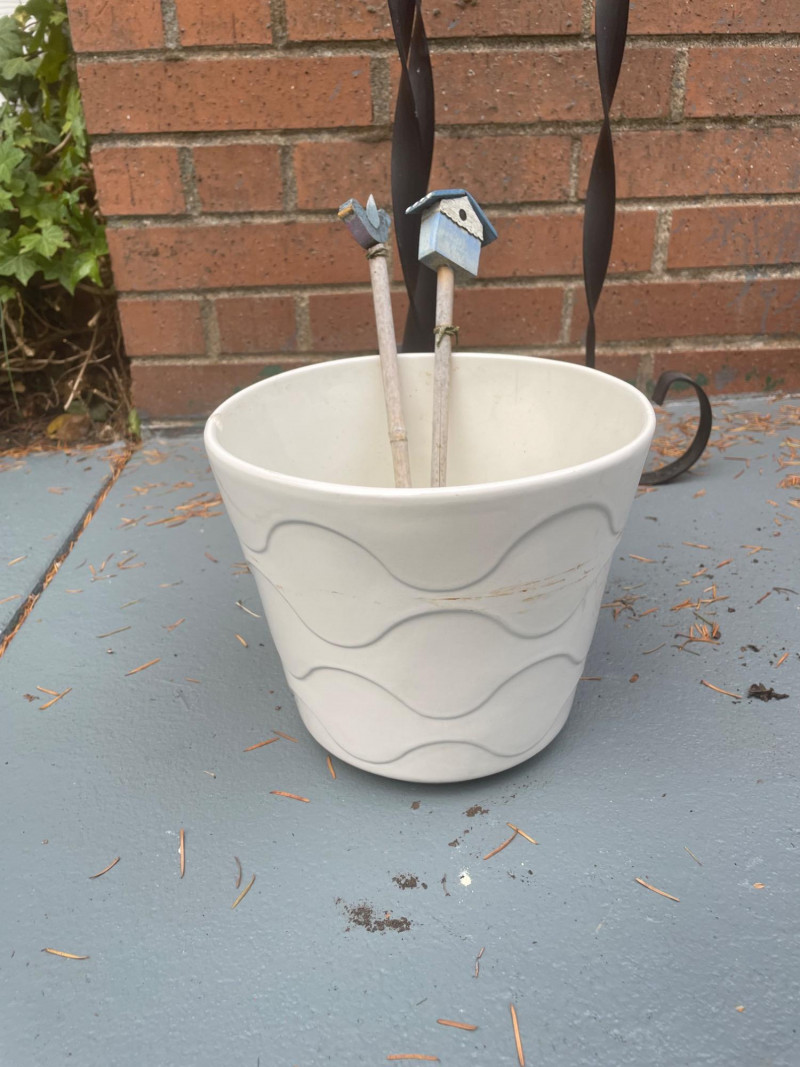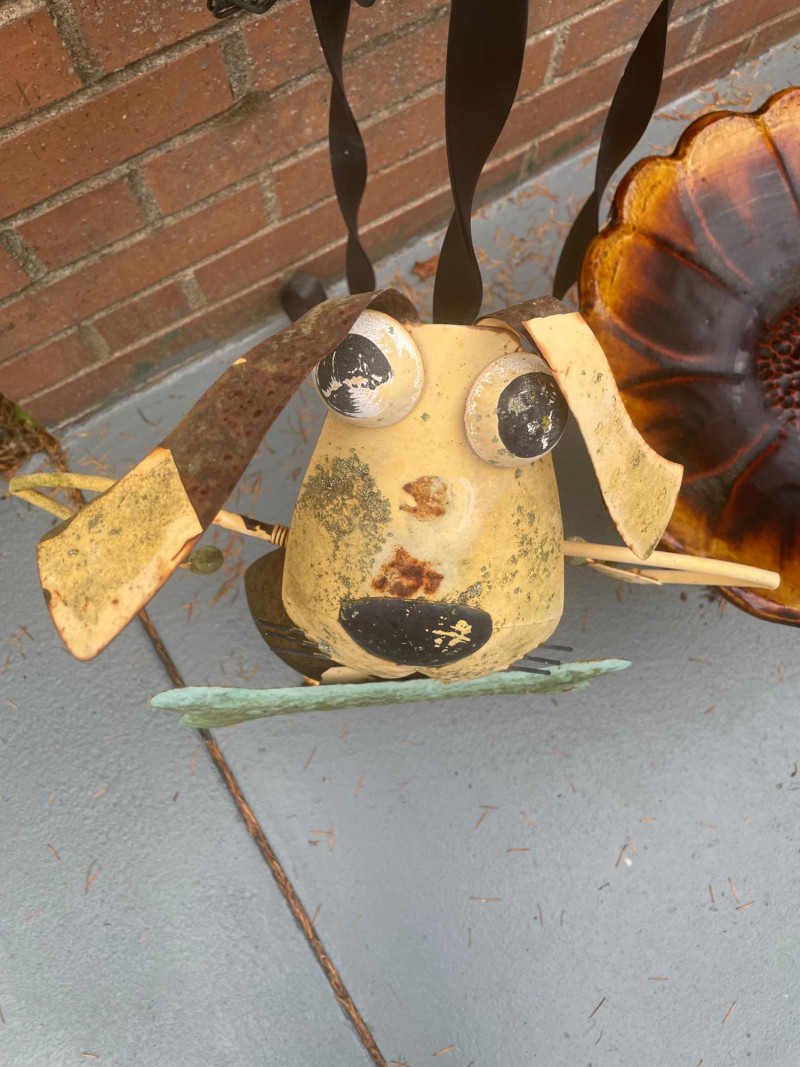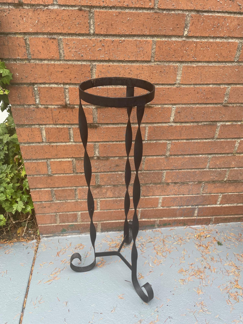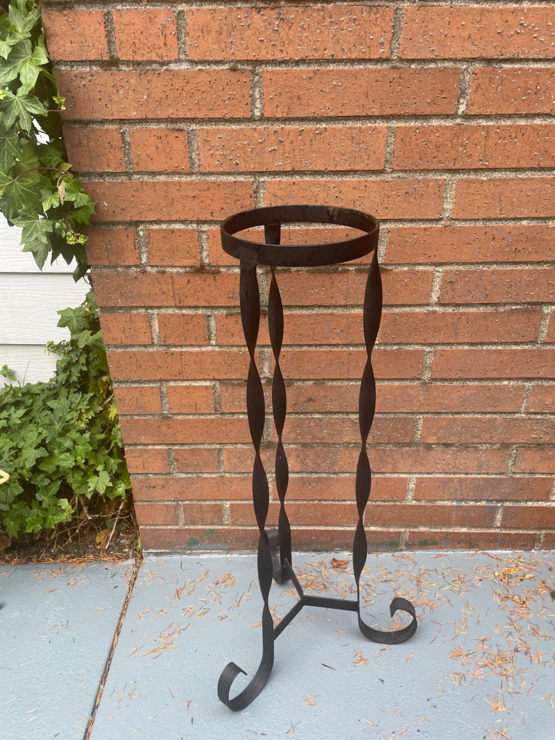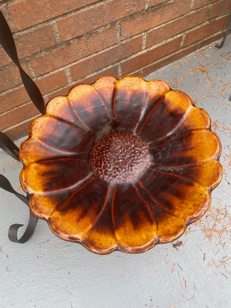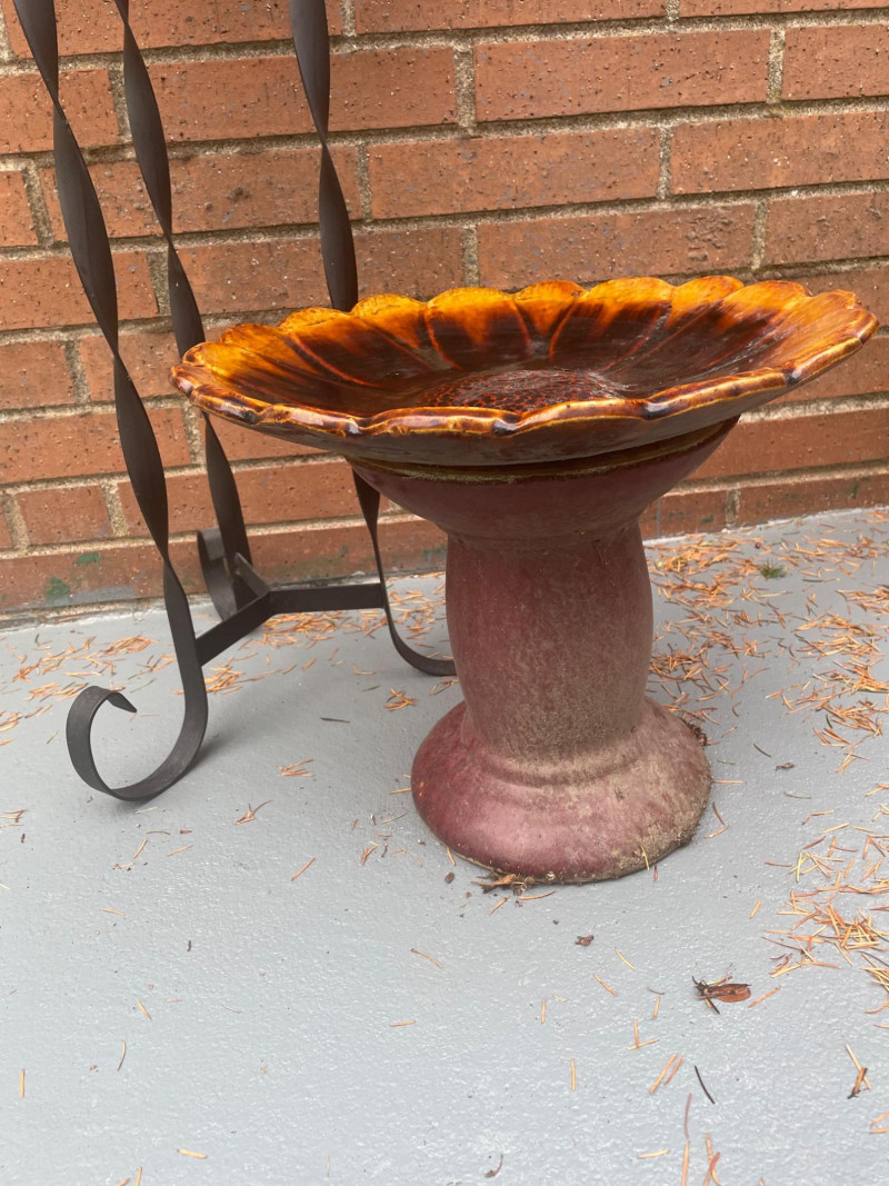 Lot # 65 - Ceramic Bird Bath, Rod Iron Planter and Puppy Yard Art