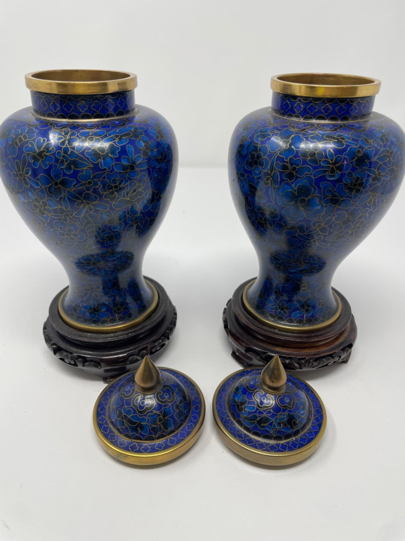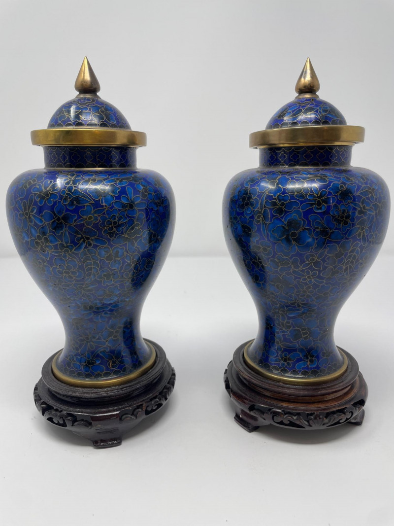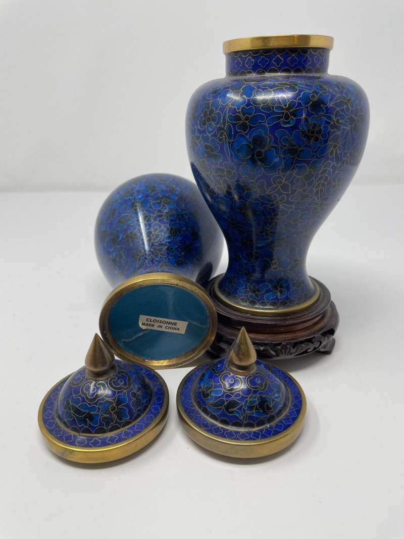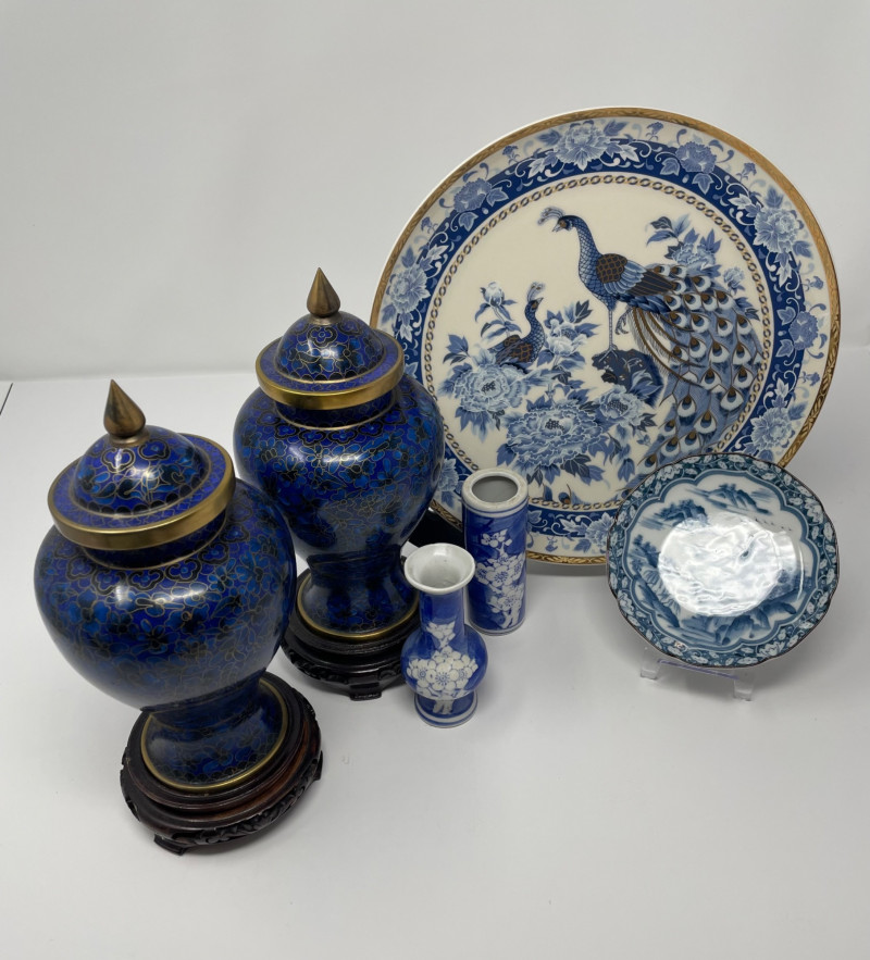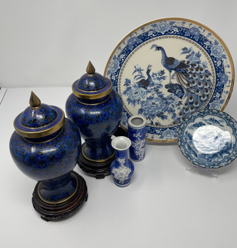 Stunning collection of blue-themed decorative pieces! This set combines cloisonné enamel work with blue-and-white porcelain, making it perfect for an elegant display or themed décor. Peacock Plate 10", Blue Flower Plate 4 34" Two Bud 4" Vases Two Blue Cloisonne' Ginger Jars 10" including stand Plate Stand not included