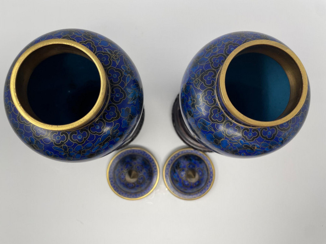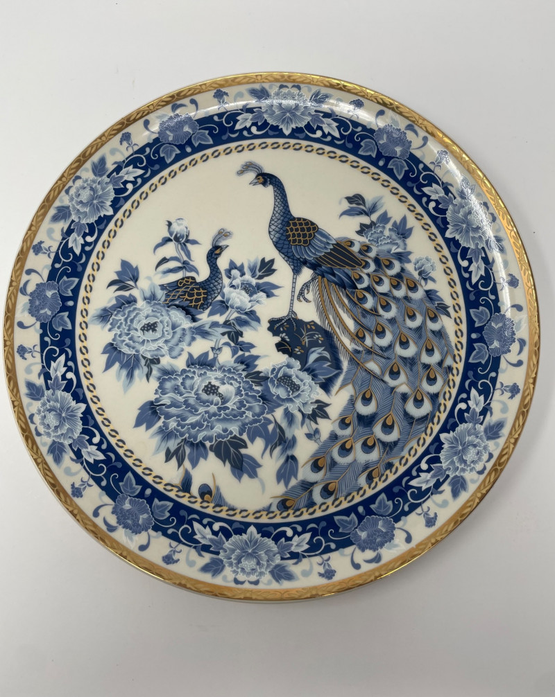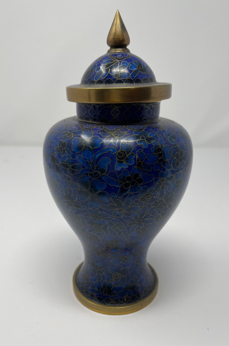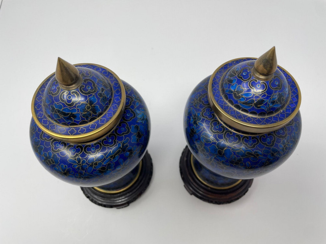 Stunning collection of blue-themed decorative pieces! This set combines cloisonné enamel work with blue-and-white porcelain, making it perfect for an elegant display or themed décor. Peacock Plate 10", Blue Flower Plate 4 34" Two Bud 4" Vases Two Blue Cloisonne' Ginger Jars 10" including stand Plate Stand not included