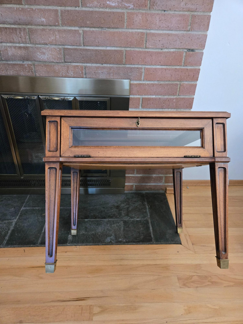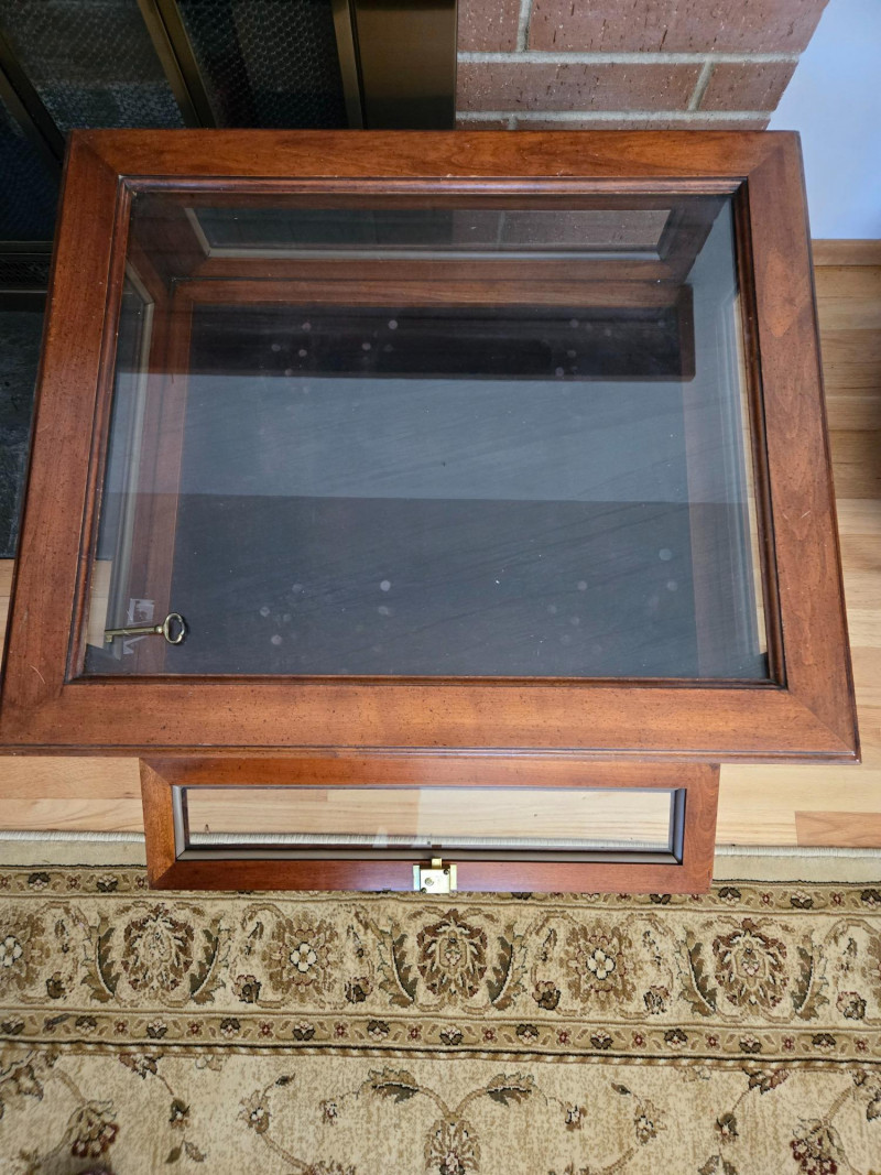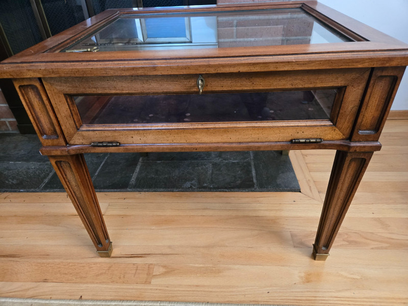 Wooden coffee table with a built-in display case. Design: Material: Condition: