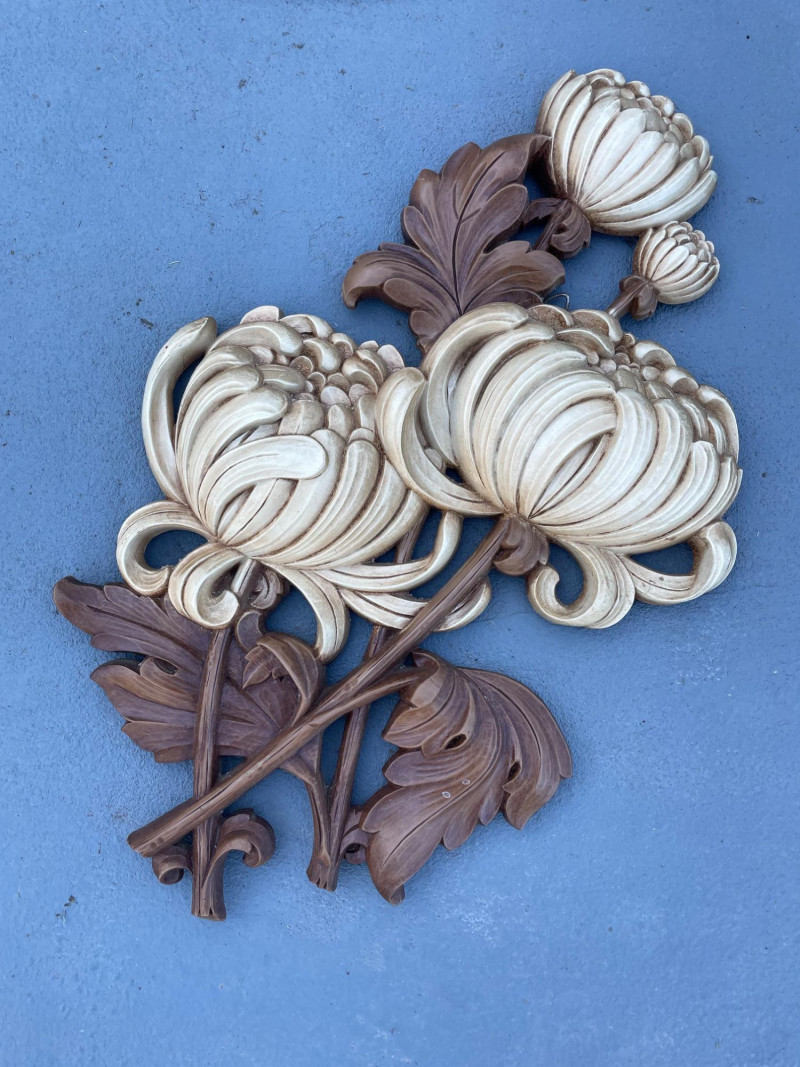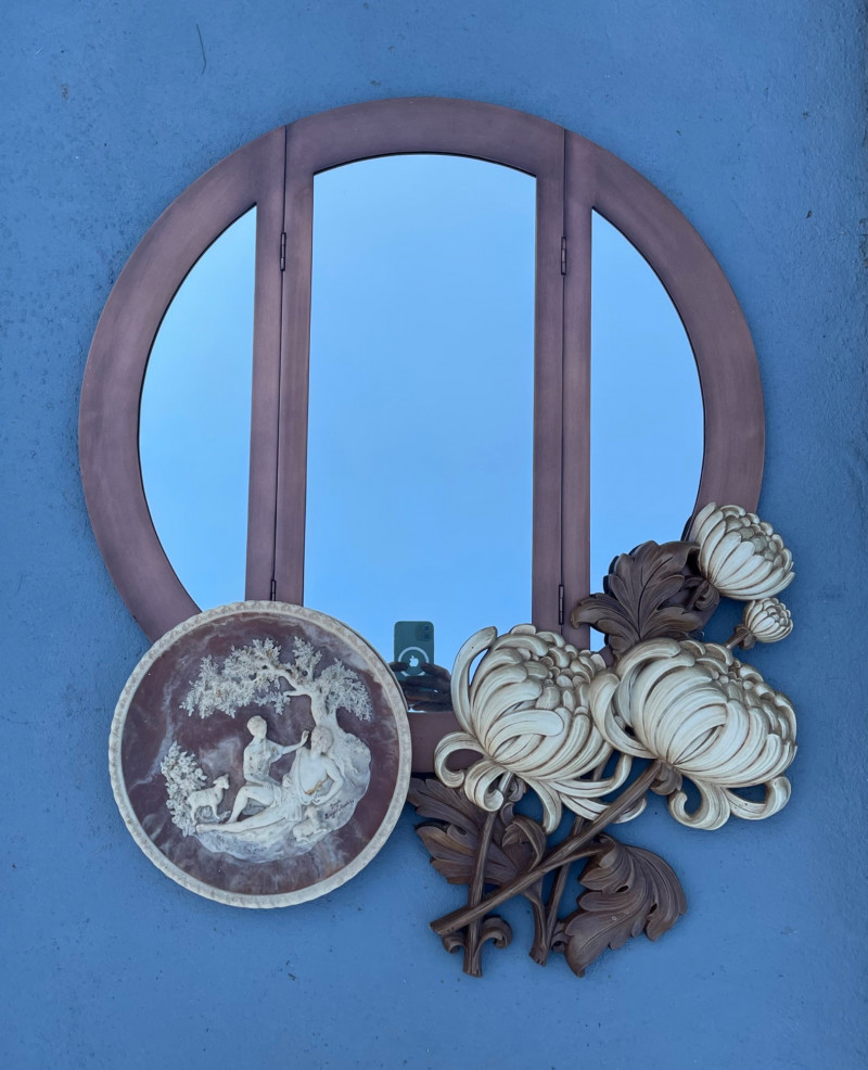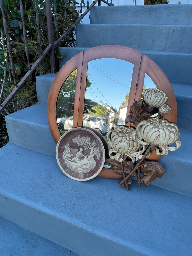 ‘Romantic Poets’ Sculpture Plate by Gayle Bright, 10” Vintage Syroco Wall Plaque Featuring Chrysanthemum Flowers from 1960-1970’s 19” H x 12” W Beautiful home décor arrangement with three main elements: This arrangement blends vintage charm with artistic sophistication, making it ideal for a living room, hallway, or reading nook. The combination of reflective surfaces, classical art, and floral motifs evokes a timeless, romantic aesthetic.Key Details