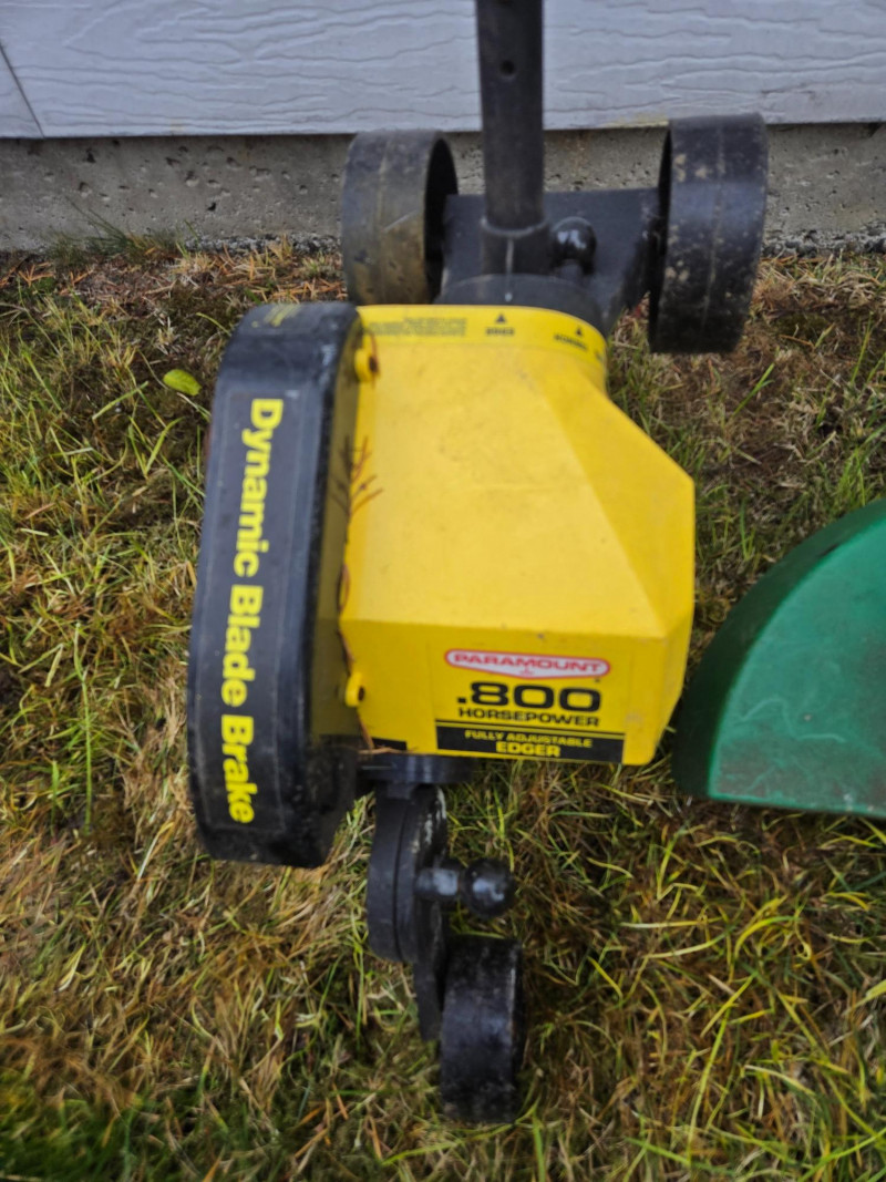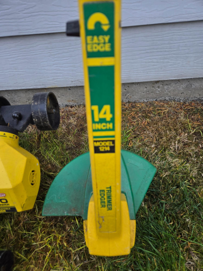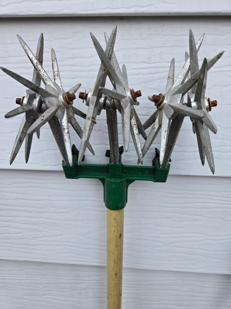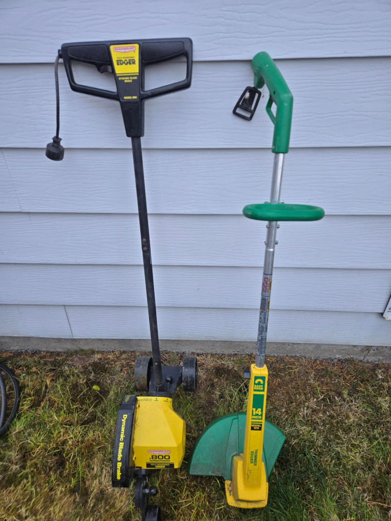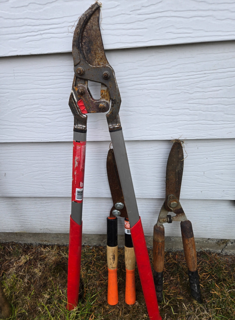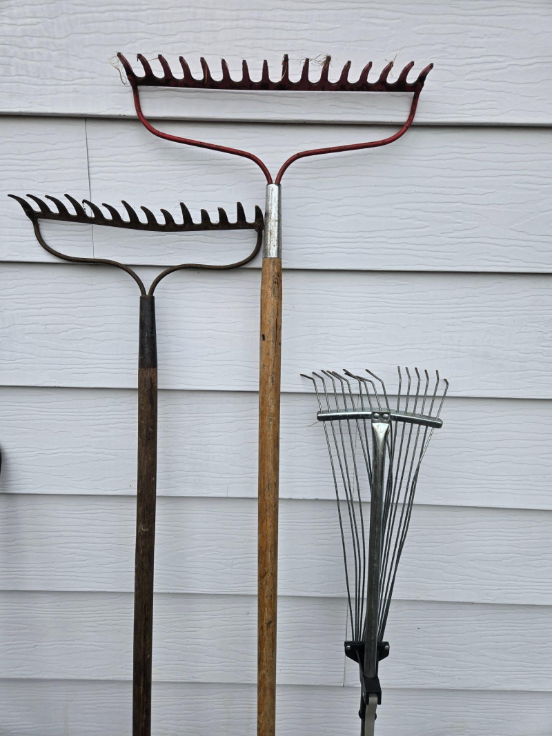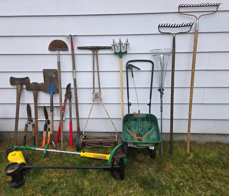 Collection of assorted yard tools (some vintage), arranged upright against an exterior wall on grass. Here’s a detailed breakdown: Cutting Tools: Digging & Edging Tools: Cultivating Tools: Rakes: Power Tool:Tools Included