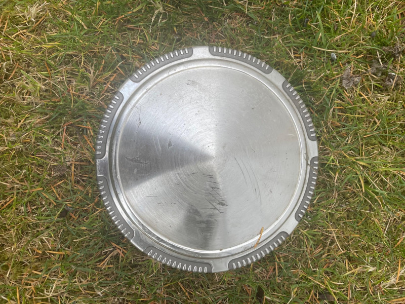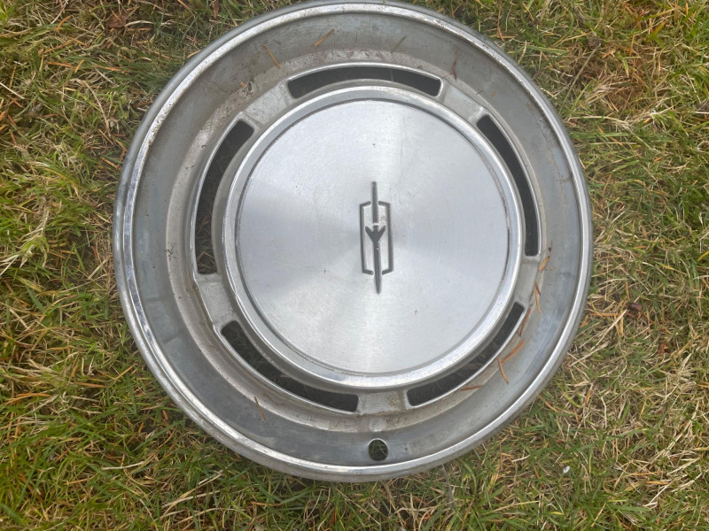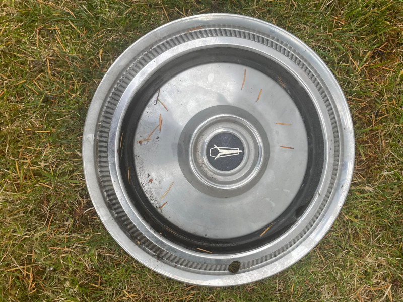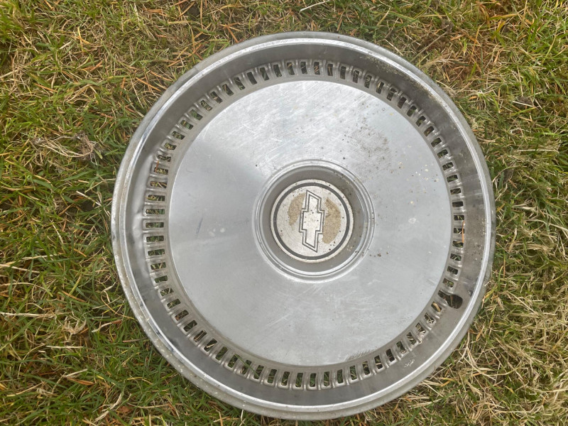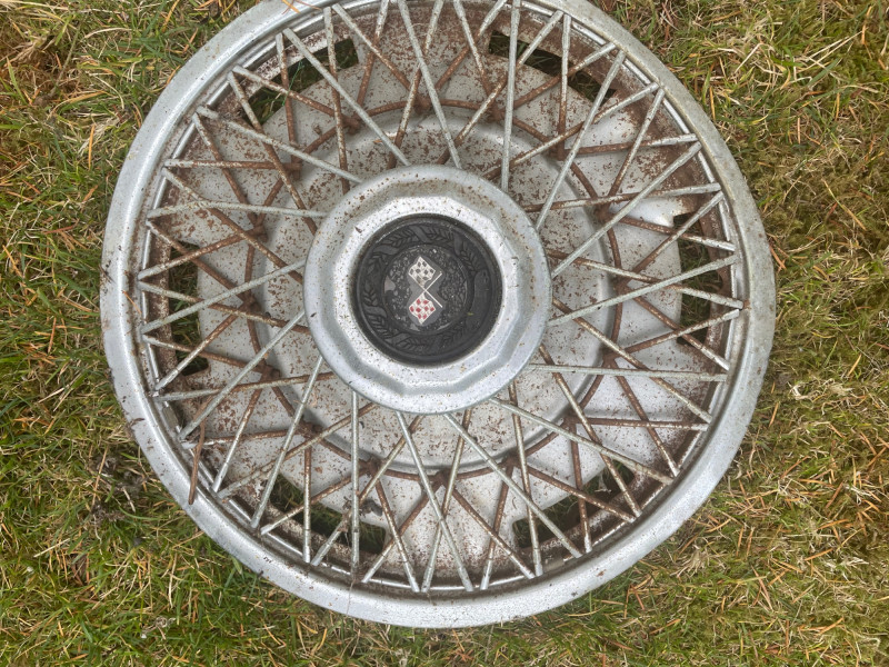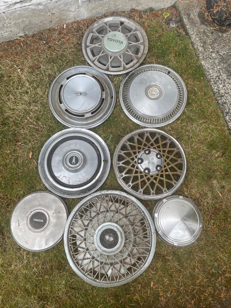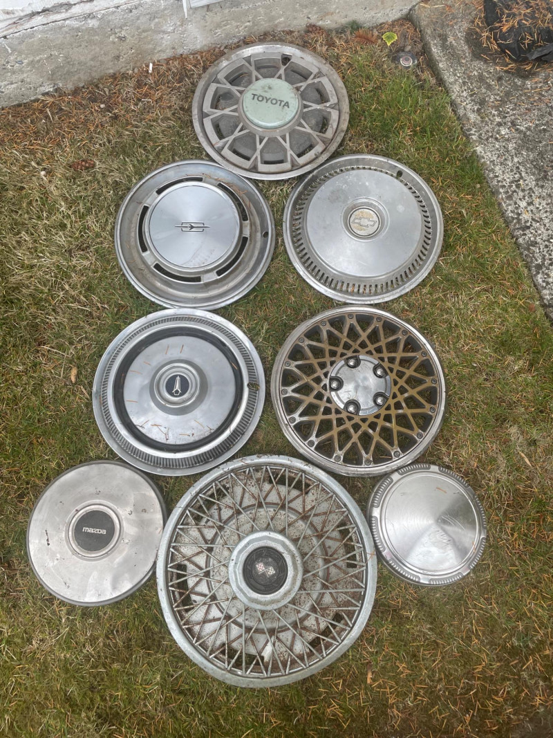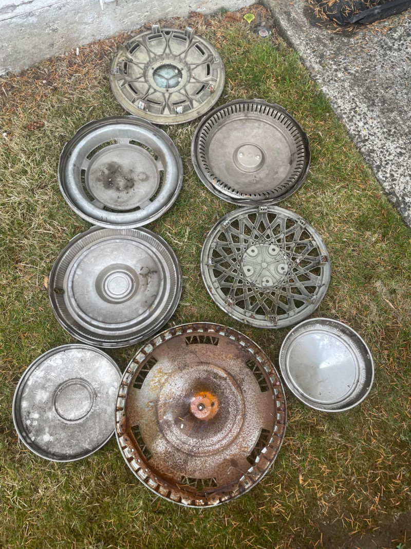 Eight vintage automotive hubcaps, arranged on grass. Visible Brands & Styles
