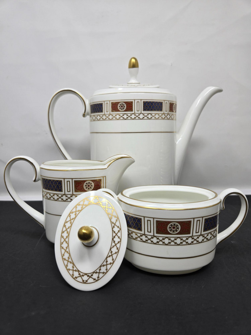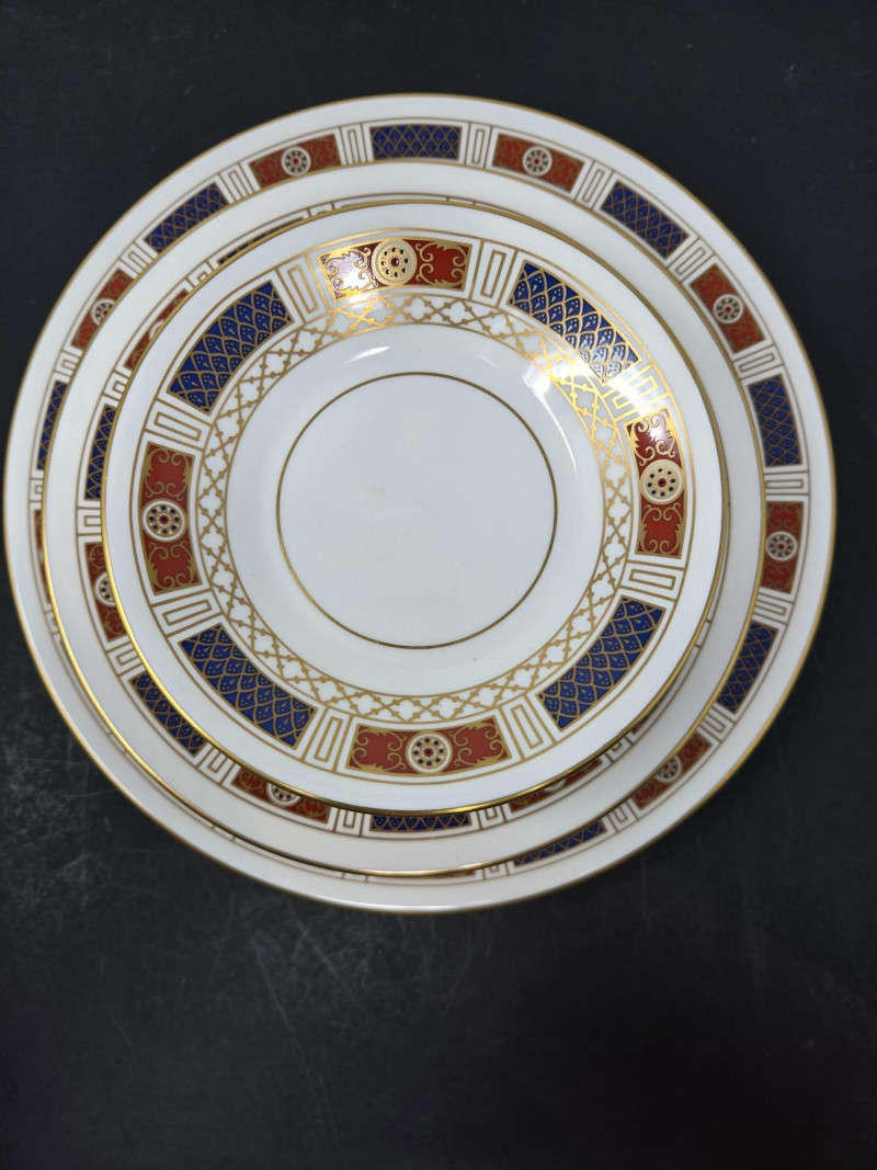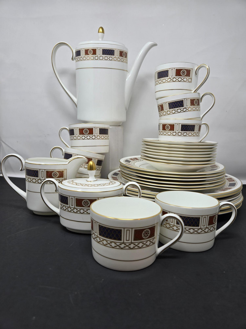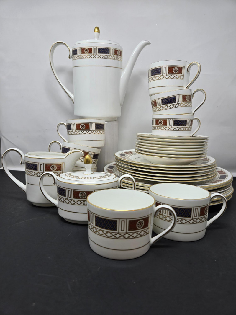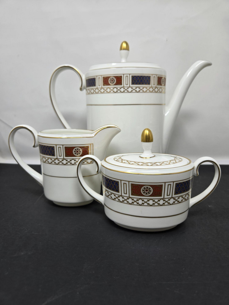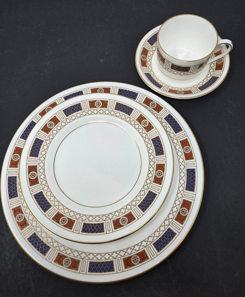 Vintage Coalport Marlborough fine china set with a geometric and floral border design in navy blue and rust tones, accented with gold trim. Here’s a detailed breakdown:Overall Setting