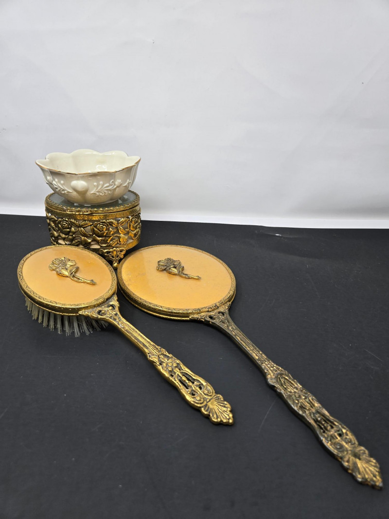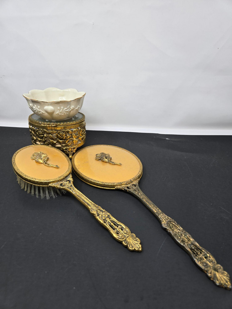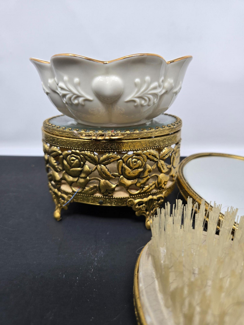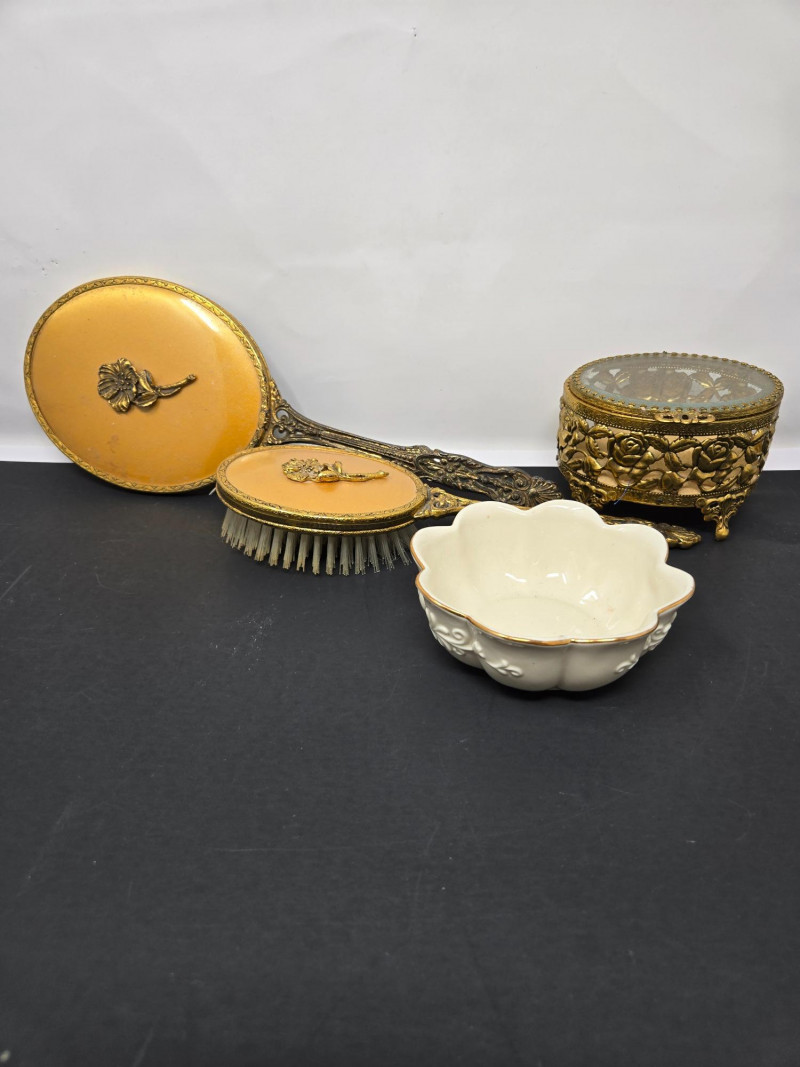 Lot # 106 - Vintage Vanity Set With Hand Mirror, Brush, Jewelry Box & Lenox Trinke
