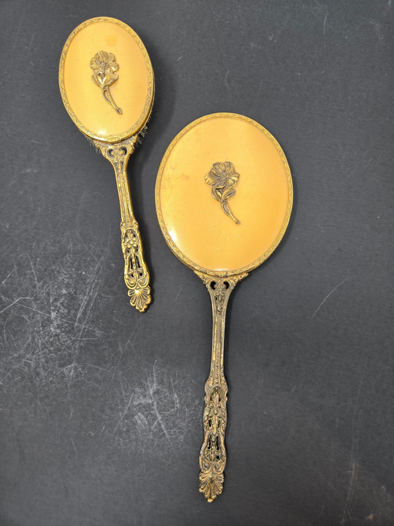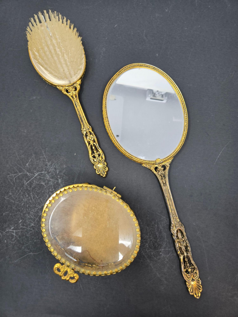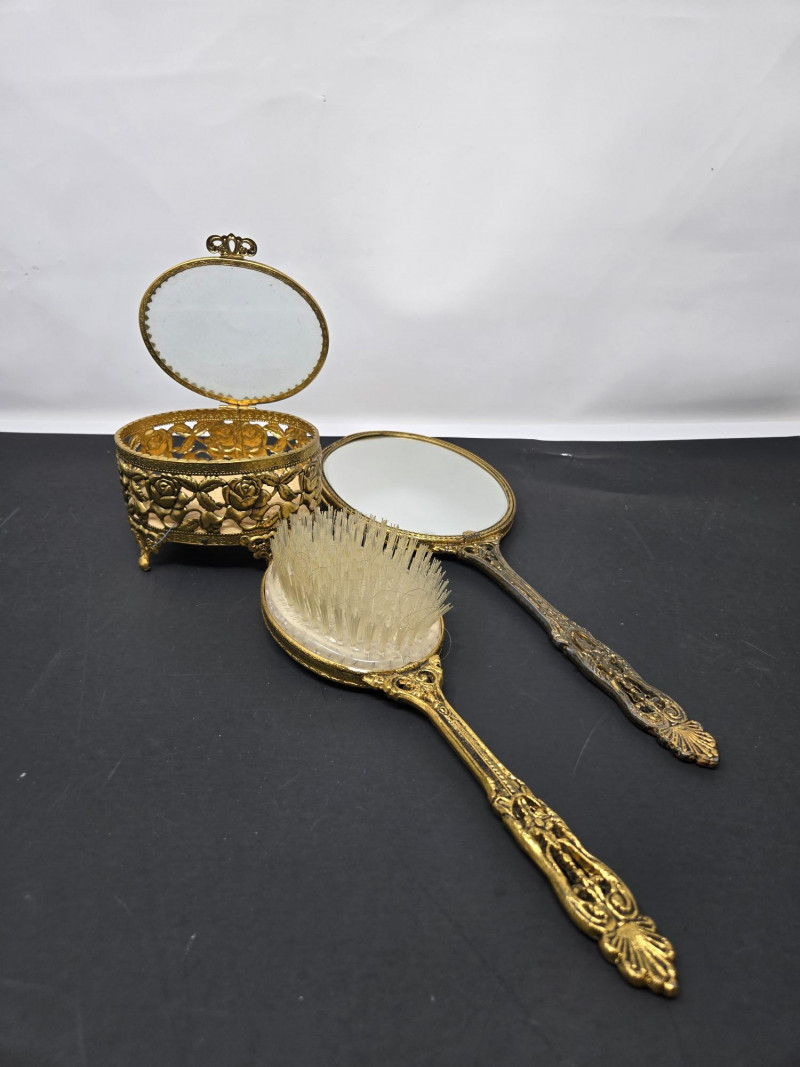 Vintage vanity set consisting of ornate grooming and decorative pieces. Overall Setting