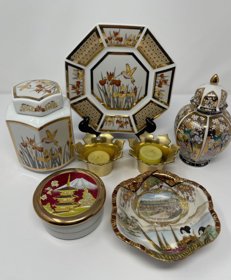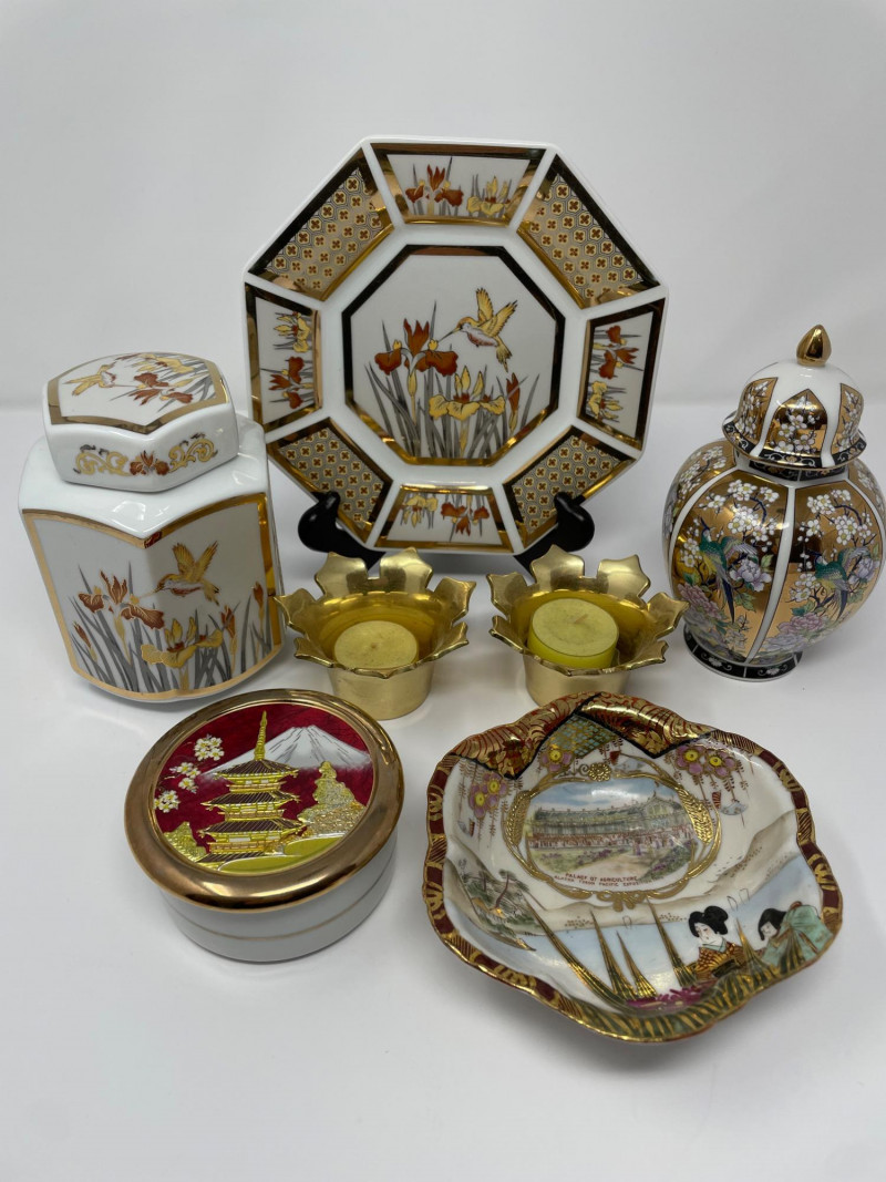 Enhance your space with this exquisite set of Japanese décor items, featuring: Condition: Excellent, with no chips or cracks. Sizes range from 2" to 10"Japanese Decorative Collection – Porcelain & Cloisonné Accents