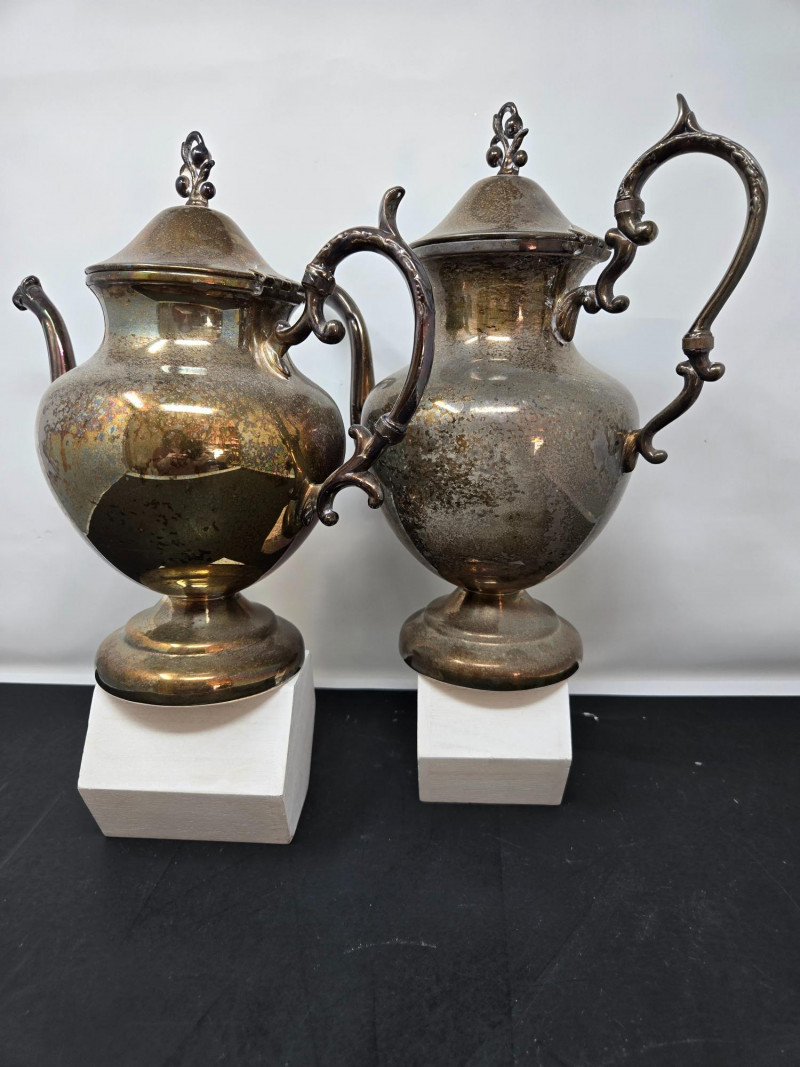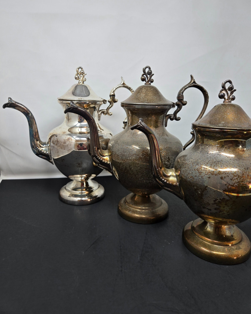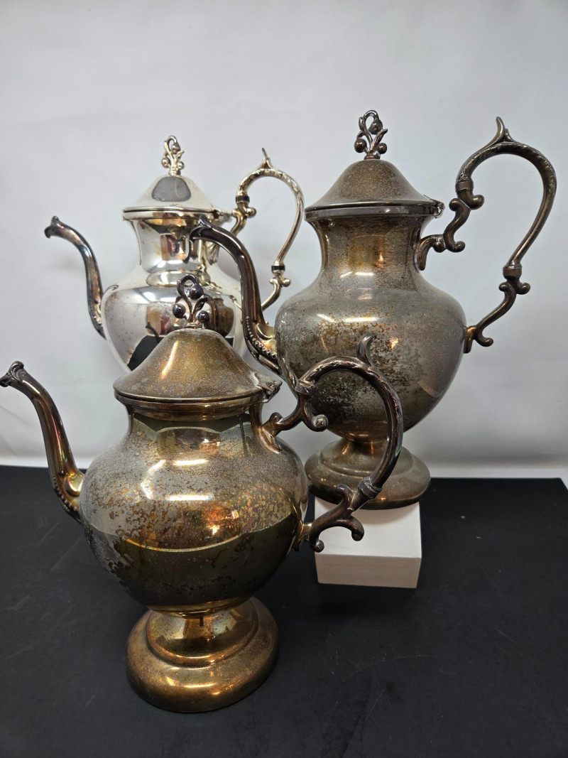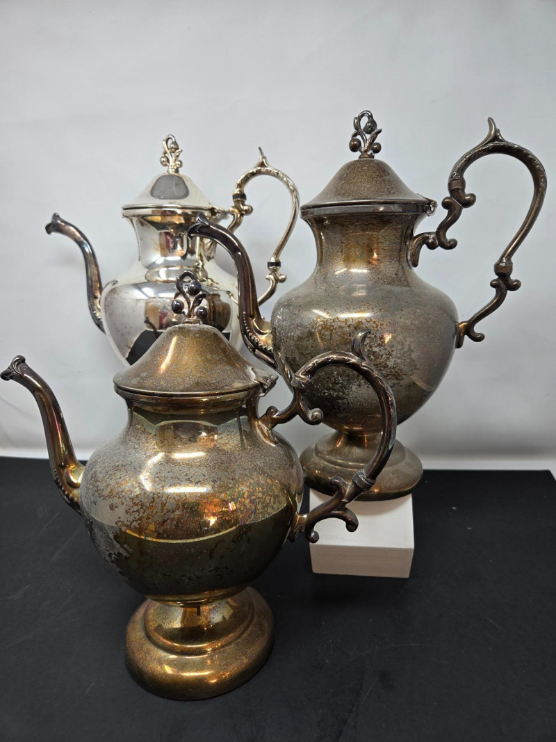 No markings 11"-12" T Three vintage silver-plated coffee pots with ornate designs, displayed on a black surface against a white background. Here’s a detailed description: