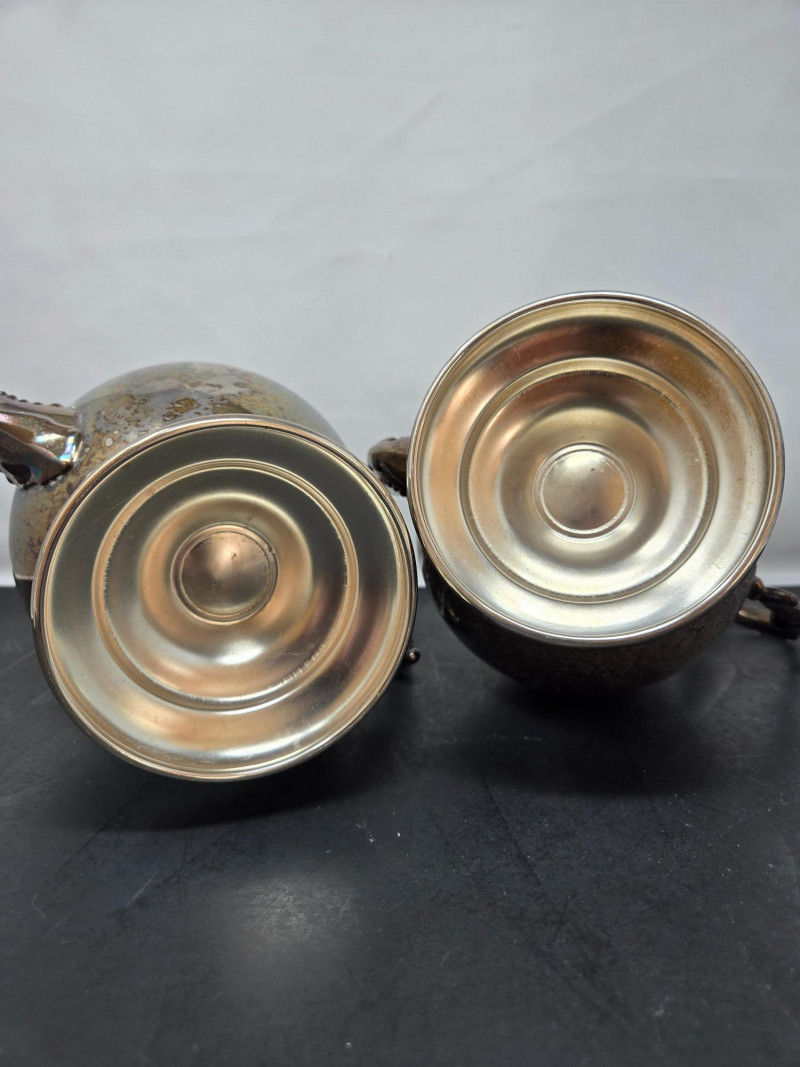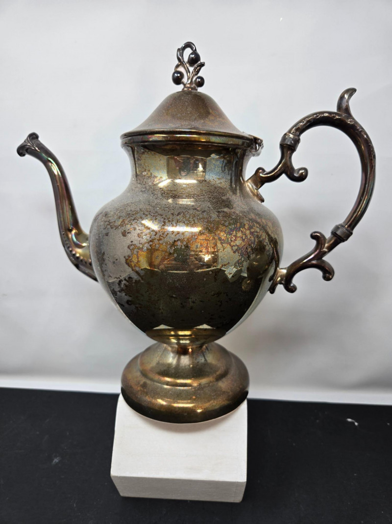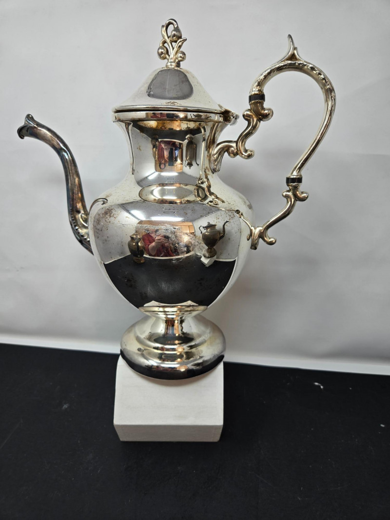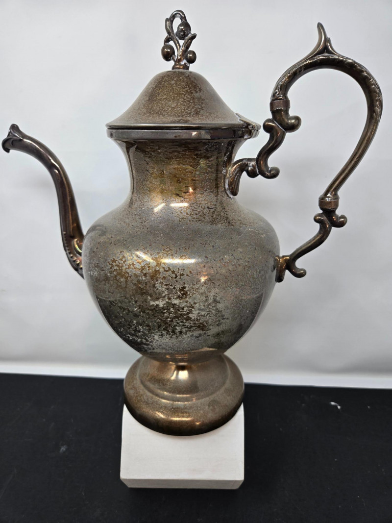 No markings 11"-12" T Three vintage silver-plated coffee pots with ornate designs, displayed on a black surface against a white background. Here’s a detailed description: