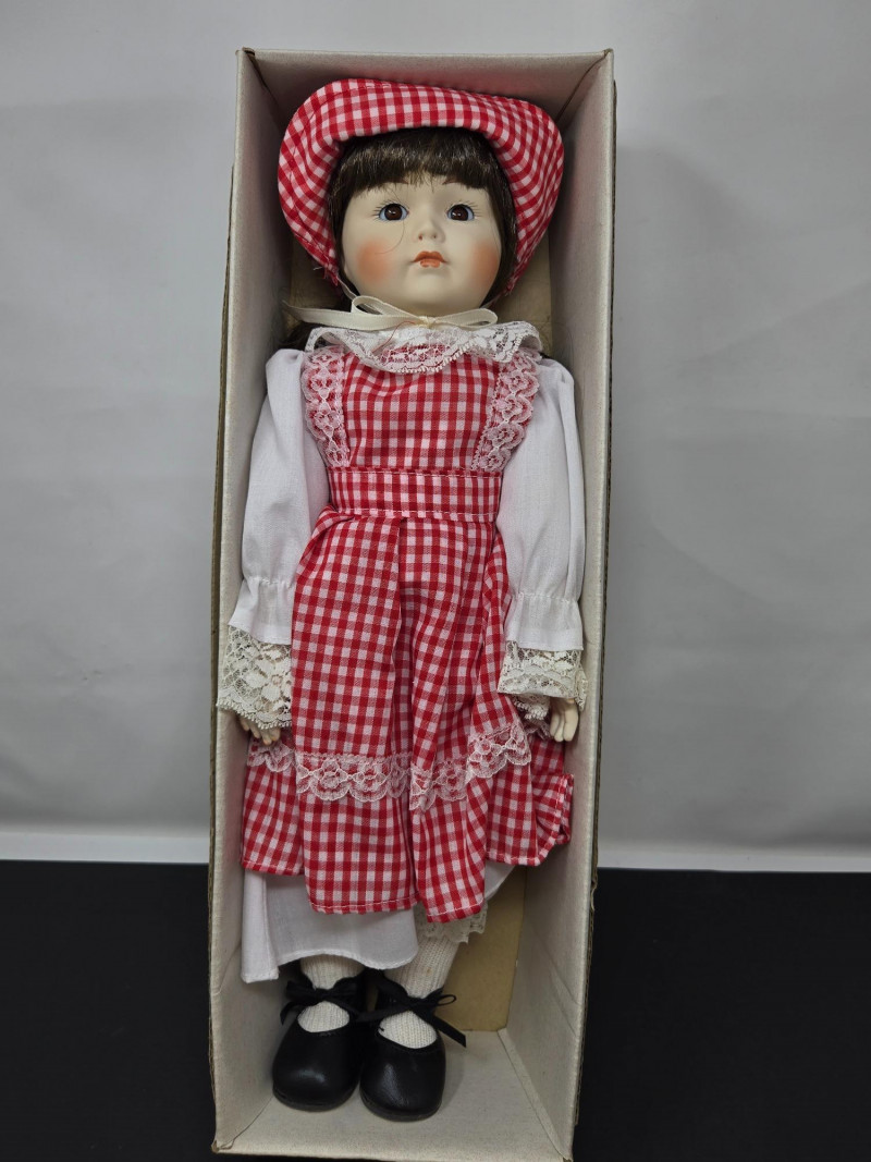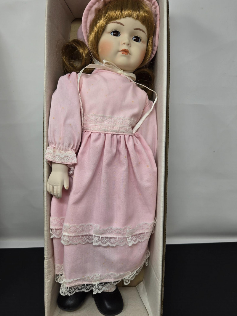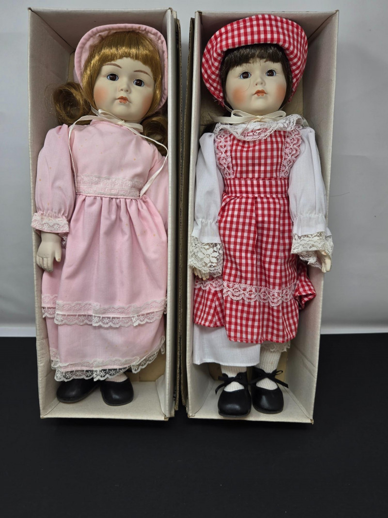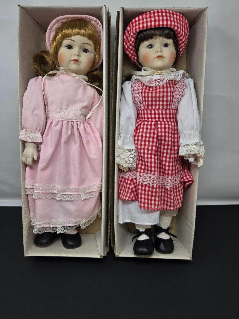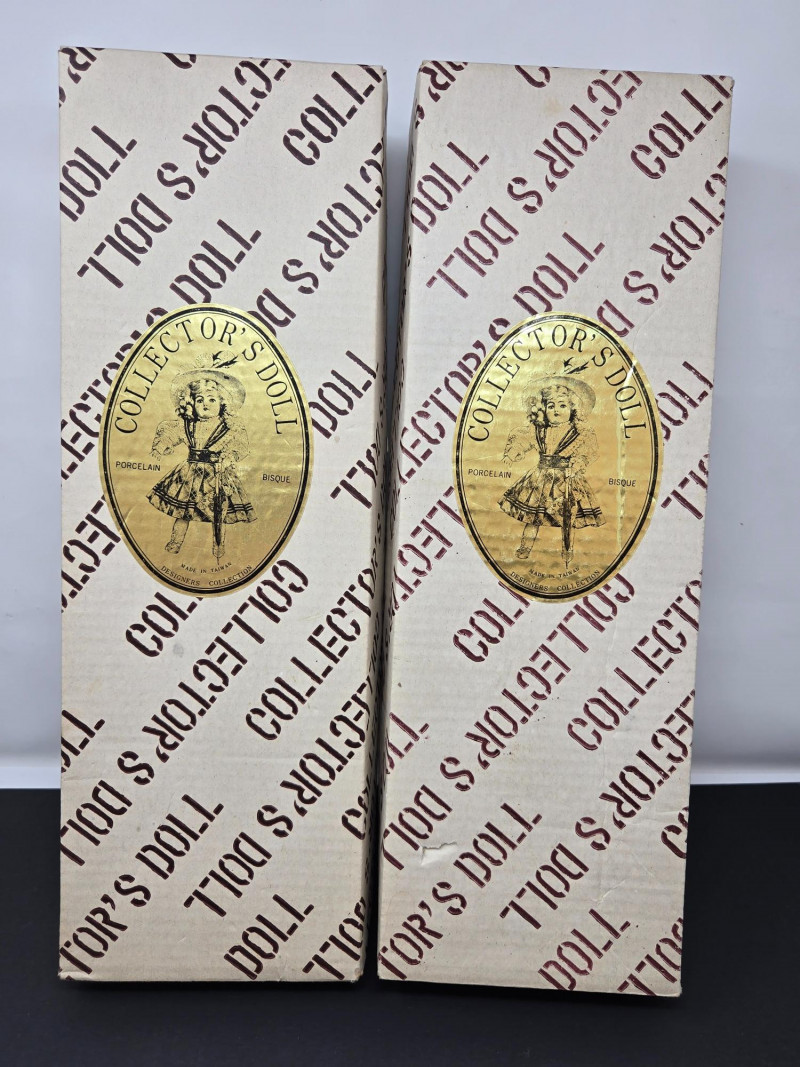 Two porcelain dolls by "Collector's Dolls", each housed in its original box. Here’s a detailed description: Left Doll: Right Doll: