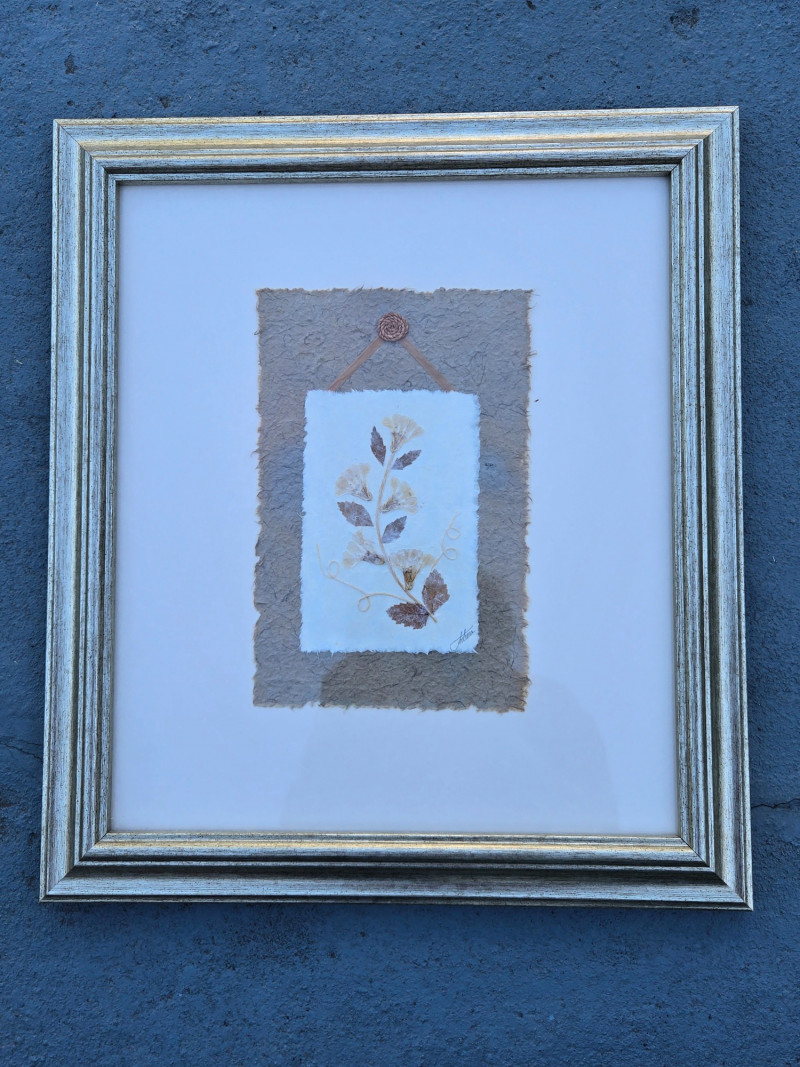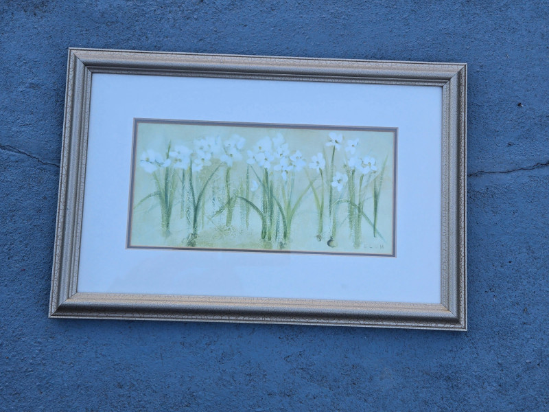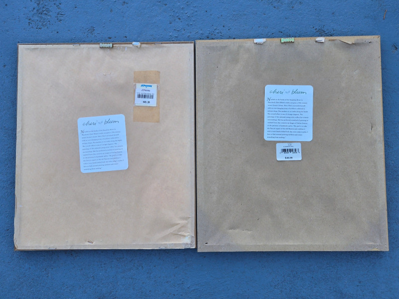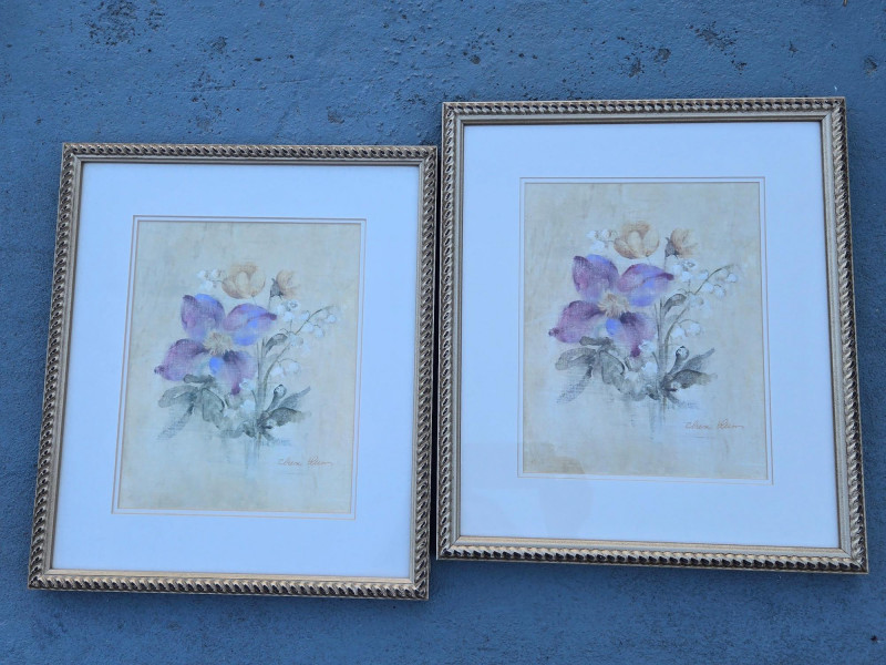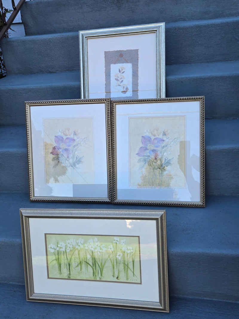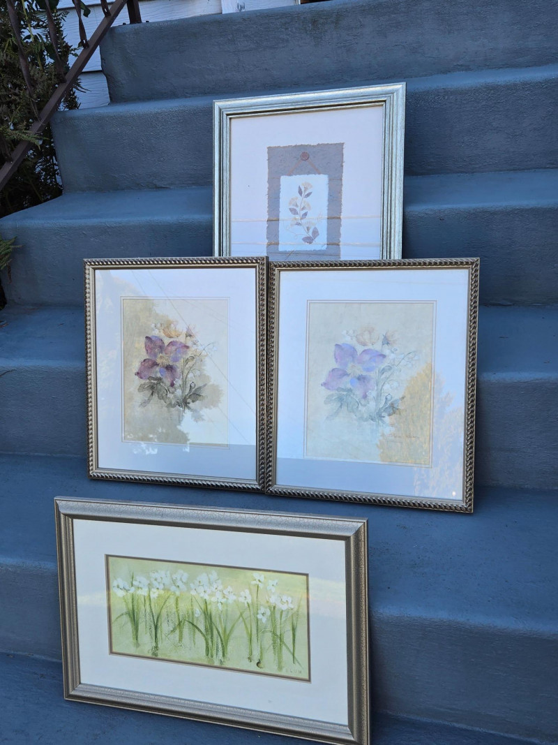 Four framed floral prints arranged on outdoor steps. Oblong/18"W x 12"T, Largest/17"T x 15"W, Pair/$15"T x 13"W