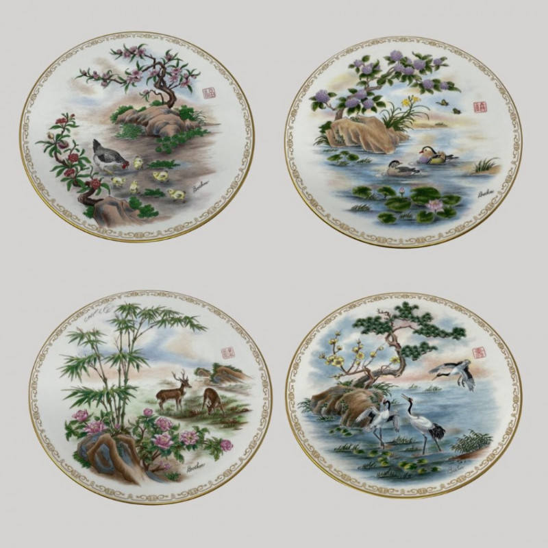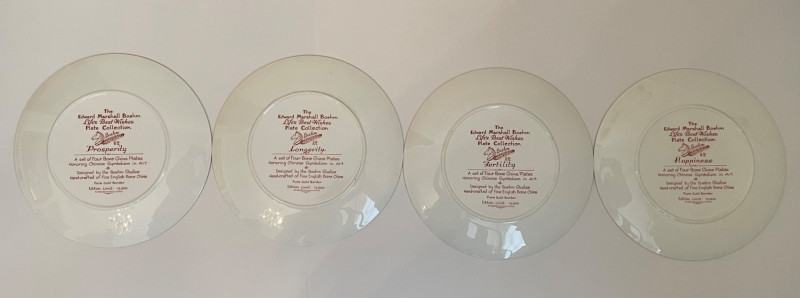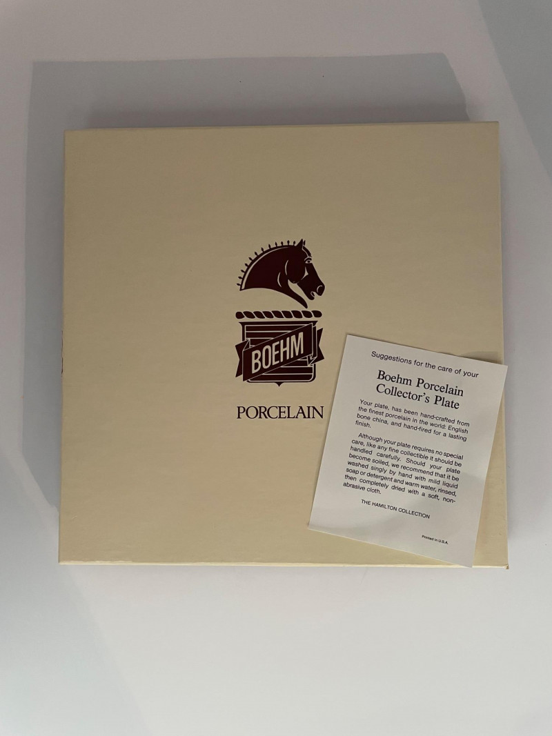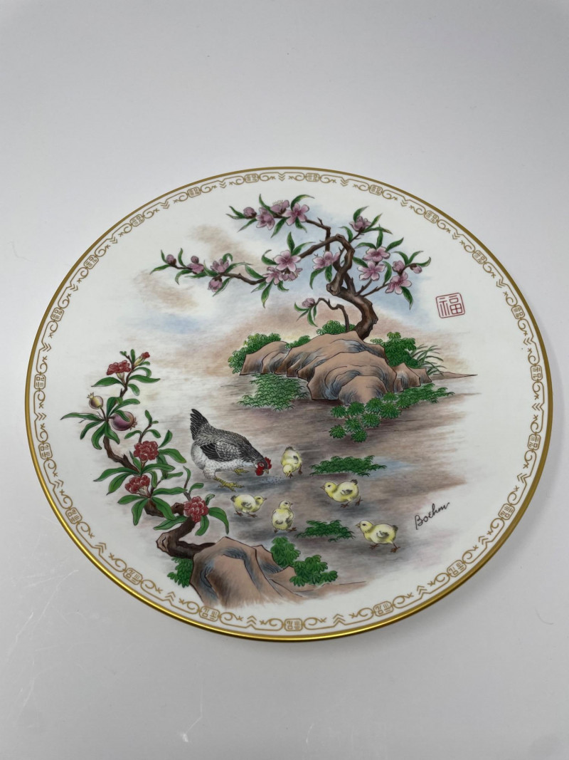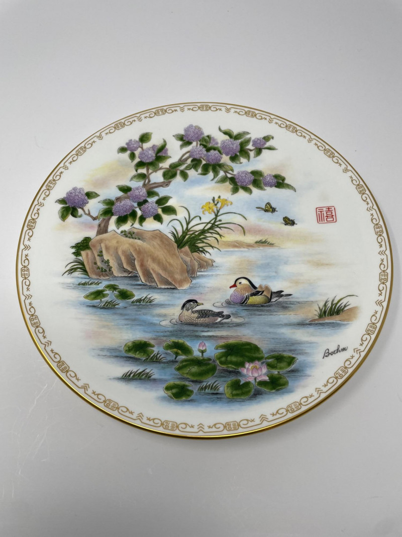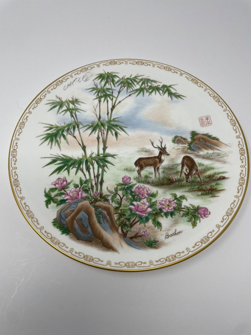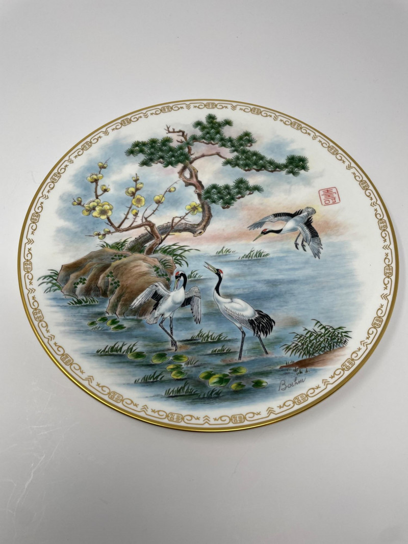 Four Bohem porcelain collector plates with intricate hand-painted designs. Here’s what stands out: These plates are likely part of a limited edition series by Bohem, known for high-quality decorative porcelain. Four Boehm Porcelain Plates in an Asian Style. Three plates have original box, one plate no box. All plates measure 10 1/2”. Description & Details