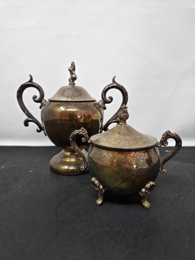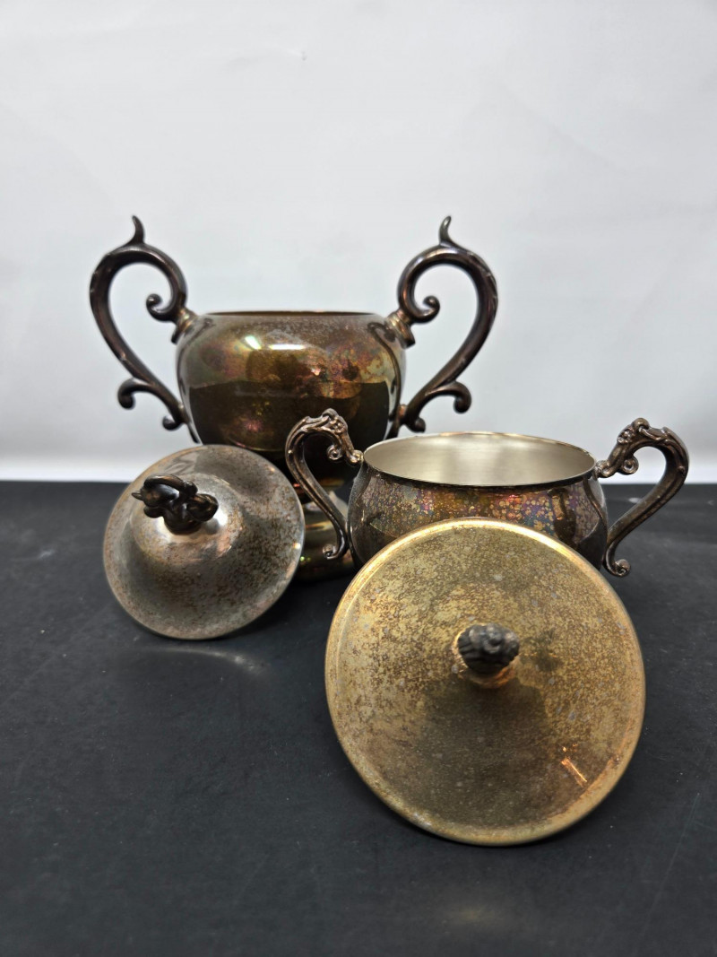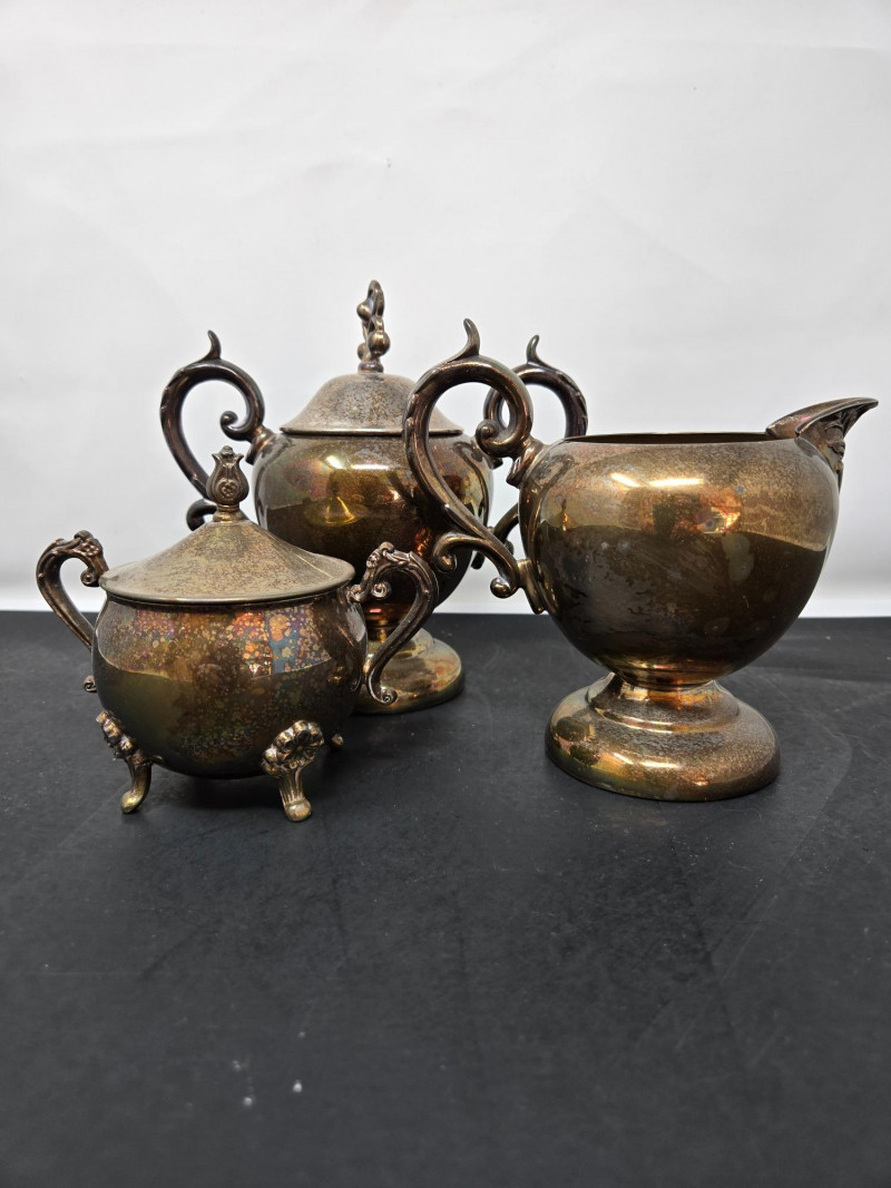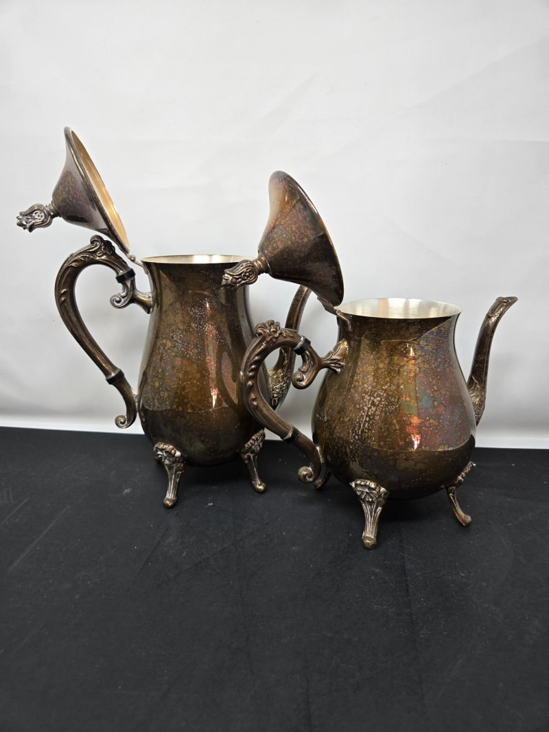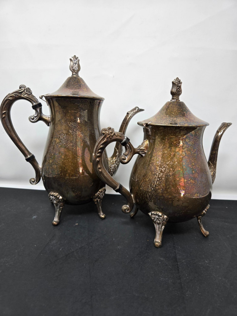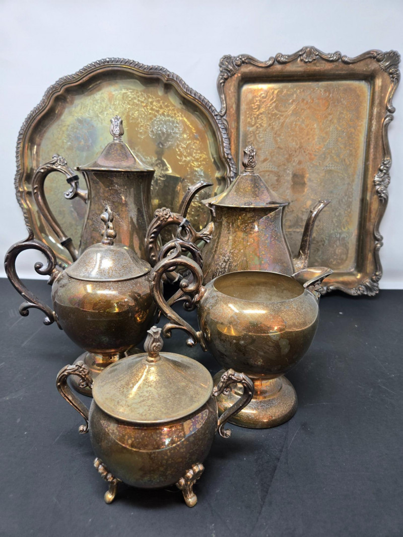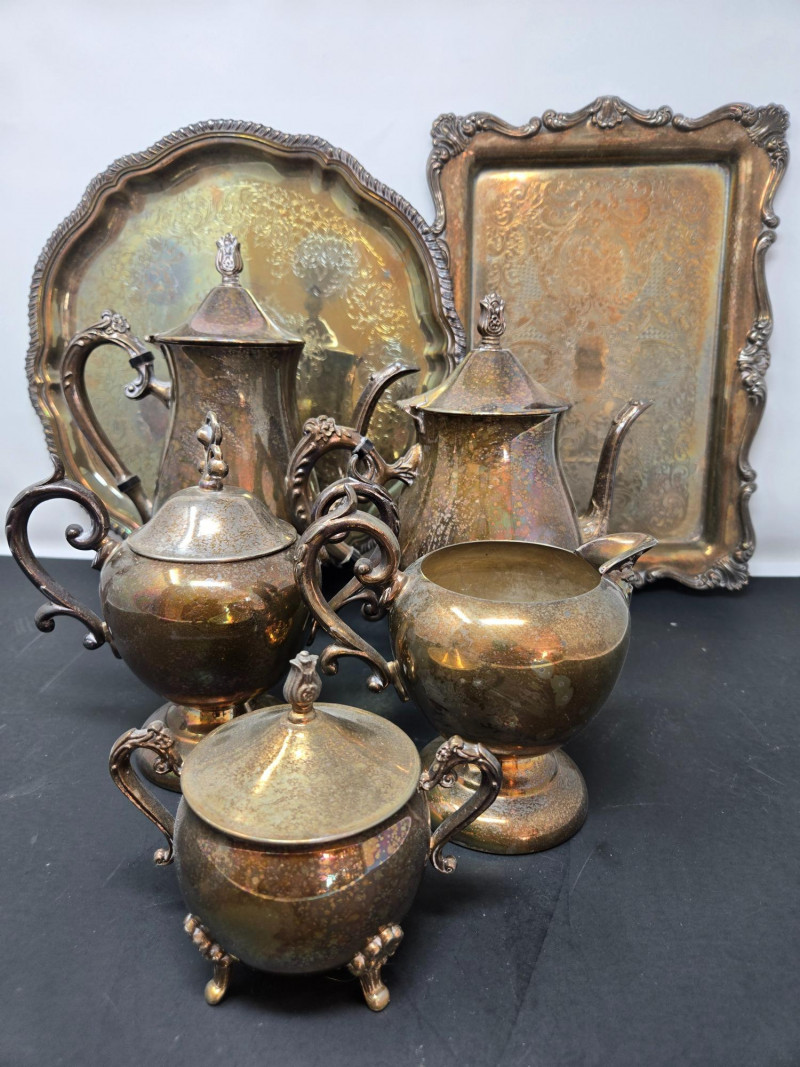2 trays (1 13" round & 1 14"x9 3/4 oblong), 2 mini coffee pots, 2 sugars & and 1 creamer Vintage silver-plated tea and coffee service set with ornate detailing. Here’s a detailed description: