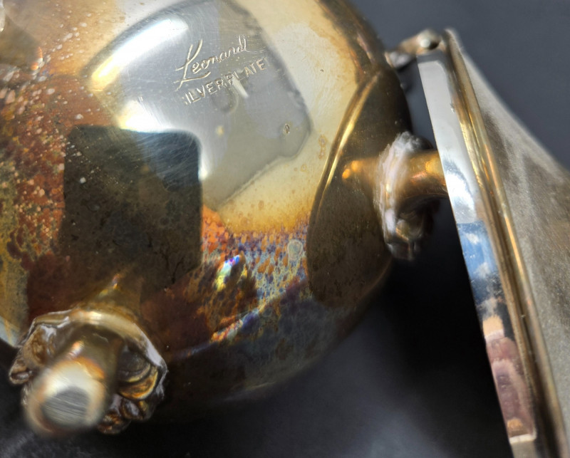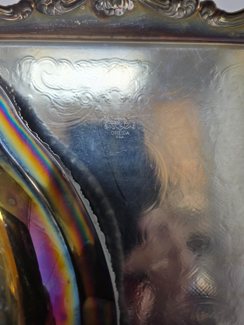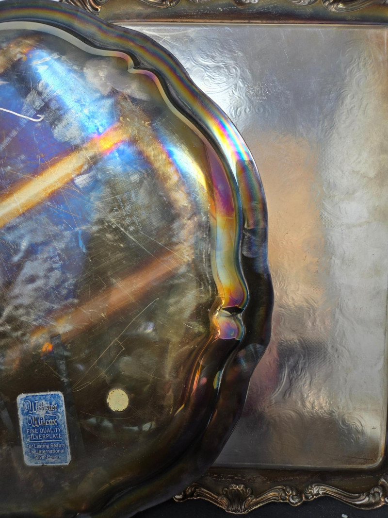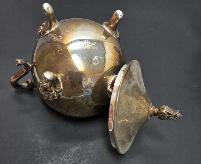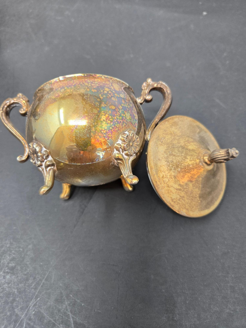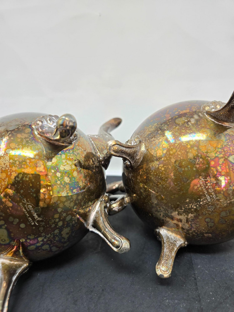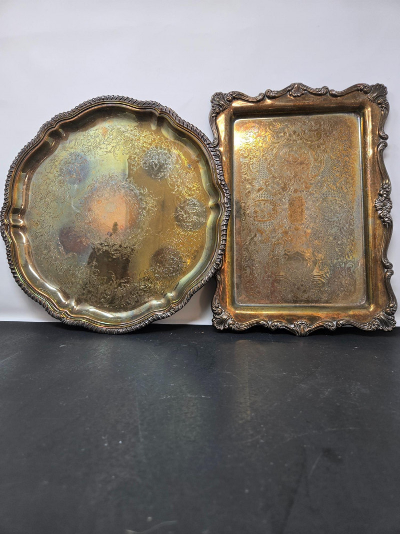 2 trays (1 13" round & 1 14"x9 3/4 oblong), 2 mini coffee pots, 2 sugars & and 1 creamer Vintage silver-plated tea and coffee service set with ornate detailing. Here’s a detailed description: