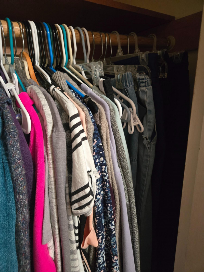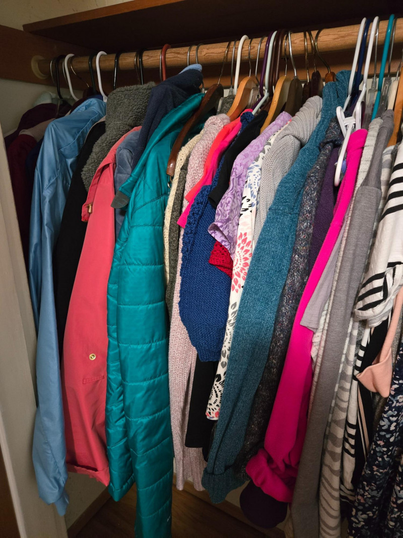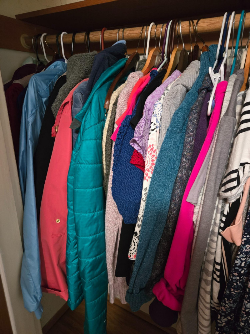 Closet filled with assorted clothing items, mostly in smaller sizes (10P) with some larger pieces.