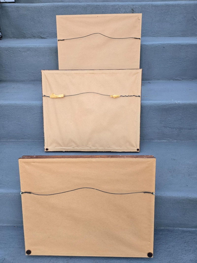 Three framed watercolor prints of boats by Brynn Foss, arranged on outdoor steps. Here’s a detailed description: