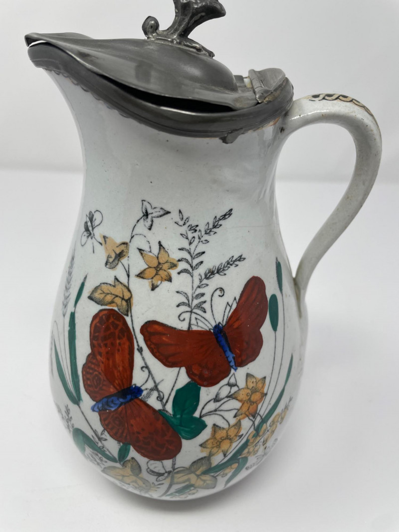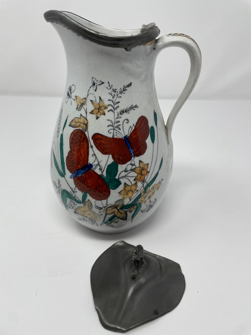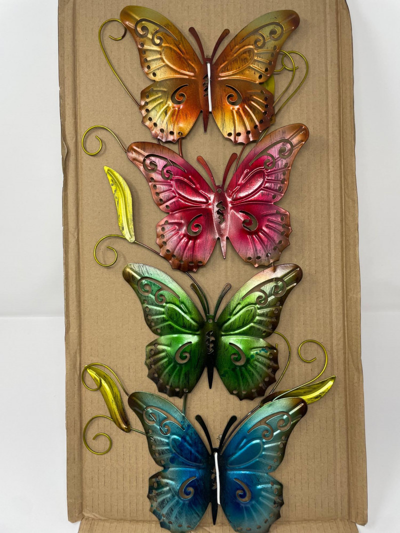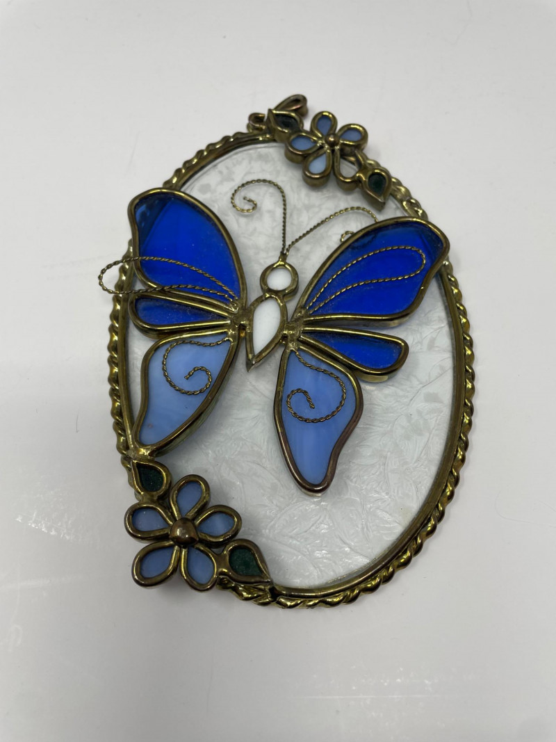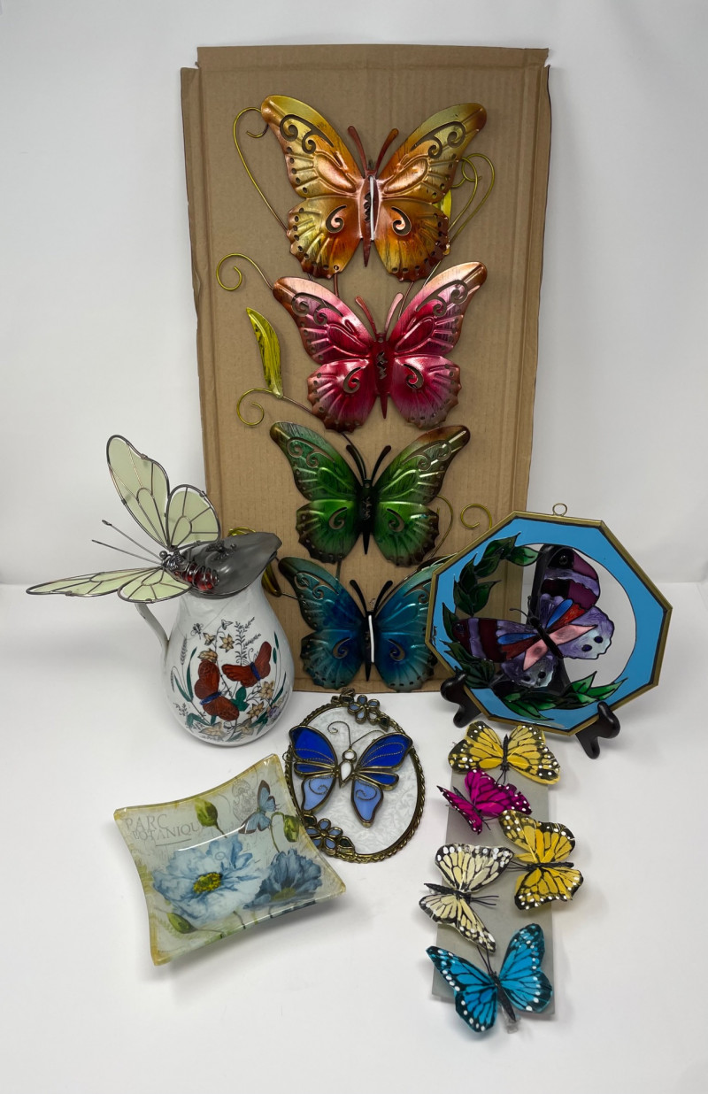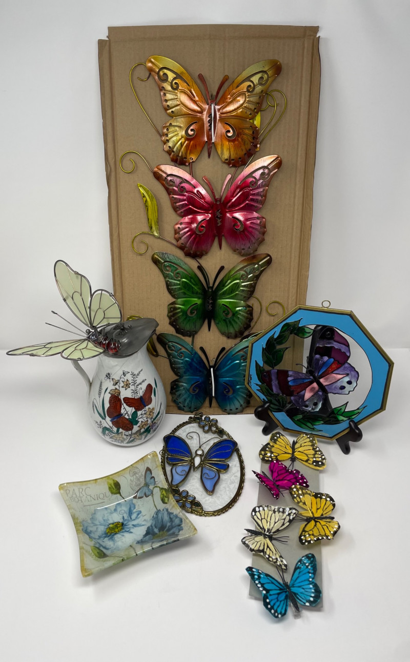 Pitcher with Lid 7” H x 6”. Lid no longer attached. Blue Butterfly Wall Decor 7” x 4” Butterfly Plant Decor 11” x 5 1/2” Blue and Purple Butterfly Wall Decor 7 1/4” Delicate Butterfly Clips 2” x 3 1/4” Pink clip has issue closing.