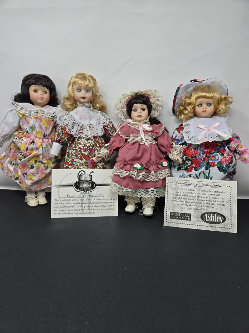 Four Wyndham Lane collector dolls, each dressed in distinctive vintage-style outfits and accompanied by certificates of authenticity.