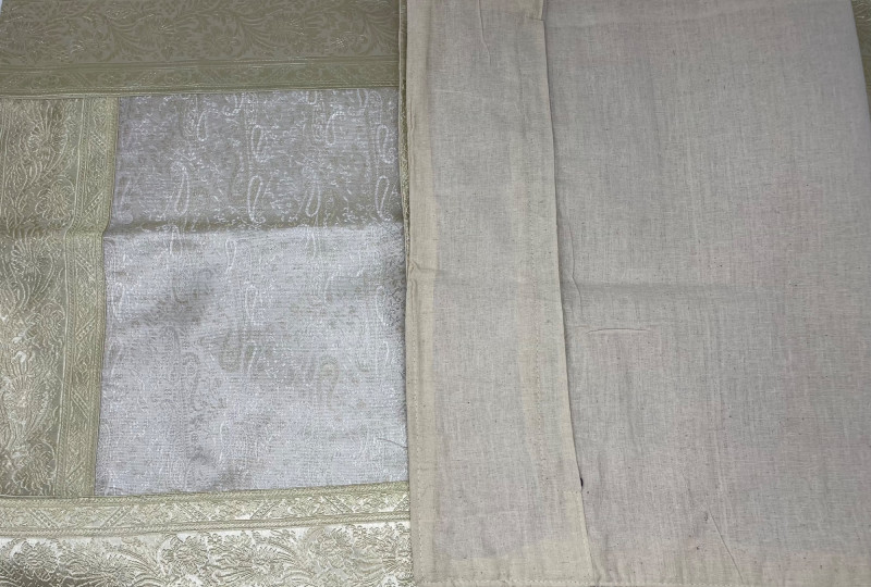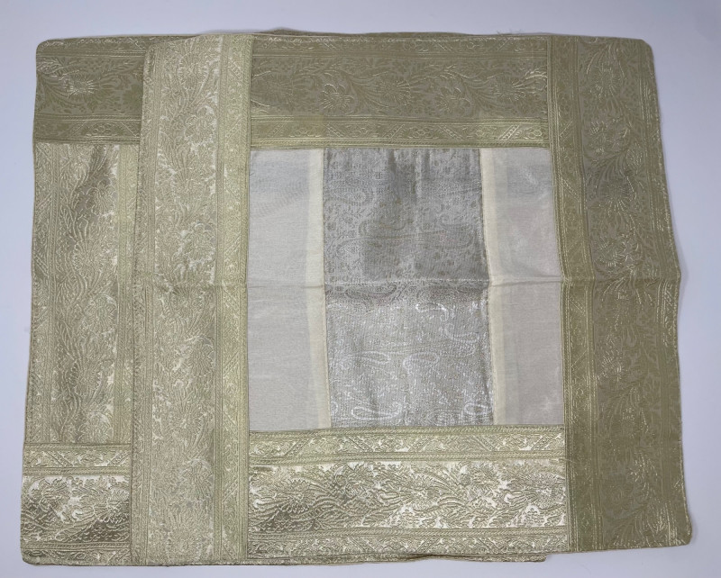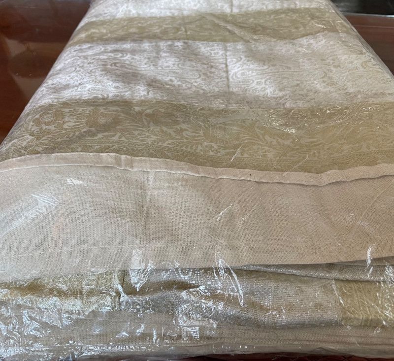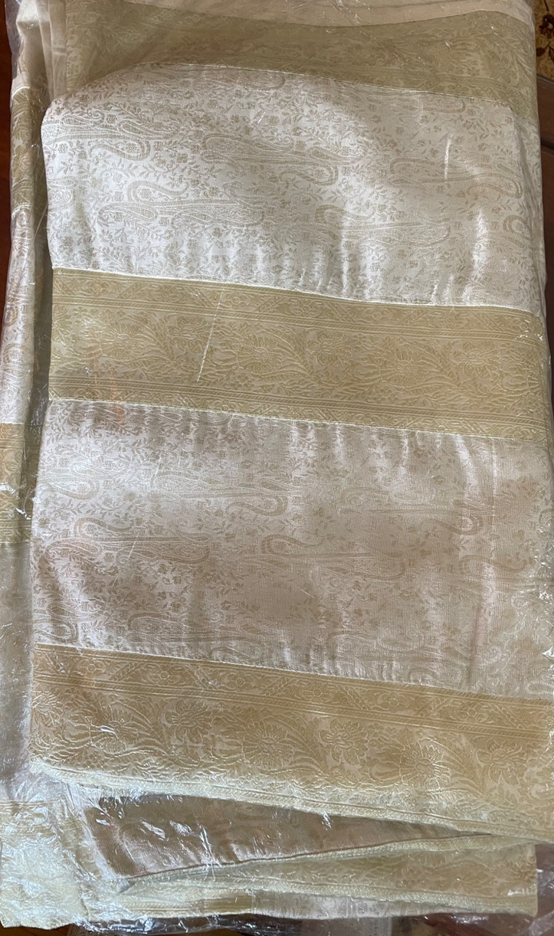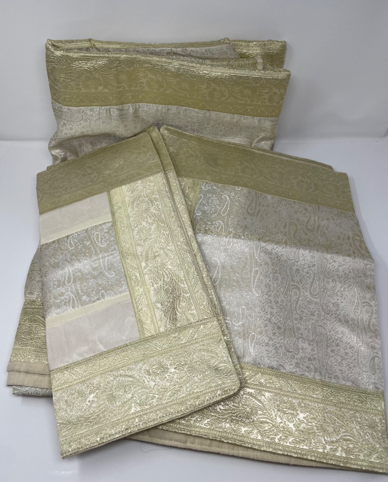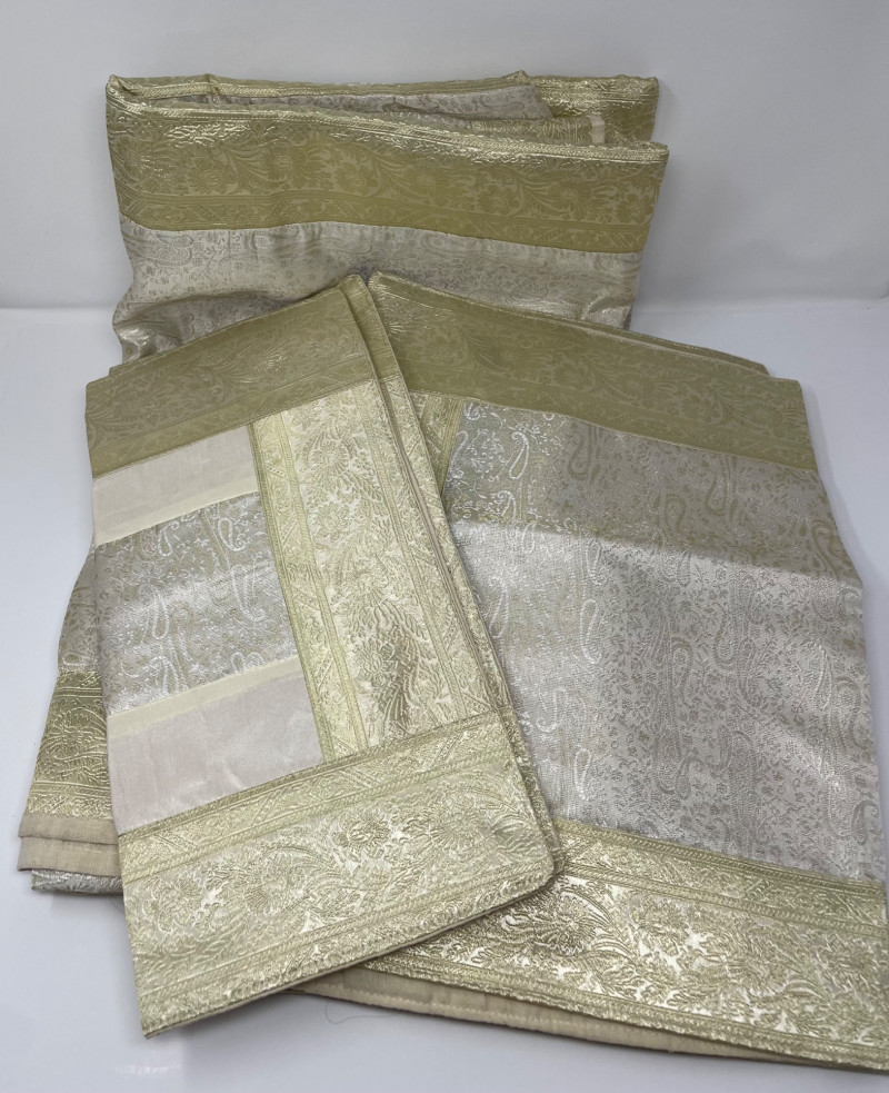 Set of silk woven bed linens in elegant shades of gold and ivory. Bed Cover 102” x 86” Pillow Shams 26” x 18” (qty 2) Pillow Cover 16 3/4” x 16” (qty 2)Visual Details