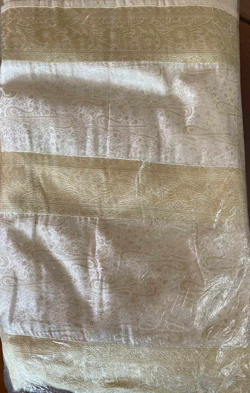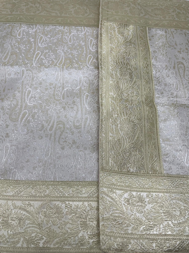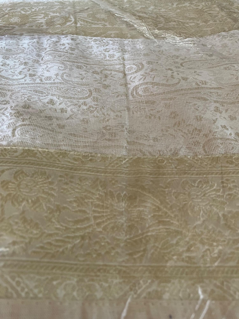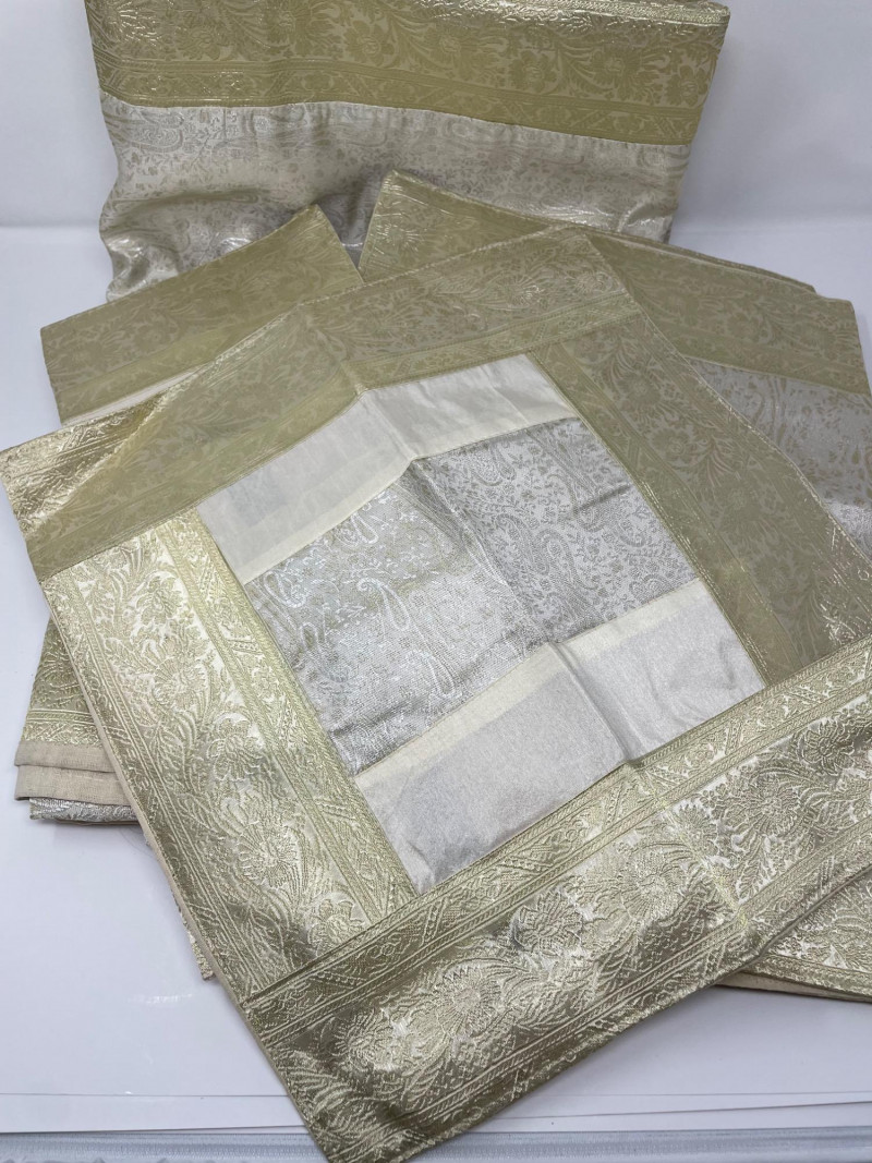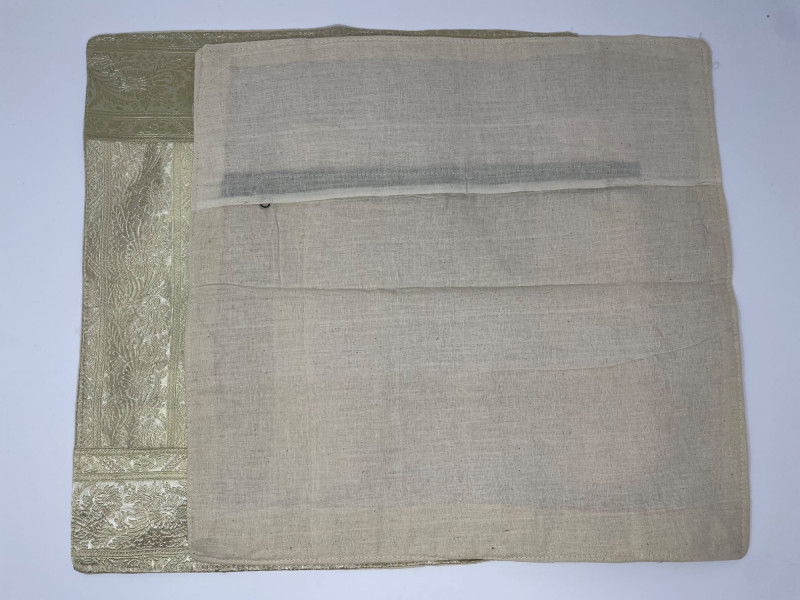 Set of silk woven bed linens in elegant shades of gold and ivory. Bed Cover 102” x 86” Pillow Shams 26” x 18” (qty 2) Pillow Cover 16 3/4” x 16” (qty 2)Visual Details
