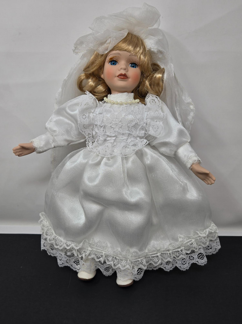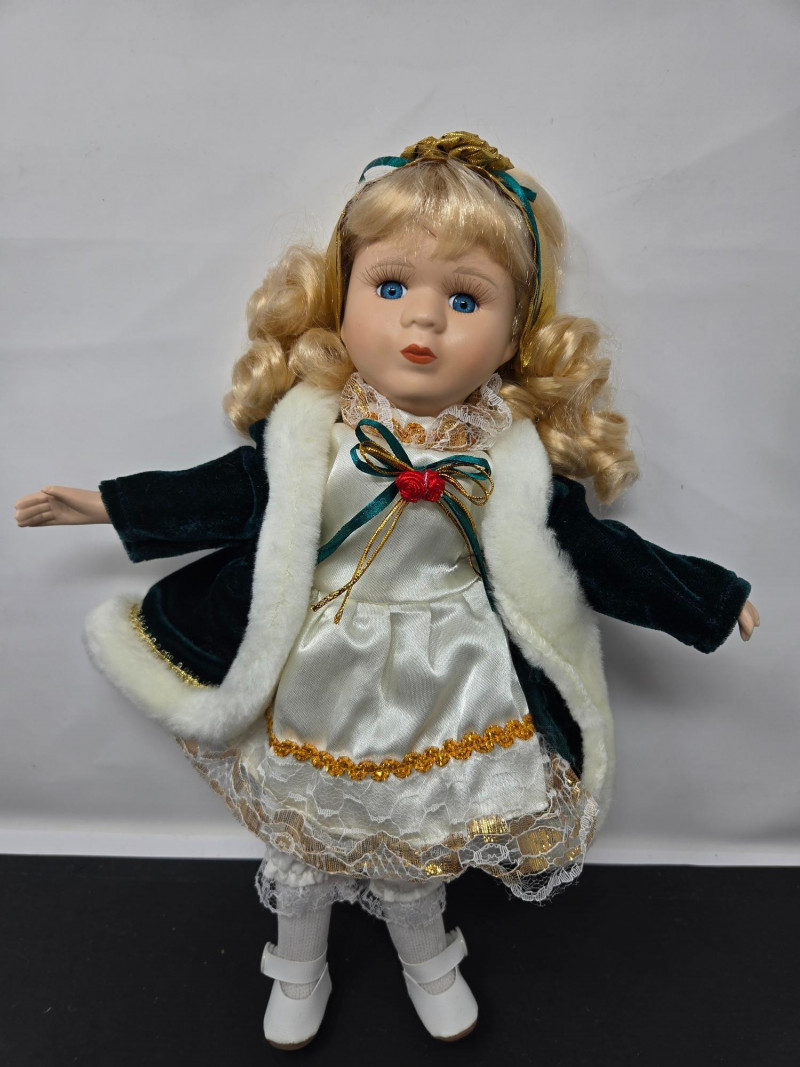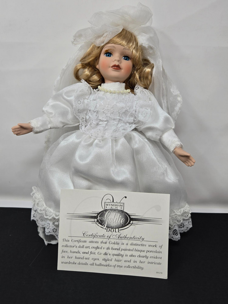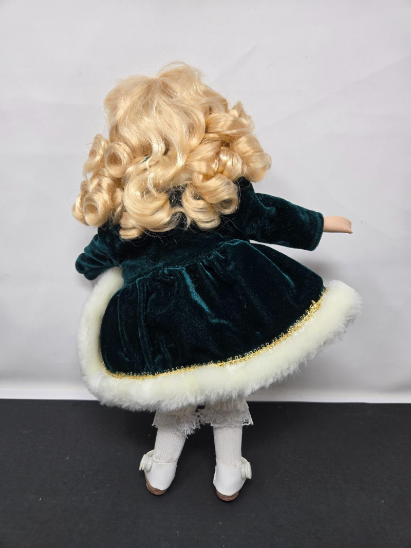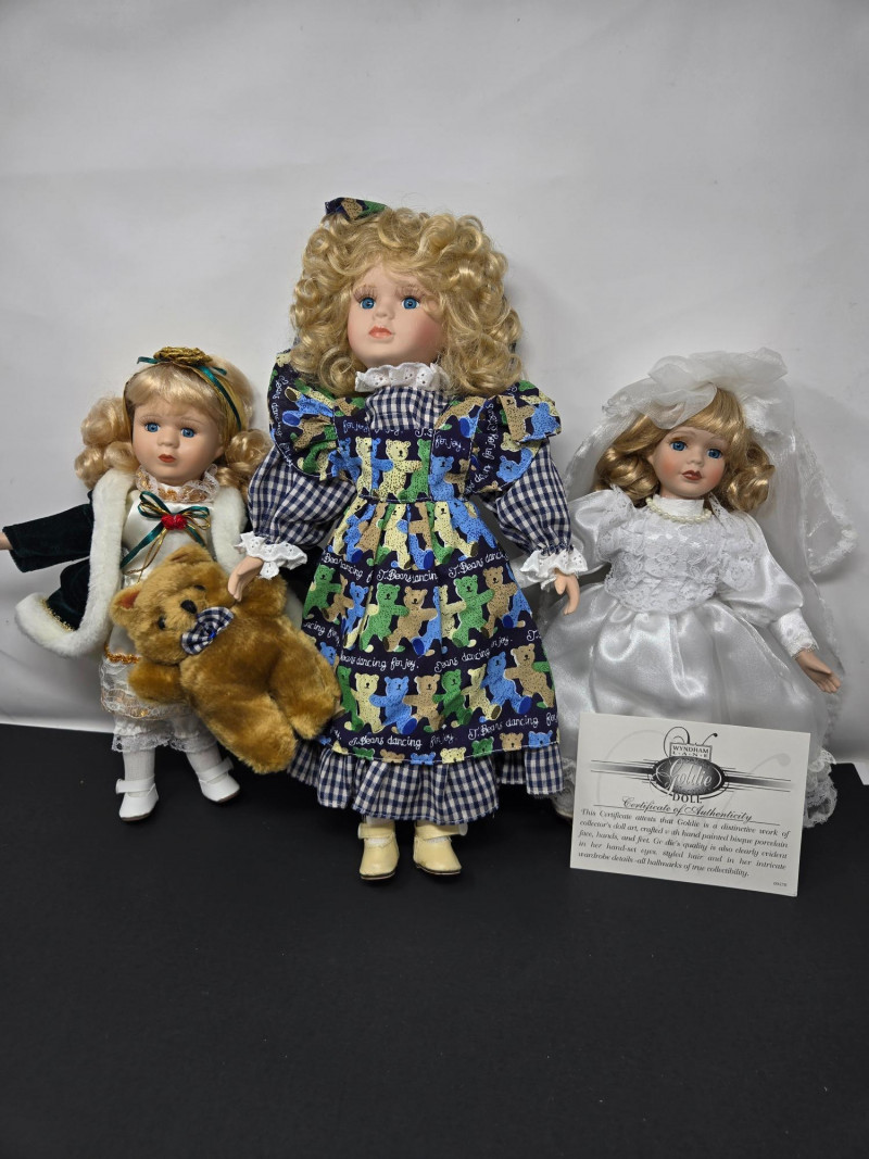 Three porcelain collector dolls, each dressed in distinctive themed outfits, along with a certificate of authenticity. Christmas Doll (Left): Golden Locks Doll (Center): Wedding Doll (Right):