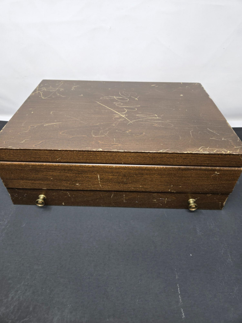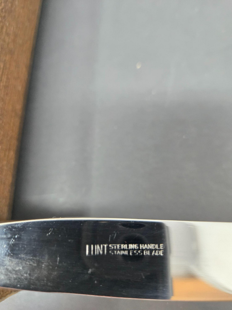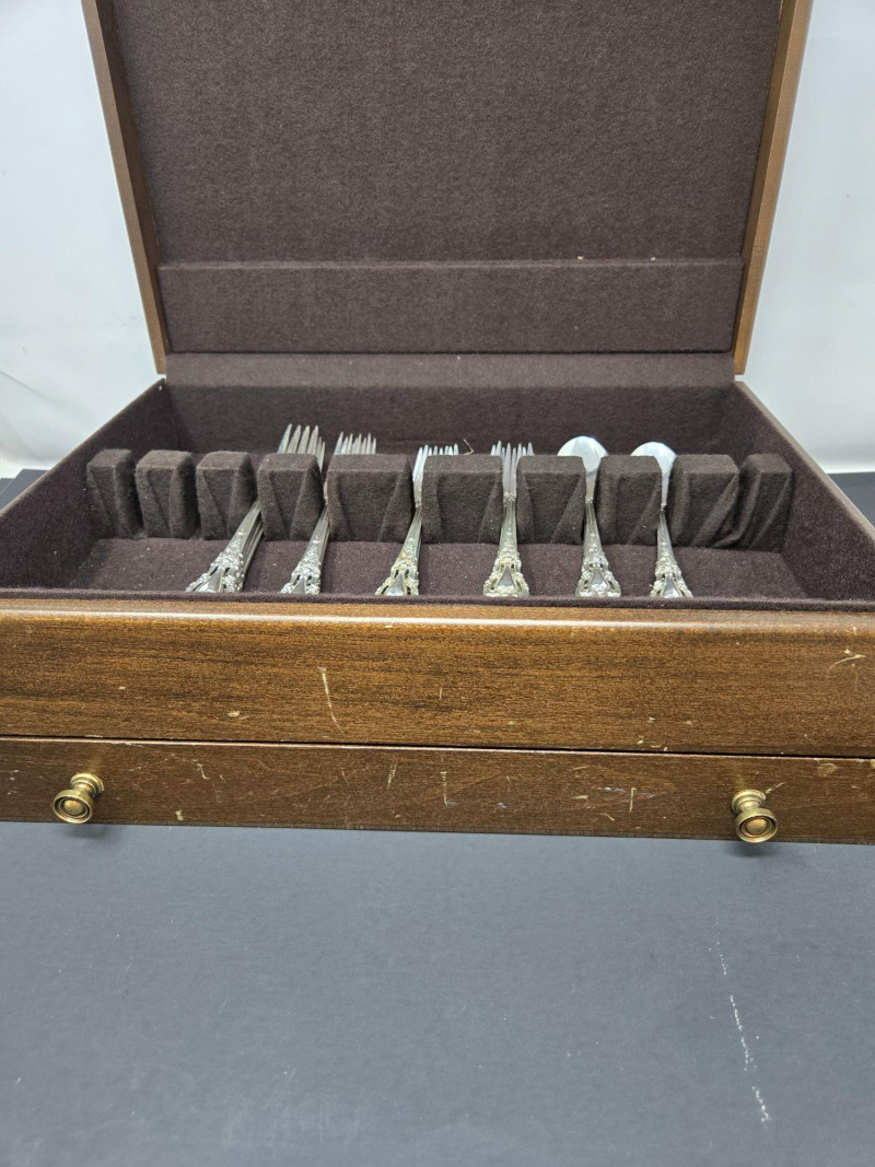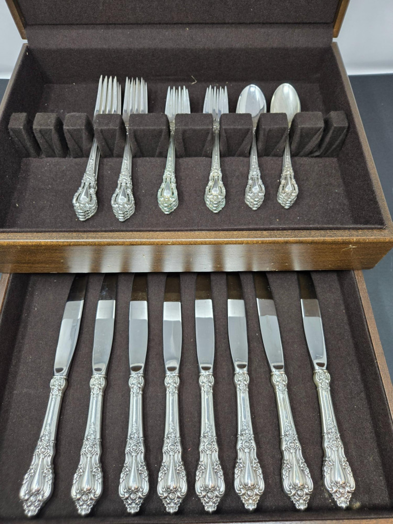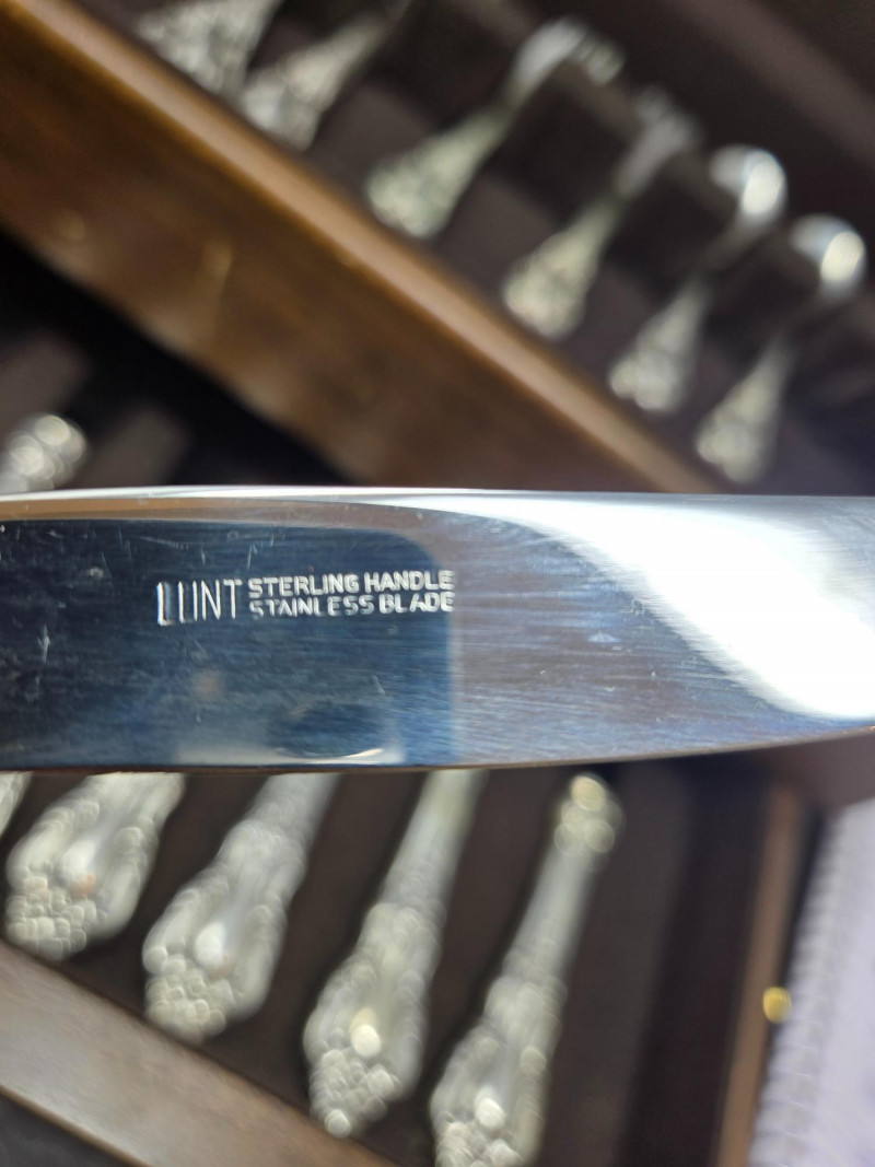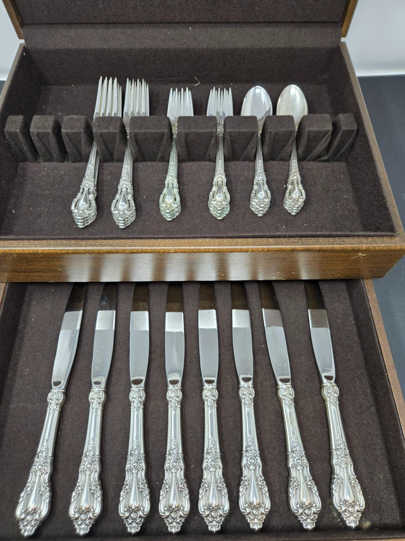 32-piece Lunt sterling silverware set displayed inside a fitted wooden storage chest with a dark felt lining. 8 x Knife 28g (STAINLESS STEEL BLADE), 8 x Dinner Fork 48g, 8 x Salad fork 42.14g, 8 x Spoon 34g Approx total 1,217.12 gram