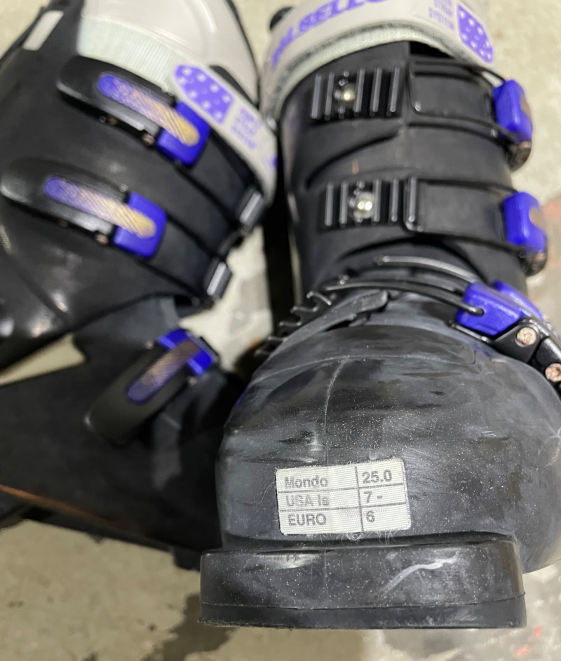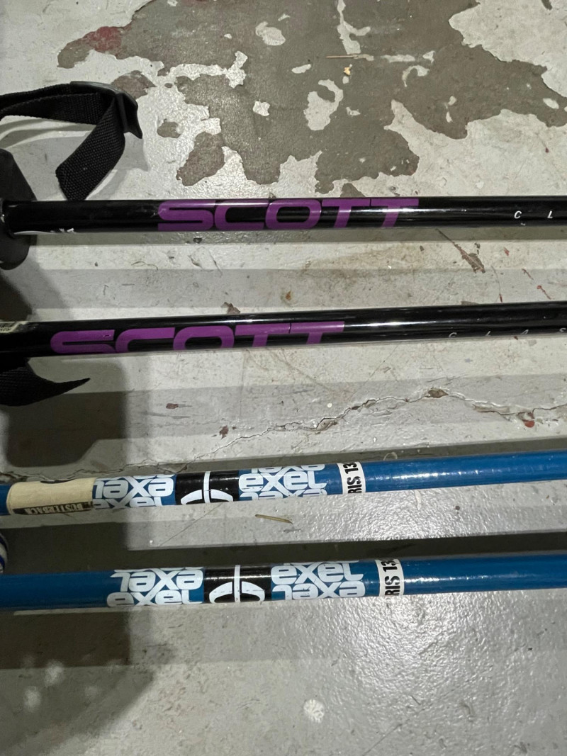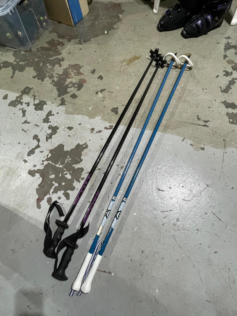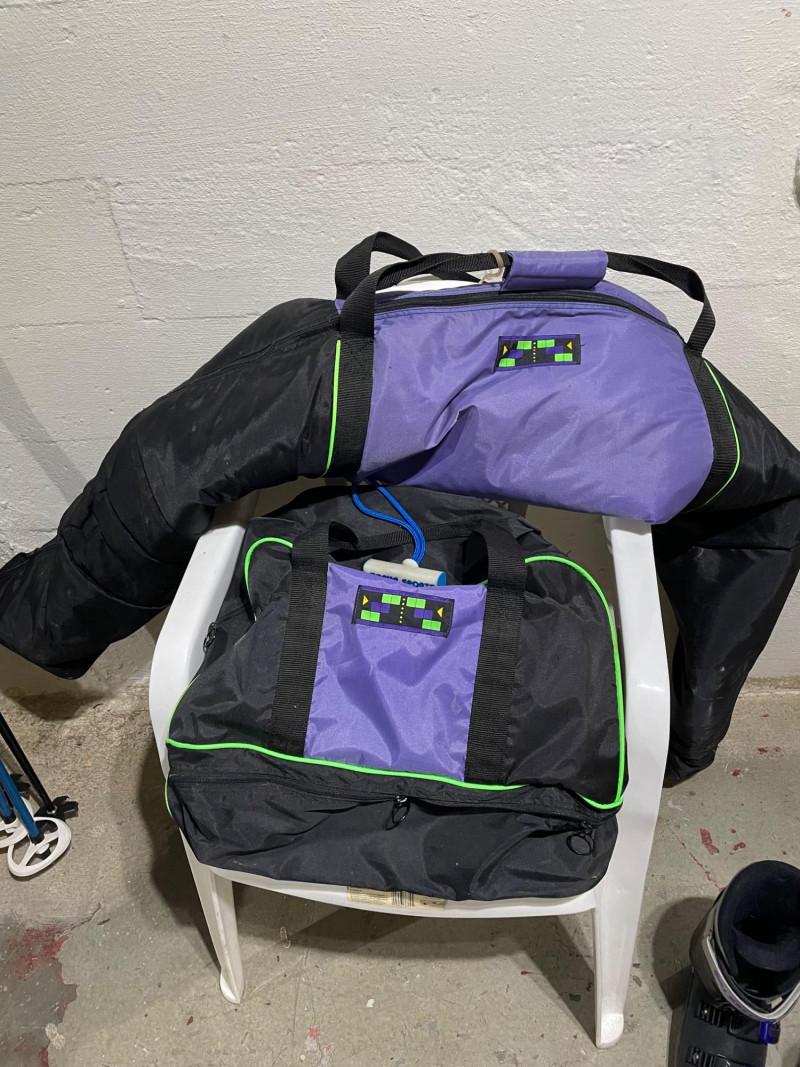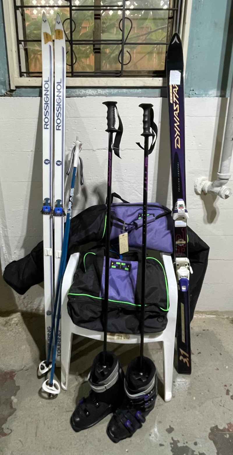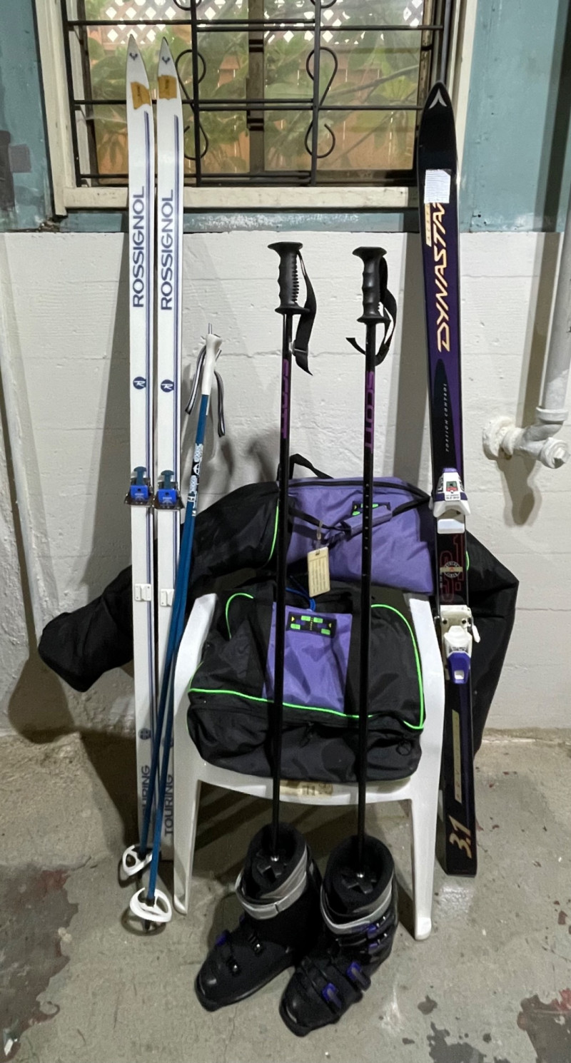 Two complete ski sets with boots and poles, arranged on a white chair against a wall. Skis: Poles: Boots: Bag: This looks like a mixed lot: