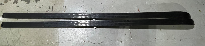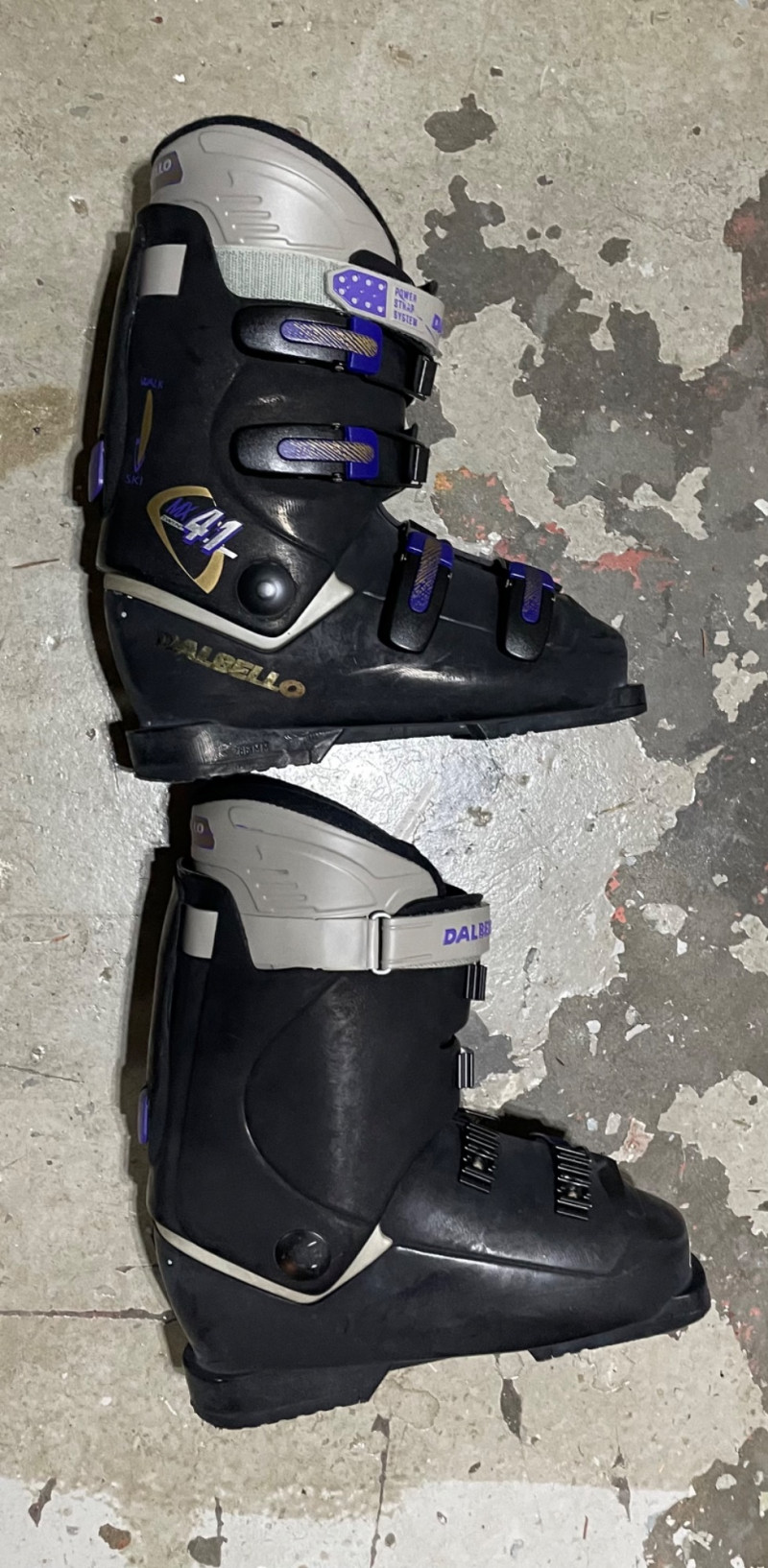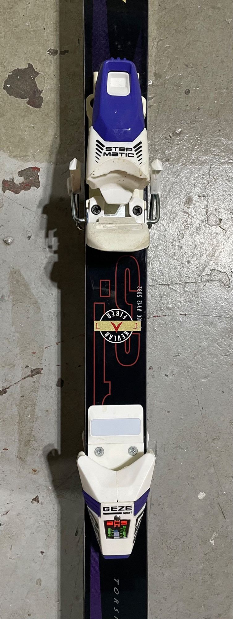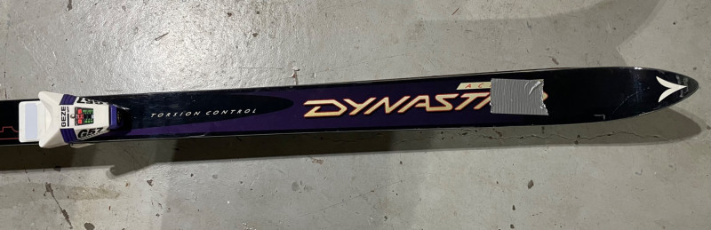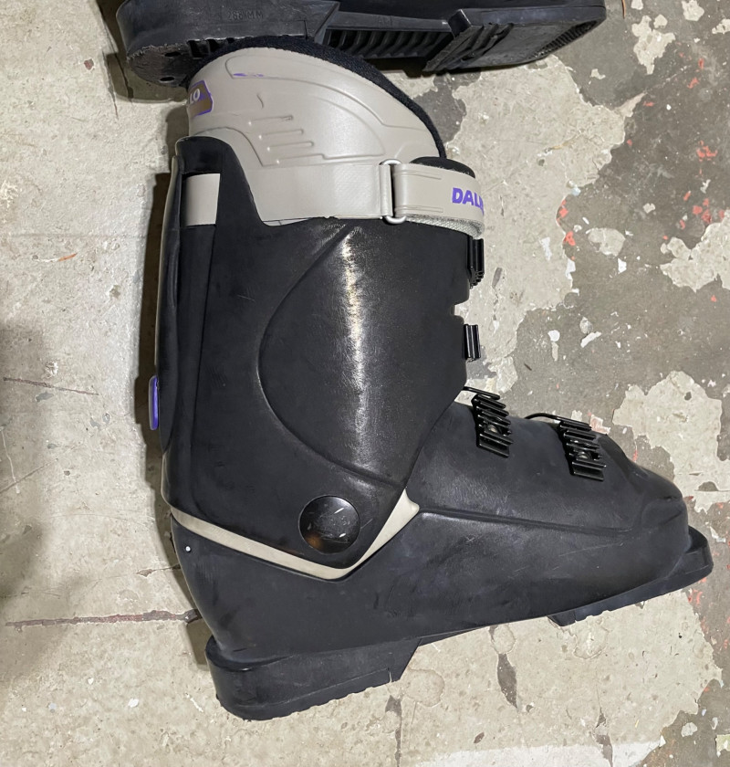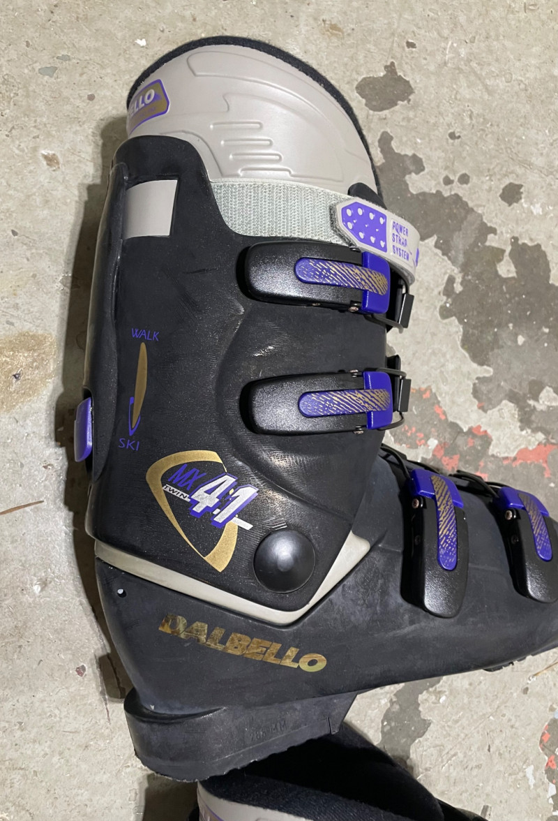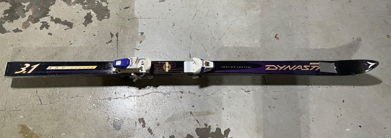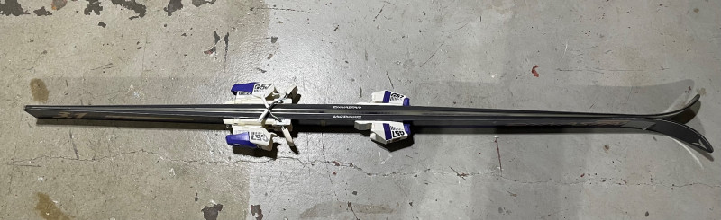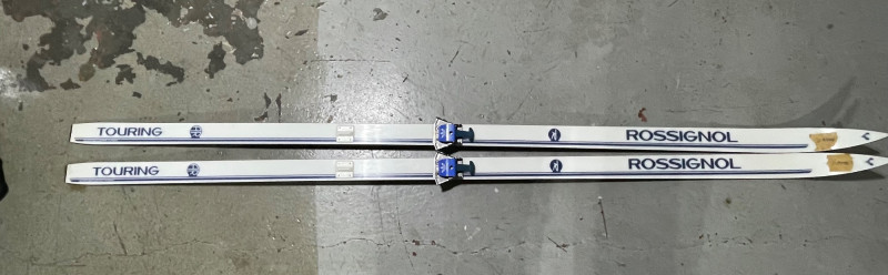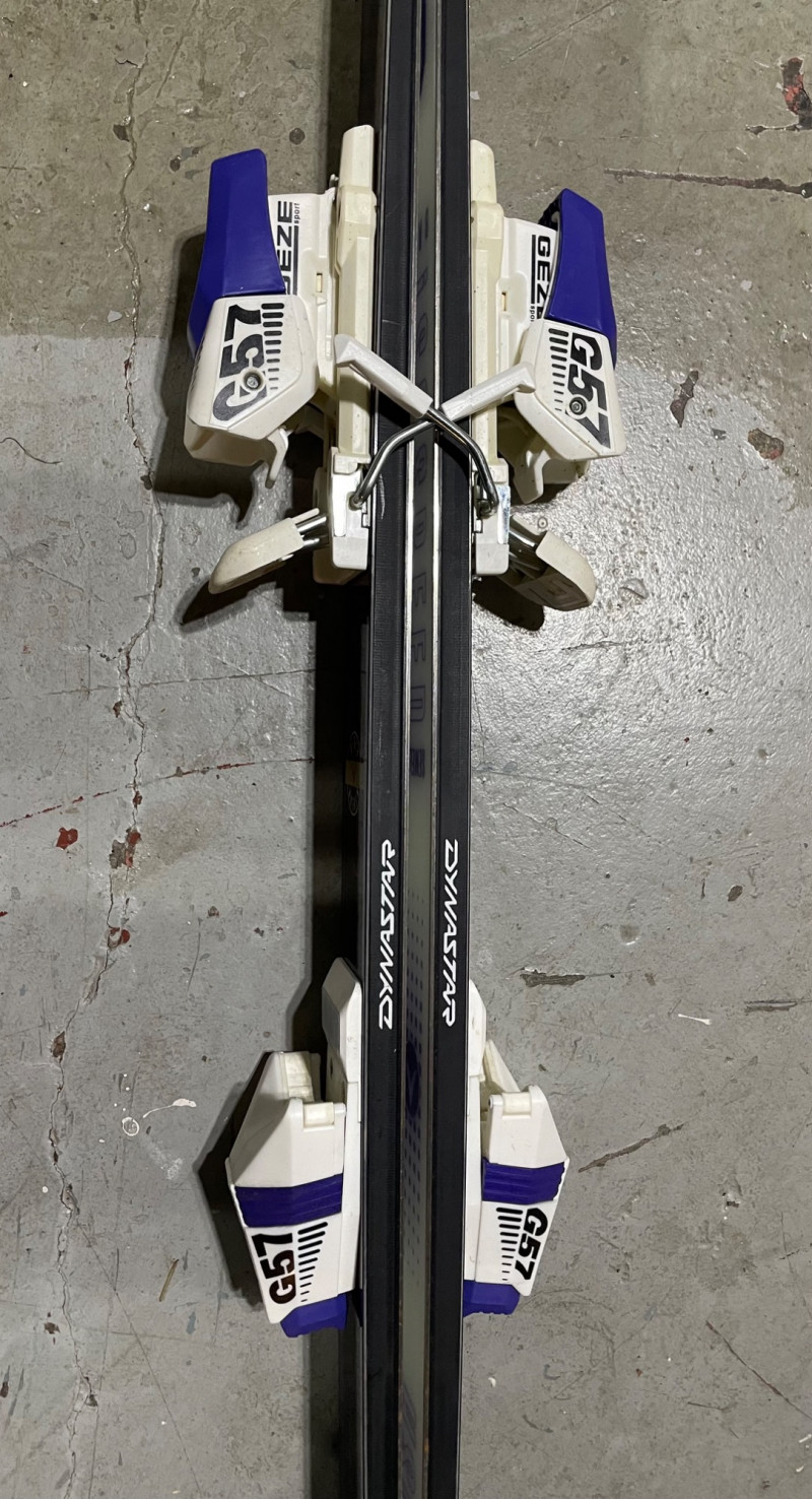 Two complete ski sets with boots and poles, arranged on a white chair against a wall. Skis: Poles: Boots: Bag: This looks like a mixed lot: