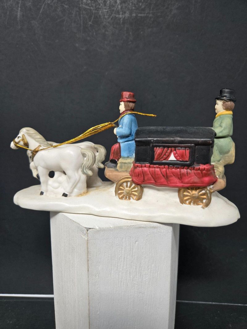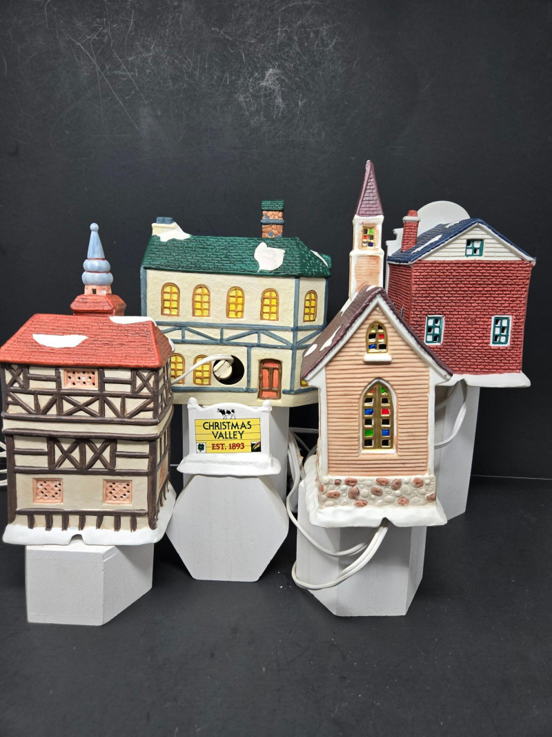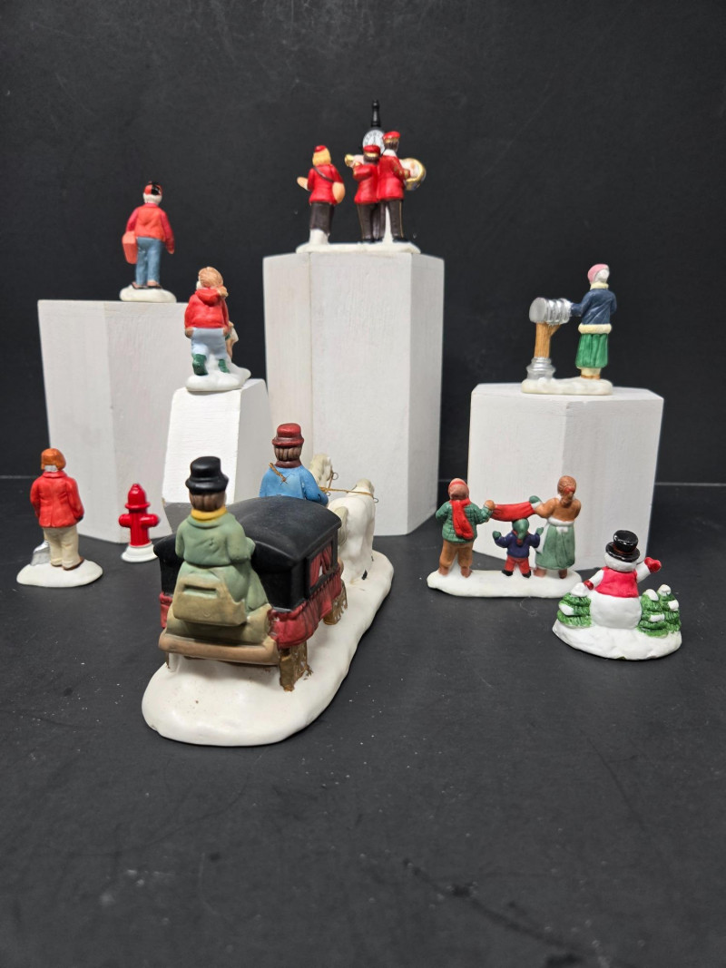 Christmas Village display featuring miniature buildings and figurines arranged on a dark background. Buildings: Figurines & Accessories: Lighting: