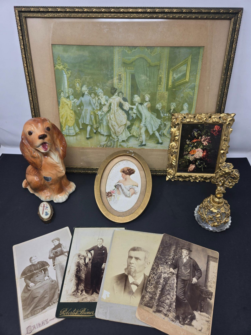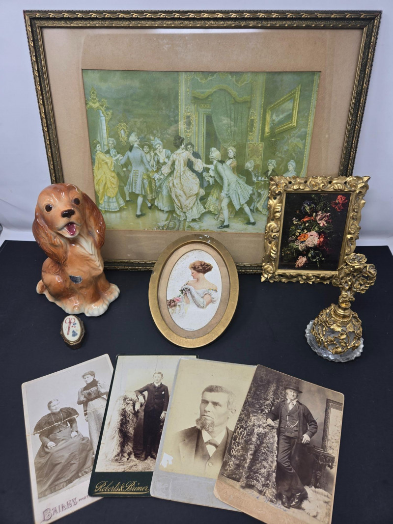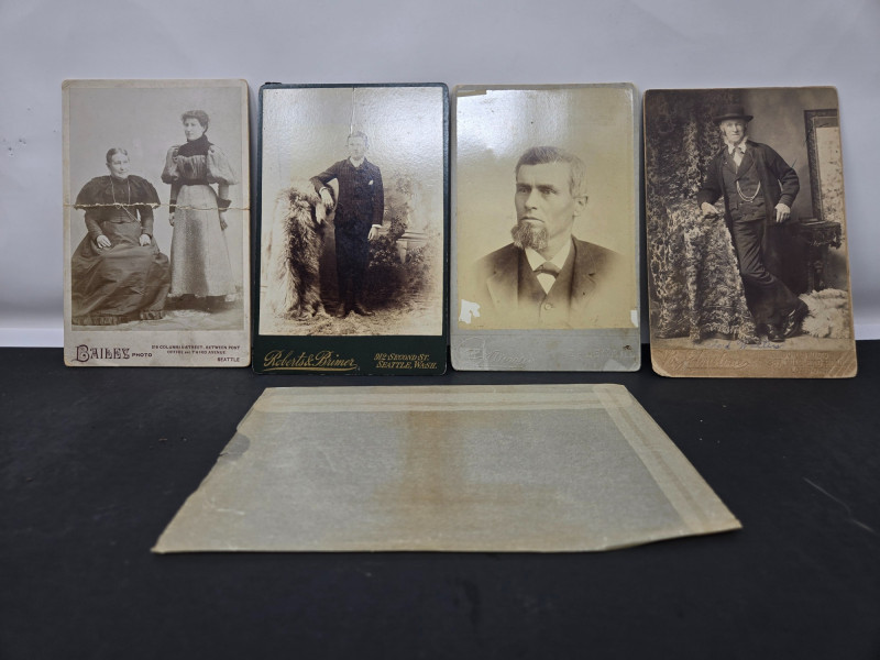 - Several sepia-toned and black-and-white cabinet cards and postcards, showing individuals in formal attire and period settings—classic collectibles for antique enthusiasts.