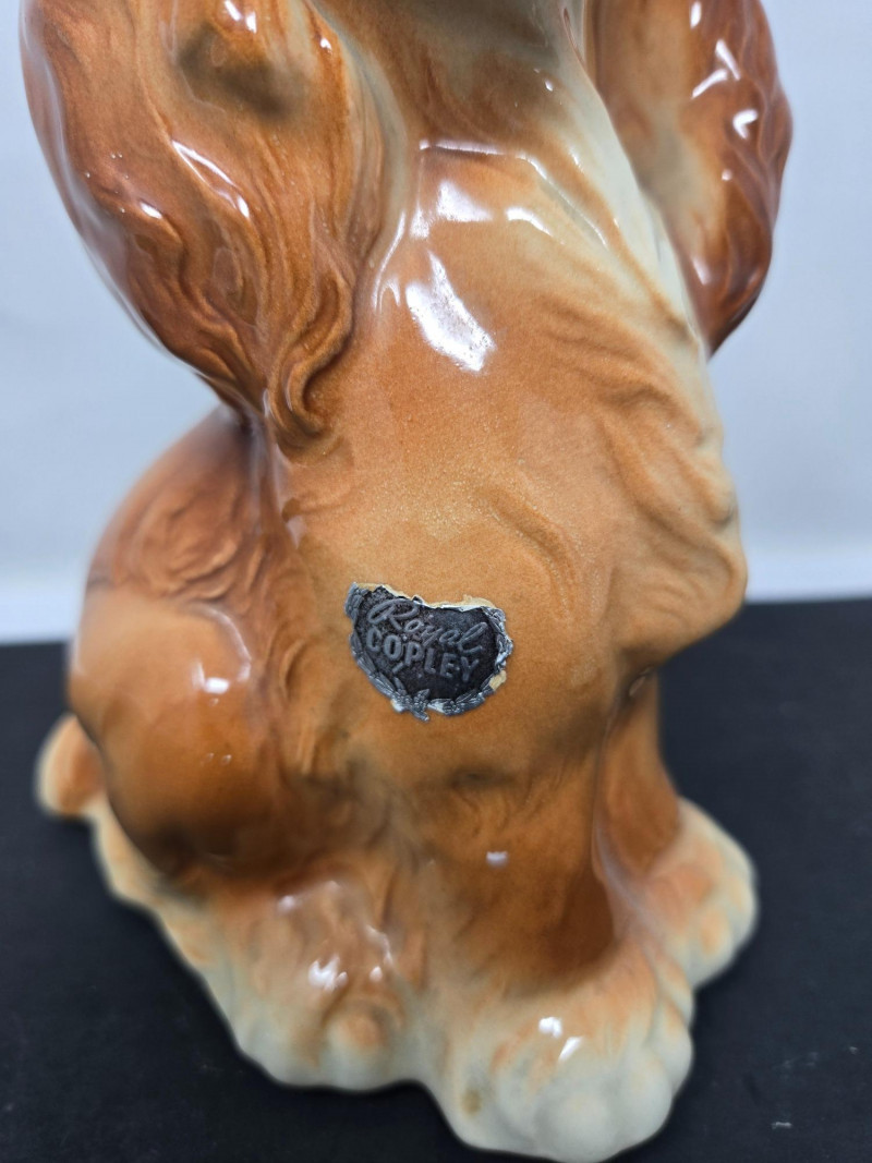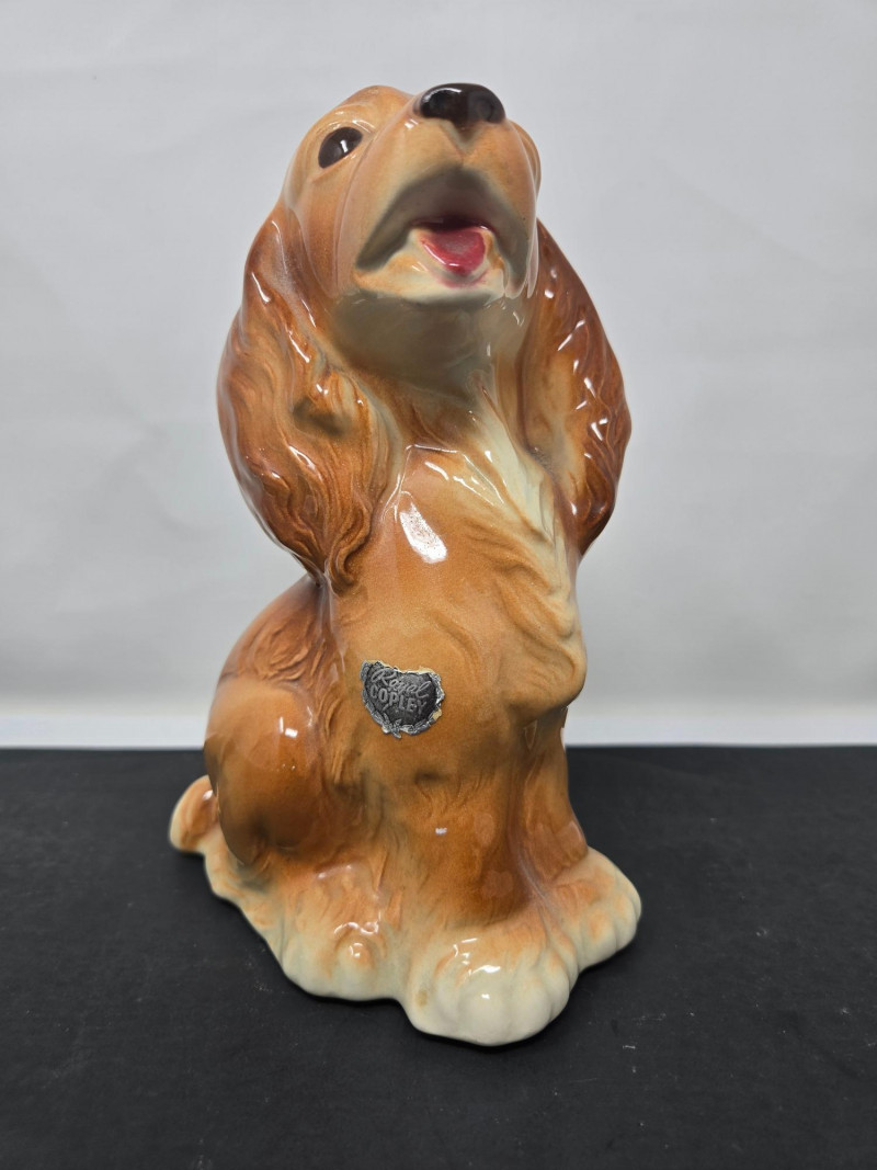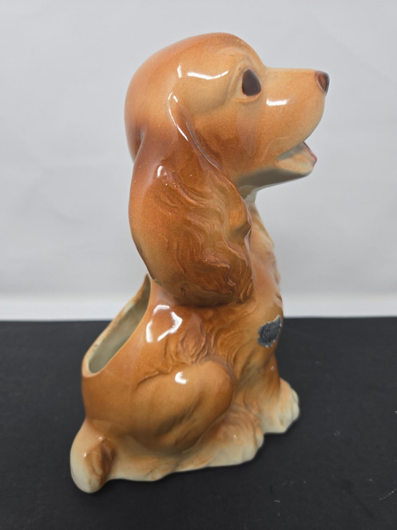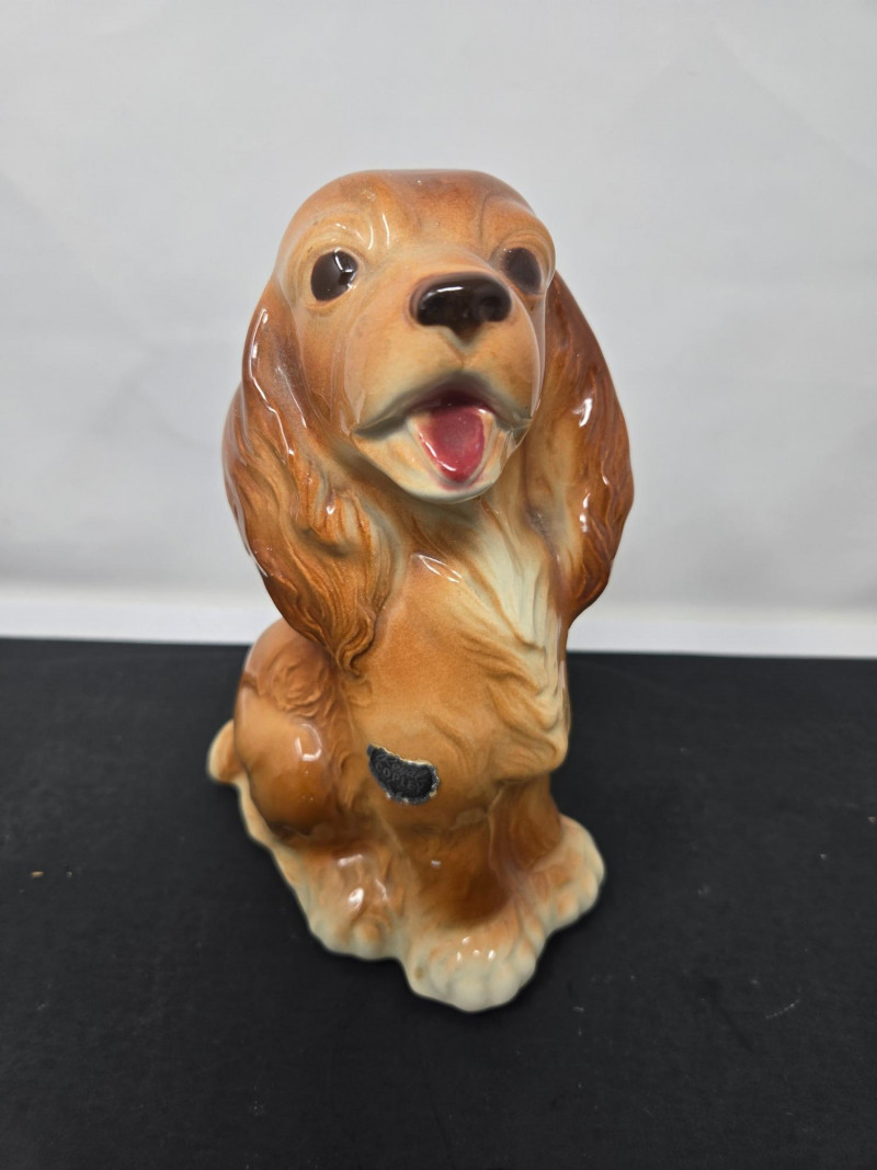 - A glossy, reddish-brown dog sculpture with expressive detailing, typical of mid-20th-century decorative ceramics.