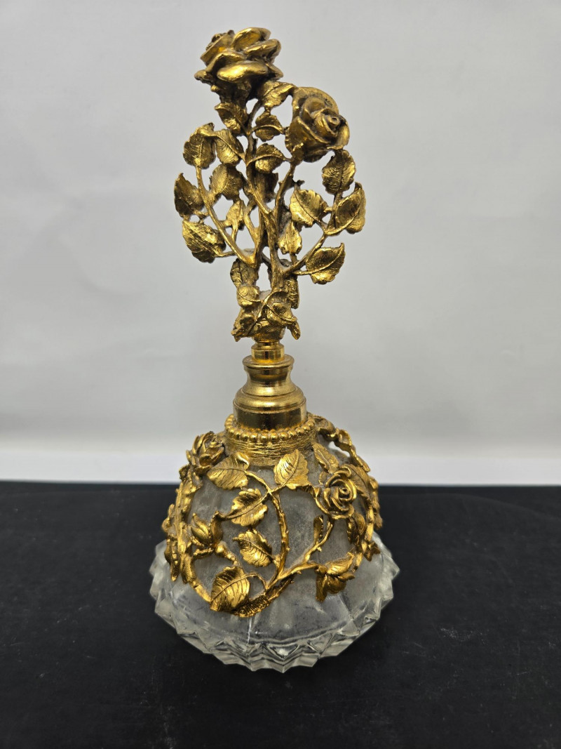 - A highly ornate gold-toned candlestick with intricate floral and scrollwork details, suggesting Baroque or Rococo influence.