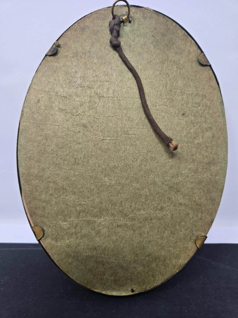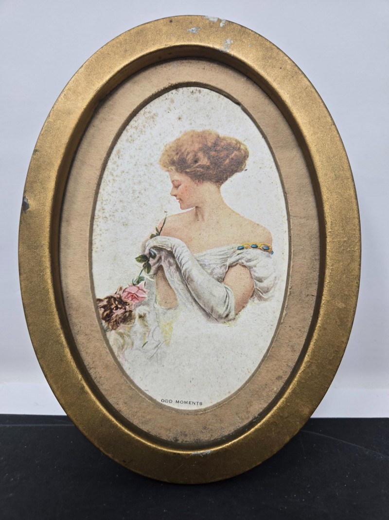 - An oval frame featuring a delicate portrait of a woman in soft pastel tones, evoking Edwardian or Victorian aesthetics.