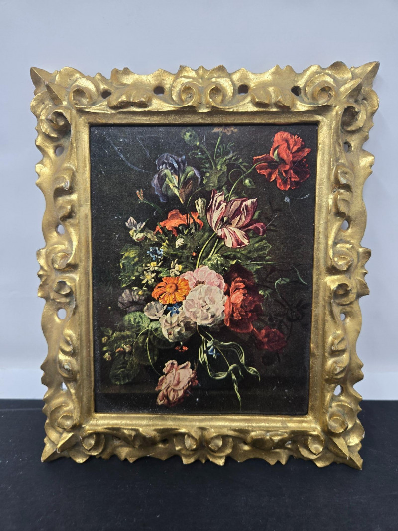 - A smaller ornate gold frame showcasing a floral still-life painting, adding a touch of Victorian opulence.