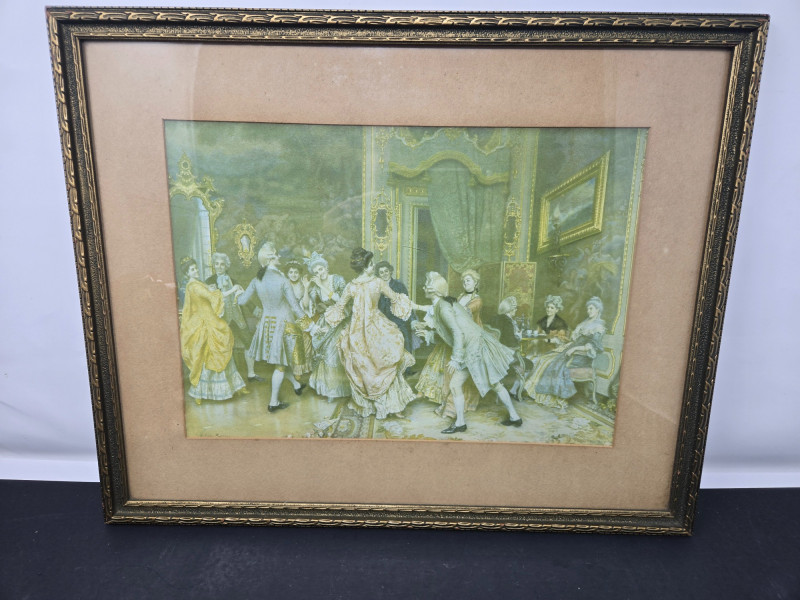 - A large print depicting an elegant ballroom scene with figures in 18th-century attire—powdered wigs, flowing gowns, and ornate interiors.