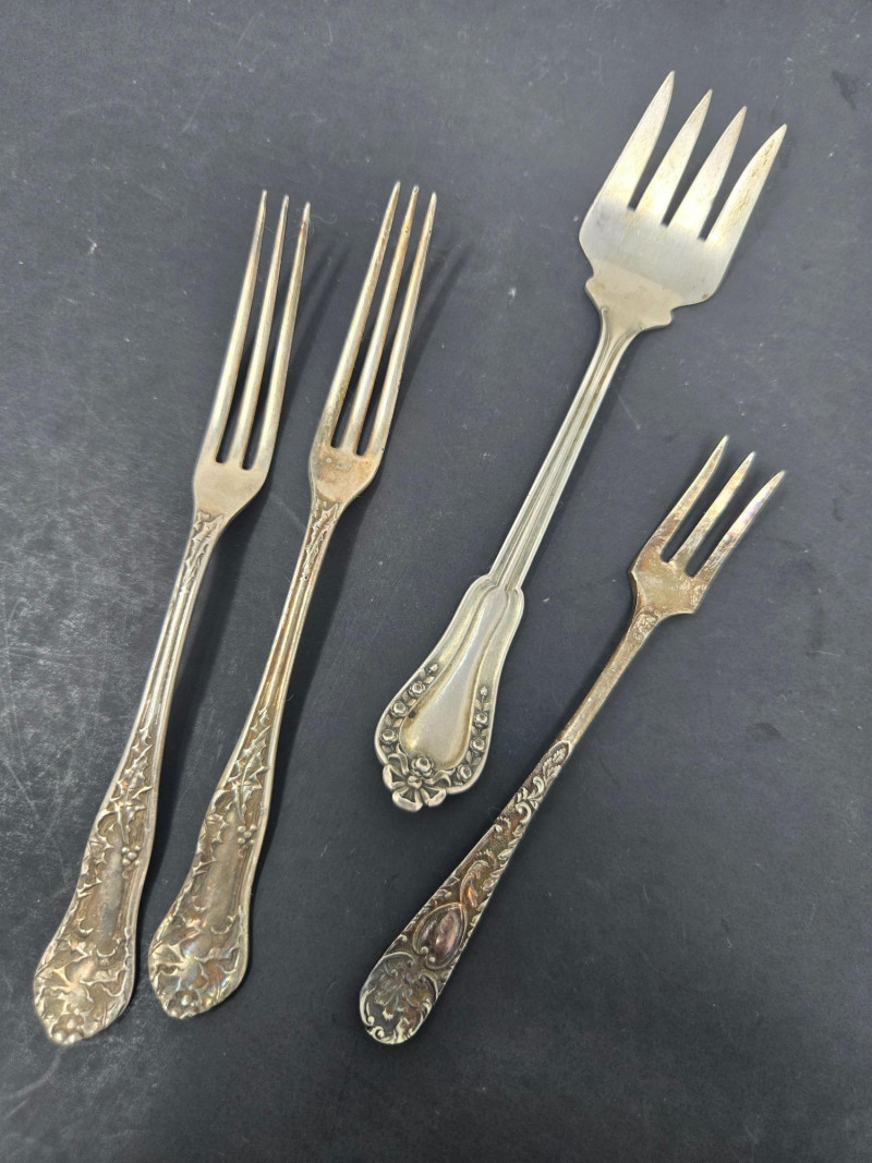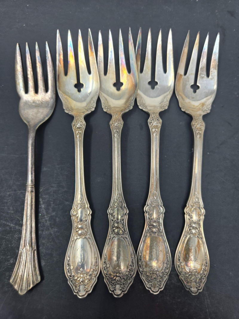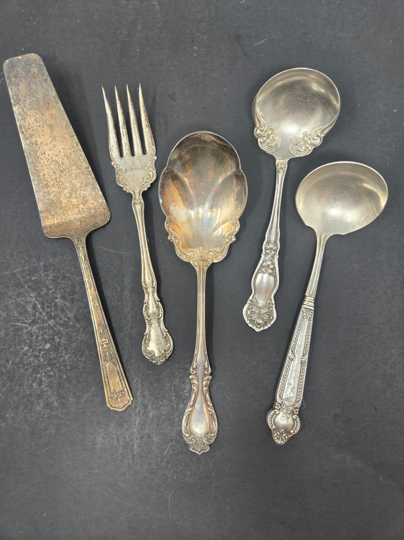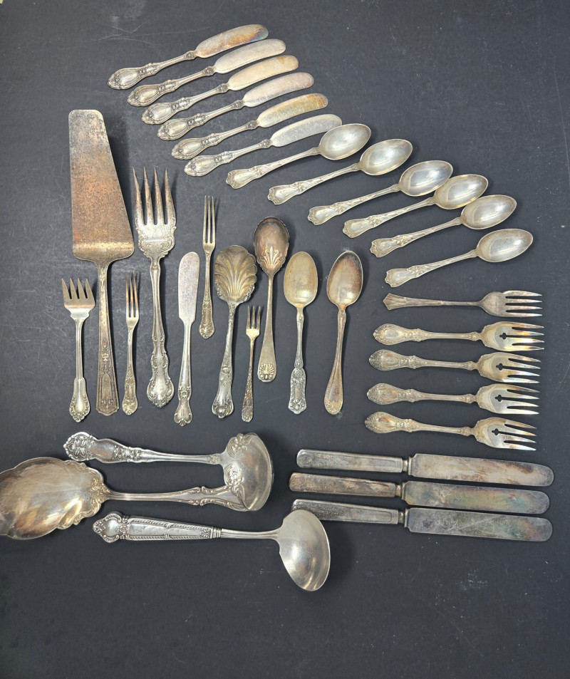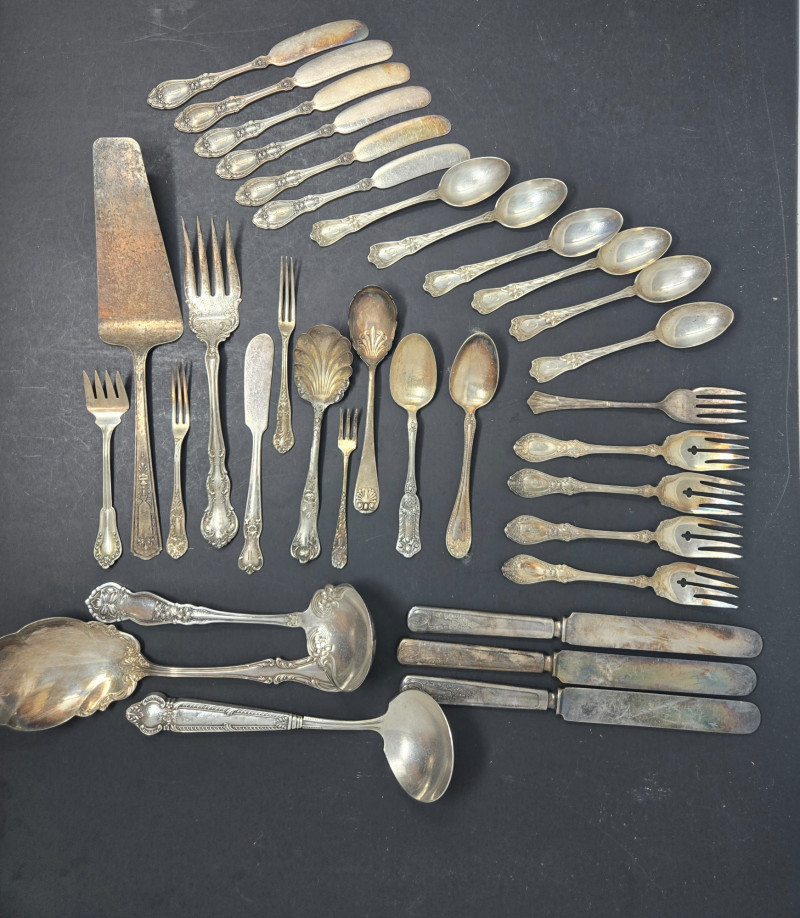 Collection of ornate stainless-steel flatware, likely vintage or antique.Overall Description