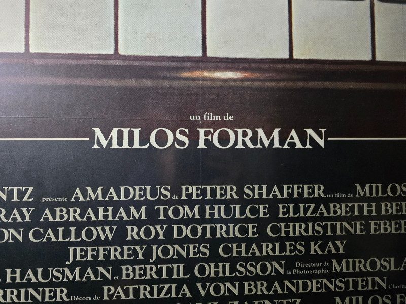 This is your chance to own a truly iconic piece of cinematic history: an original vintage movie poster for Miloš Forman's masterpiece, Amadeus (1984). This visually striking poster captures the essence of the film, showcasing the dramatic and flamboyant image of Wolfgang Amadeus Mozart, as famously portrayed by Tom Hulce, standing proudly at the piano. Summary: A visually stunning original theatrical release poster for Amadeus (1984), Miloš Forman’s Oscar-winning masterpiece. This oversized 62" × 46" print features Tom Hulce as Mozart in a dramatic pose above a piano keyboard, set against a lavish concert hall backdrop. Not a reproduction—this is a genuine vintage promotional piece from the film’s initial release, celebrating its sweep of 8 Academy Awards including Best Picture, Best Director, and Best Actor for F. Murray Abraham. A must-have for collectors of film history, classical music ephemera, or 1980s design. Film Title: Amadeus (1984) Director: Miloš Forman Production: Saul Zaentz Company Material: Printed poster stock Dimensions: 62" L × 46" W Design Features: Central image of Mozart above piano keys Candlelit concert hall background Title and credits in elegant serif font Era: Original 1984 release Condition: Excellent vintage; no major flaws noted About the Film: Amadeus swept the 1985 Academy Awards, winning an impressive 8 Oscars, including Best Picture, Best Director, and Best Actor for F. Murray Abraham's portrayal of Salieri. It tells the compelling, albeit fictionalized, story of the rivalry between the prodigious Mozart and the envious court composer Antonio Salieri, delving into themes of genius, ambition, and divine talent. This is an original release movie poster from 1984, not a modern reproduction.Item Details