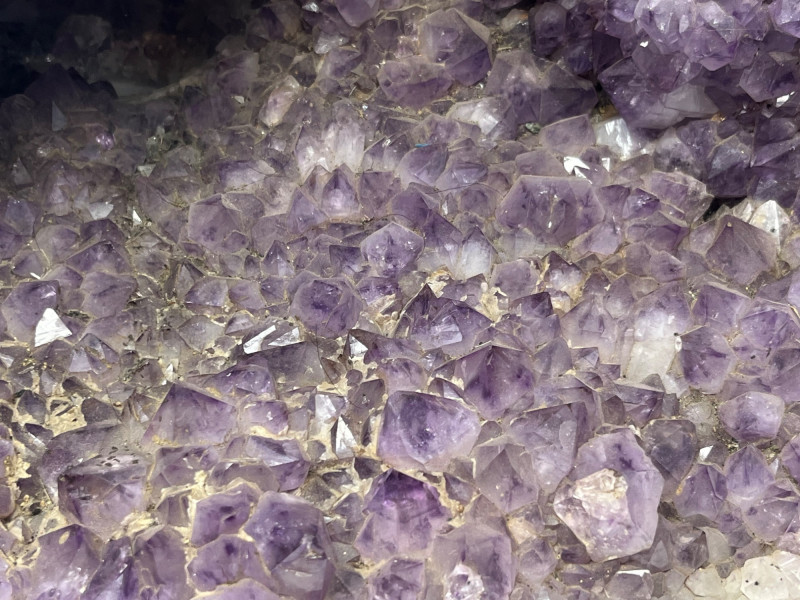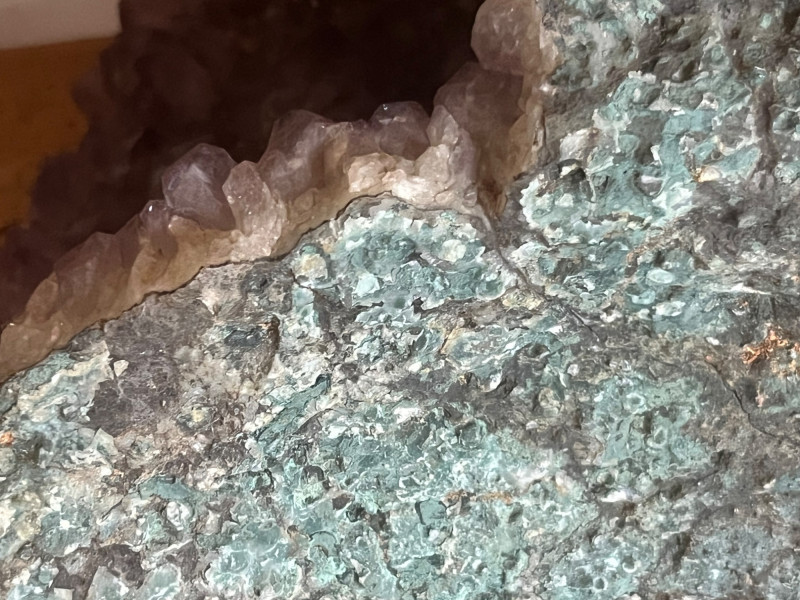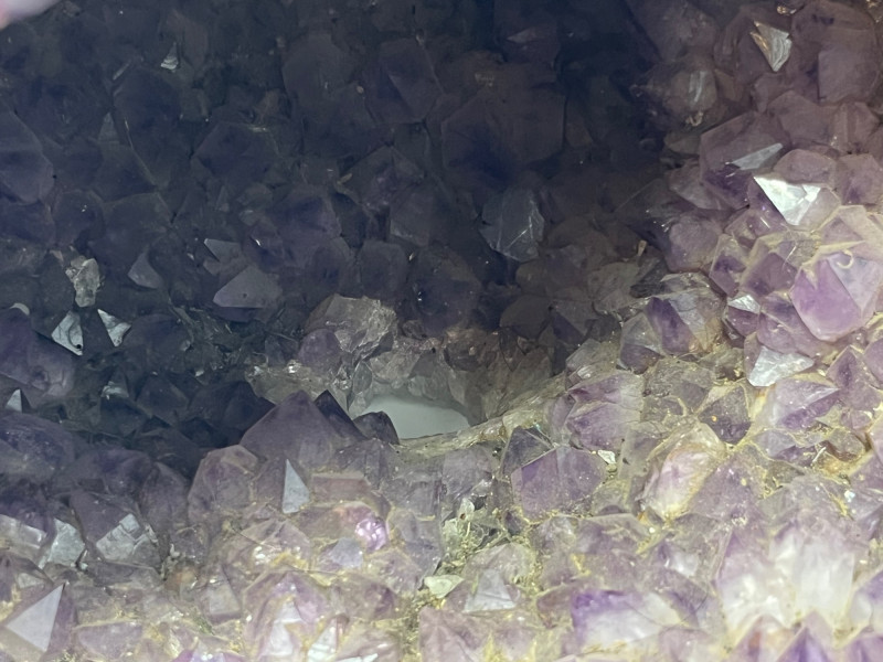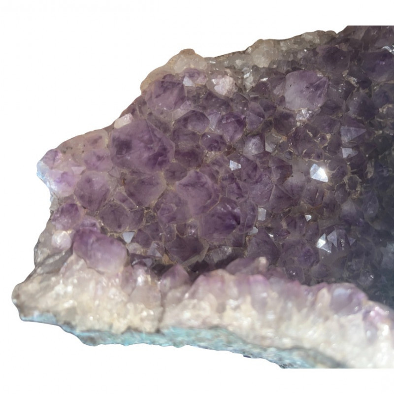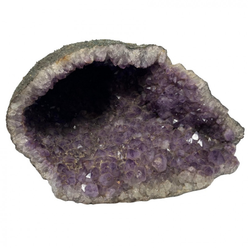 Prepare to be mesmerized by this stunning natural Amethyst Geode, a true testament to Earth's artistic power. This captivating specimen boasts a magnificent hollow cavity, intricately lined with a dazzling array of deep purple amethyst crystals that shimmer and sparkle with every shift of light. Exceptional Deep Purple Hue: Experience the rich, vibrant shades of violet that make this amethyst a collector's dream, indicative of high quality and natural formation. Sparkling Crystal Formations: The geode's interior reveals countless perfectly formed, pointed amethyst crystal tips that create a breathtaking "crystal cave" effect. Unique Display Piece: With its impressive size and natural cut base, this geode stands proudly as a striking centerpiece, showcasing the raw beauty of the mineral kingdom. Weight: 37 lbs 15 oz Condition: Small hole in the geode, likely intentionally cut for some practical or decorative purpose. Some surface cracks on the outer rock, but none to destabilize the piece.