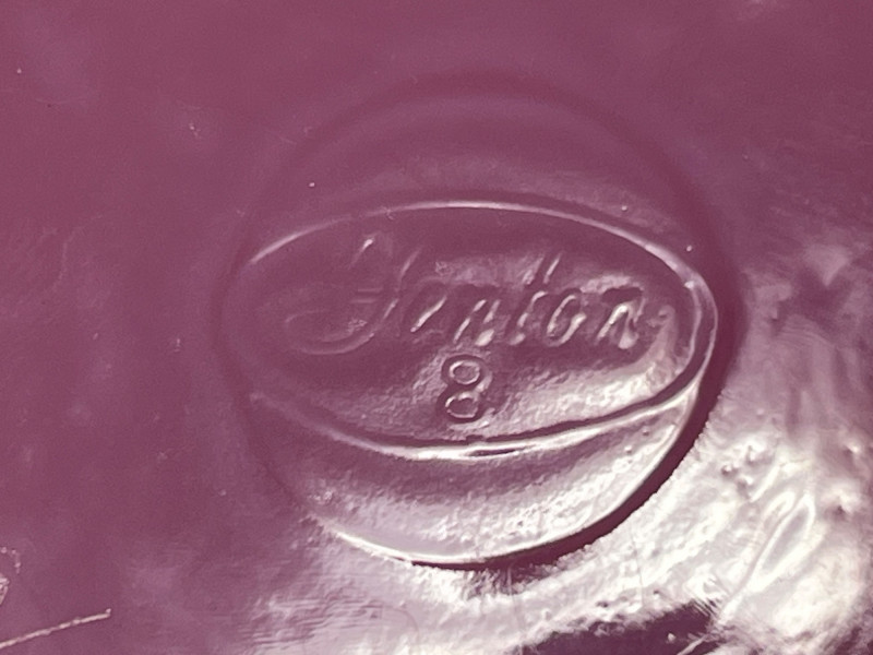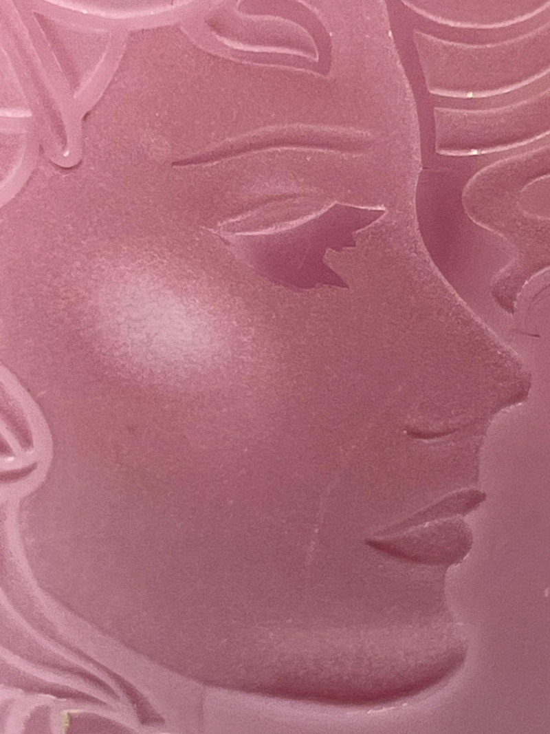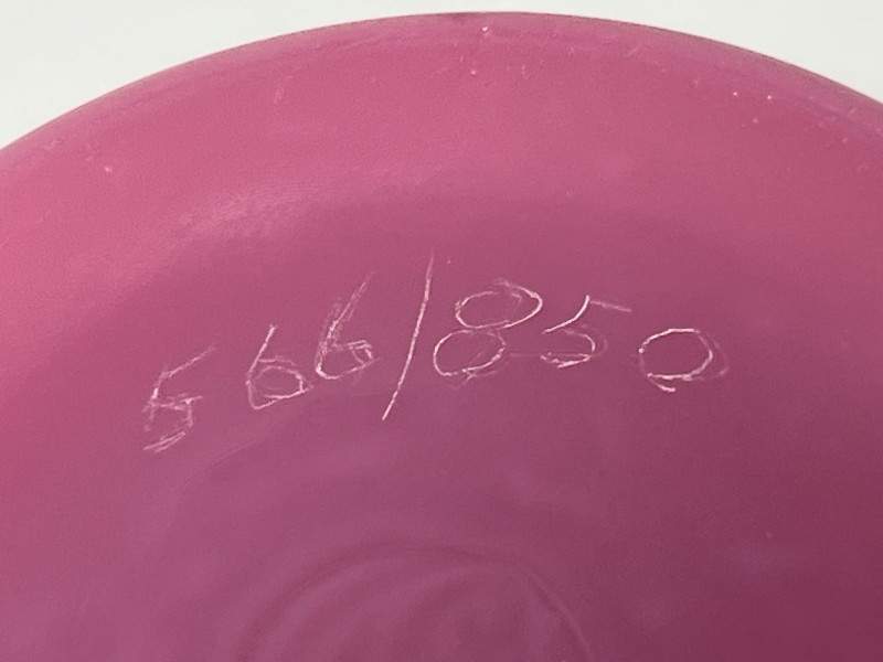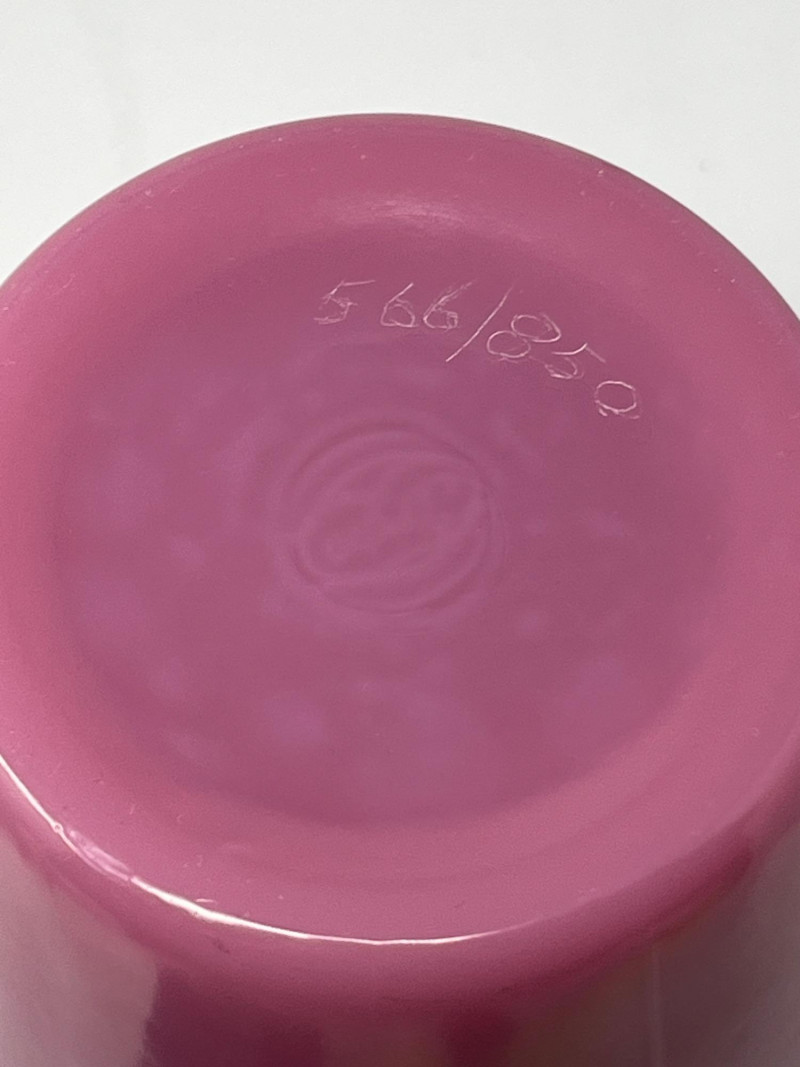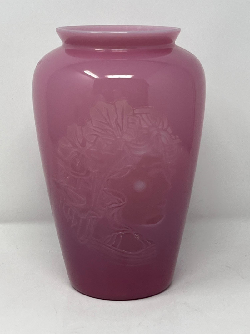 Summary: A rare and elegant Fenton Art Glass vase from the inaugural 1983 Connoisseur Collection, crafted in rose quartz glass and featuring a sand-carved classical profile—likely Bacchus or a nature deity—adorned with grape leaves. This 9" × 6" vase was part of a limited edition of 1,500 pieces, each showcasing Fenton’s mastery of cameo-style carving and subtle opalescent finishes. A standout for collectors of American studio glass or classical revival motifs. Maker: Fenton Art Glass Company Collection: Connoisseur Collection (first year, 1983) Material: Rose quartz glass, sand-carved Design: Embossed classical profile with grapevine motif Dimensions: 9" H × 6" W Edition: Limited to 1,500 pieces Condition: Excellent; no chips, cracks, or repairs notedItem Details