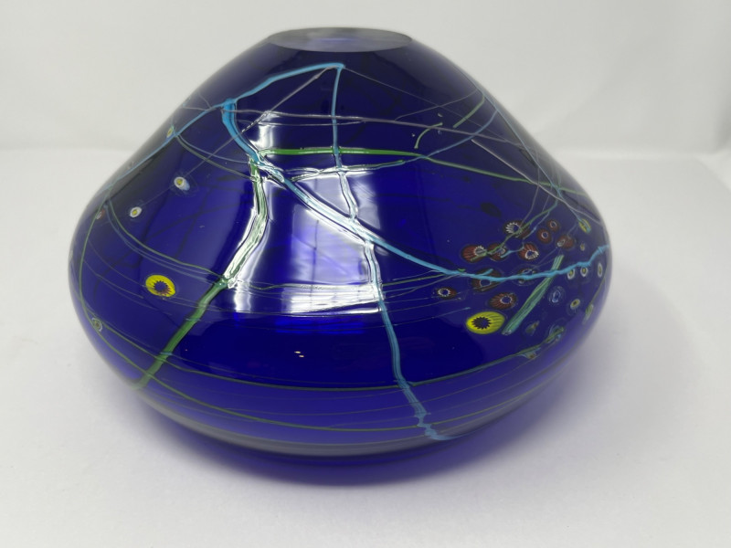 Summary:A striking hand-blown art glass bowl in rich cobalt blue, featuring a decorative band of millefiori canes and swirling lines in yellow, green, and white. The top half of the bowl is subtly ribbed, while the lower half showcases vibrant mosaic-like patterns. With a smooth, polished finish and a rounded form tapering to a flattened base, this piece evokes classic Murano artistry and mid-century studio glass aesthetics. A bold centerpiece or collector’s accent. Maker: Unmarked; Murano-style artisan glass Material: Hand-blown glass Color Palette: Cobalt blue with multicolor millefiori and swirl accents Dimensions: 11" L × 7" W Design Features: Millefiori cane banding Swirling linework in yellow, green, and white Ribbed upper half, mosaic lower half Flattened base for stability Era: Likely mid- to late 20th century Condition: Excellent vintage; no chips, cracks, or repairs notedItem Details