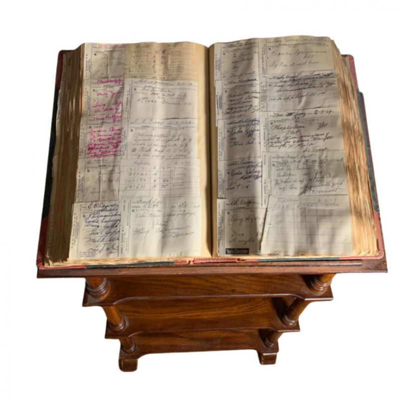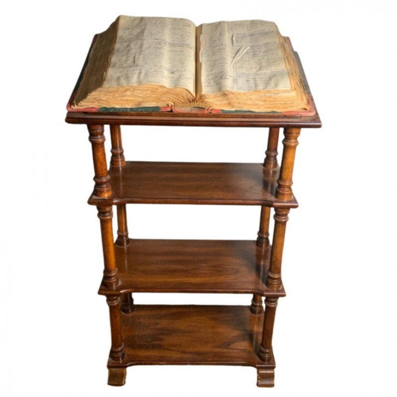 This item is in good antique condition, with the wear and patina expected of a piece of this age. The whatnot has a classic, timeless appeal, and the accompanying ledger book shows signs of age and use, which only add to its historical character and value.